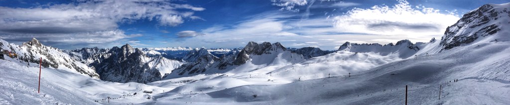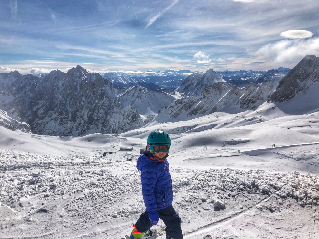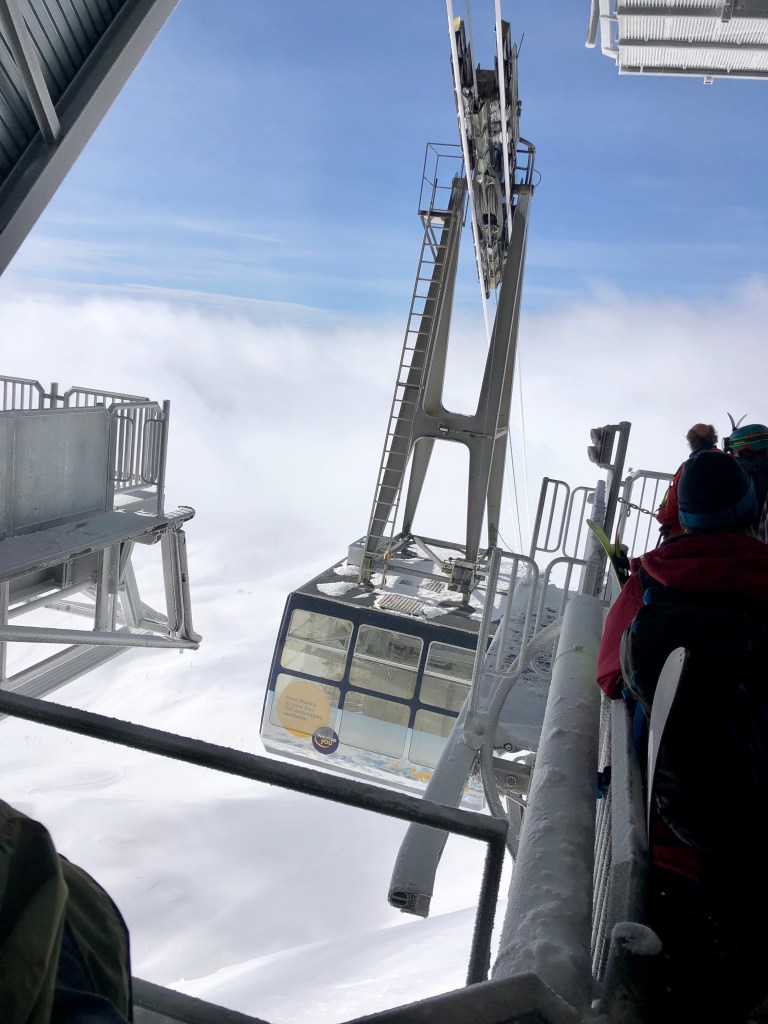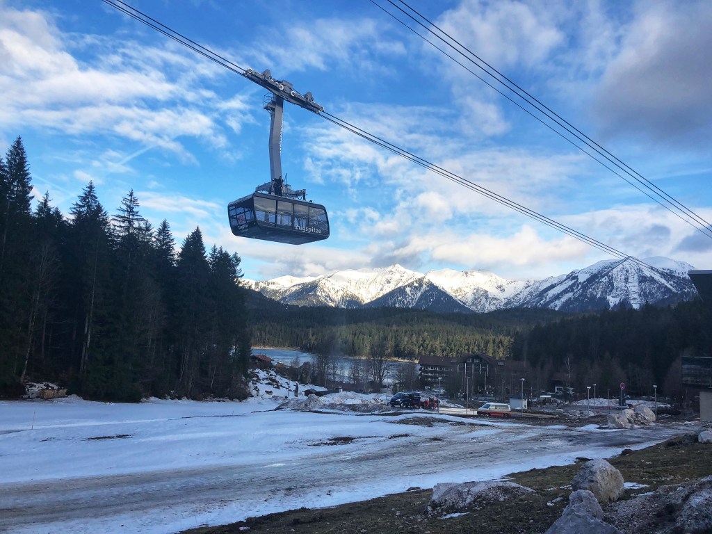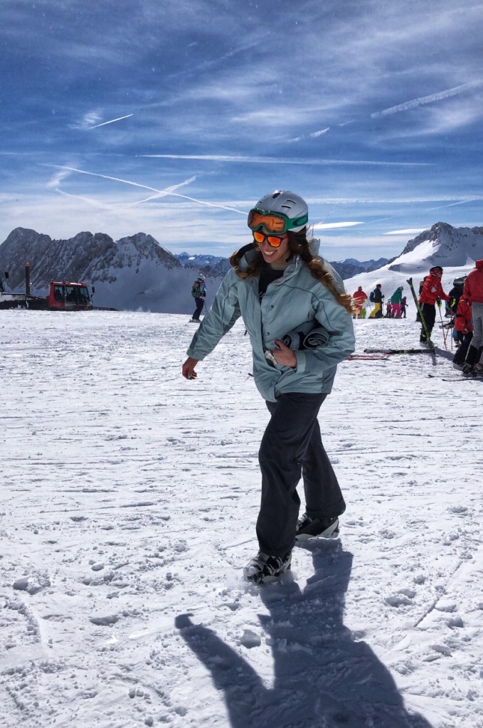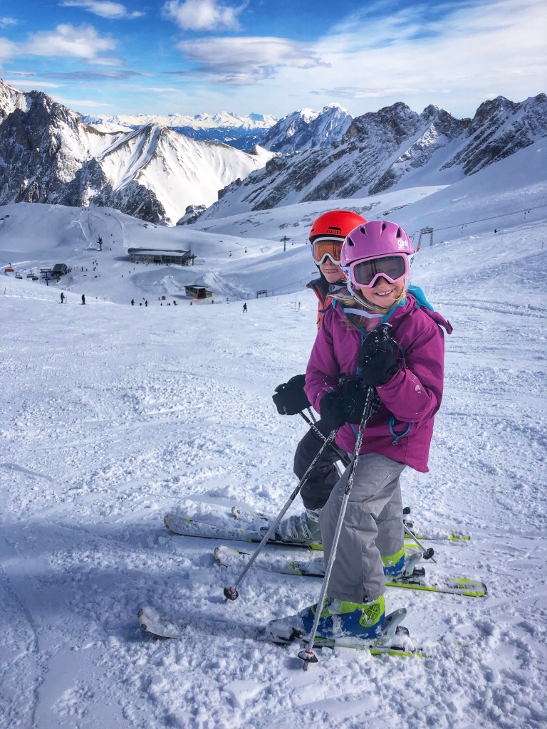 Saturday was the exact opposite of Friday weather-wise, so we were VERY excited to make our way to the infamous Zugspitze! After yesterday’s dumping of snow, we knew the conditions were promising. There are several ways to get to the Zugspitze ski area – via the train or two gondolas, one in Germany and one in Austria. We decided to take the brand new, world-record breaking Seilbahn Zugspitze gondola up the Germany side from Eibsee. Parking was fairly easy, and since we got there early, the wait times weren’t too bad. The Zugspitzbahn (cable car) is the longest free span in a cable car at 3,213 meters (over 10,000 ft!). It can hold 120 people at a time so the gondola itself is huge, and we were amazed at how fast and smooth it was, too! Once you reach the top, you’re at the highest elevation in Germany at 2,962m (9,718′) above sea level. From there you have to take an additional cable car down the hill to the ski bowl, which is basically a giant glacier. We all exclaimed how impressive it was to start above the clouds and descend into the ski bowl where not a single tree was visible. Only snow and mountain peaks as far as the eye could see! It really felt like we were on top of the world! From parking the car to taking our first run it took about an hour, so plan accordingly with children and arrive early for the best parking spot!