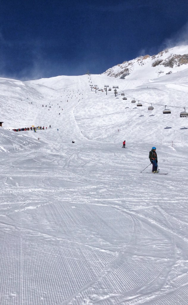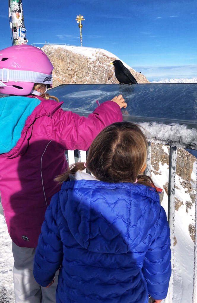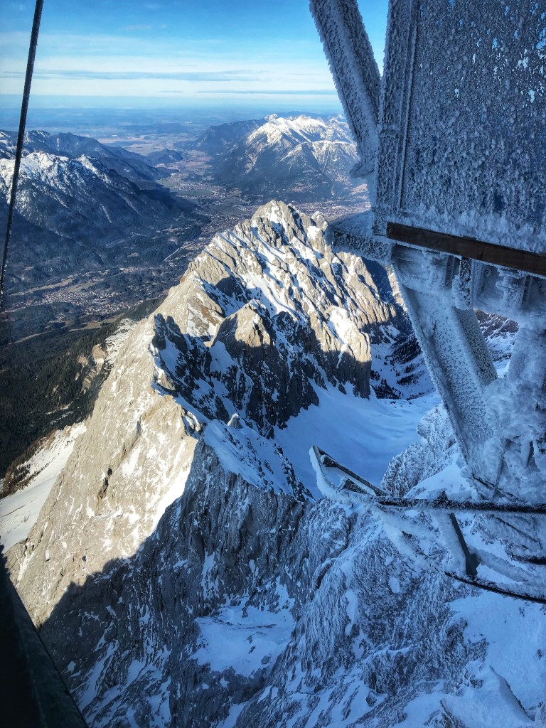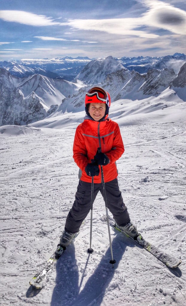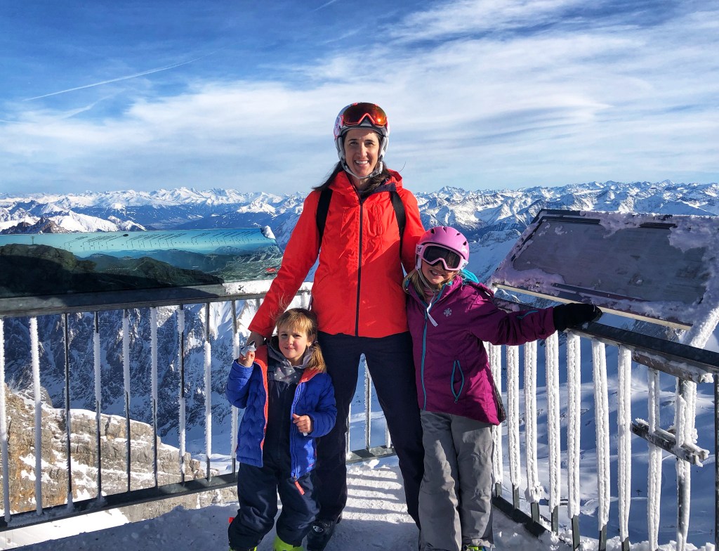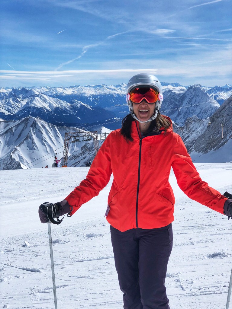 Saturday was the exact opposite of Friday weather-wise, so we were VERY excited to make our way to the infamous Zugspitze! After yesterday’s dumping of snow, we knew the conditions were promising. There are several ways to get to the Zugspitze ski area – via the train or two gondolas, one in Germany and one in Austria. We decided to take the brand new, world-record breaking Seilbahn Zugspitze gondola up the Germany side from Eibsee. Parking was fairly easy, and since we got there early, the wait times weren’t too bad. The Zugspitzbahn (cable car) is the longest free span in a cable car at 3,213 meters (over 10,000 ft!). It can hold 120 people at a time so the gondola itself is huge, and we were amazed at how fast and smooth it was, too! Once you reach the top, you’re at the highest elevation in Germany at 2,962m (9,718′) above sea level. From there you have to take an additional cable car down the hill to the ski bowl, which is basically a giant glacier. We all exclaimed how impressive it was to start above the clouds and descend into the ski bowl where not a single tree was visible. Only snow and mountain peaks as far as the eye could see! It really felt like we were on top of the world! From parking the car to taking our first run it took about an hour, so plan accordingly with children and arrive early for the best parking spot!