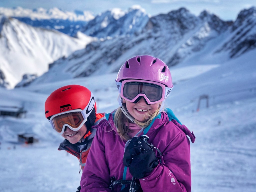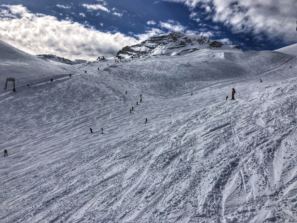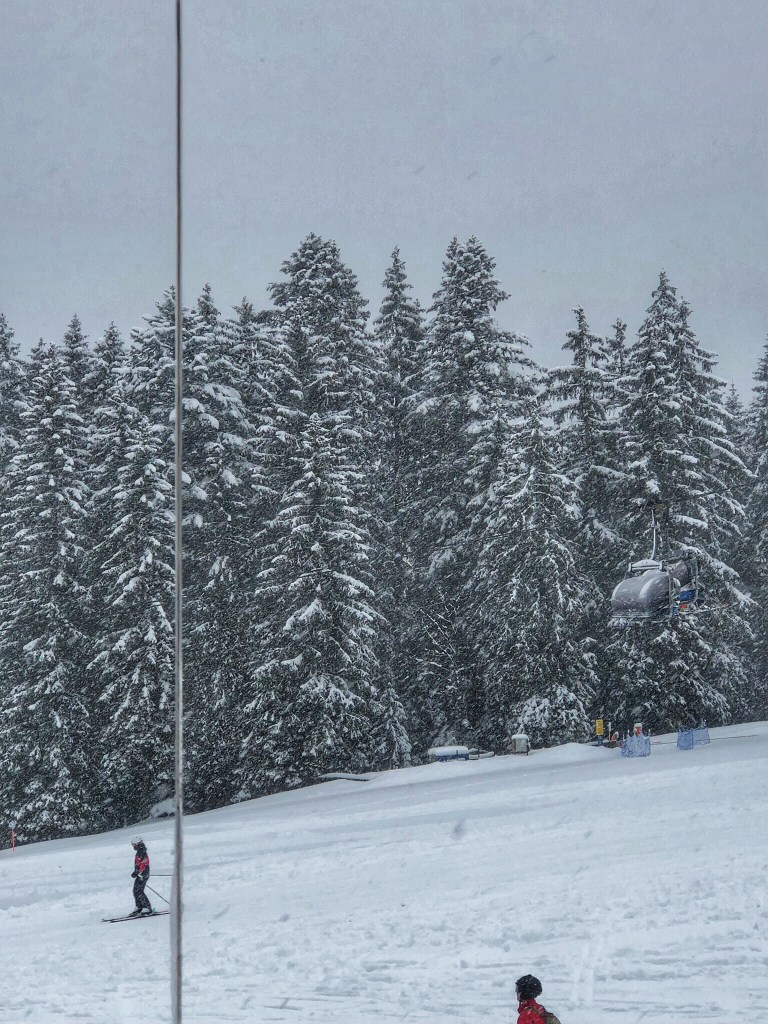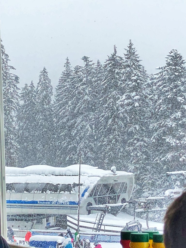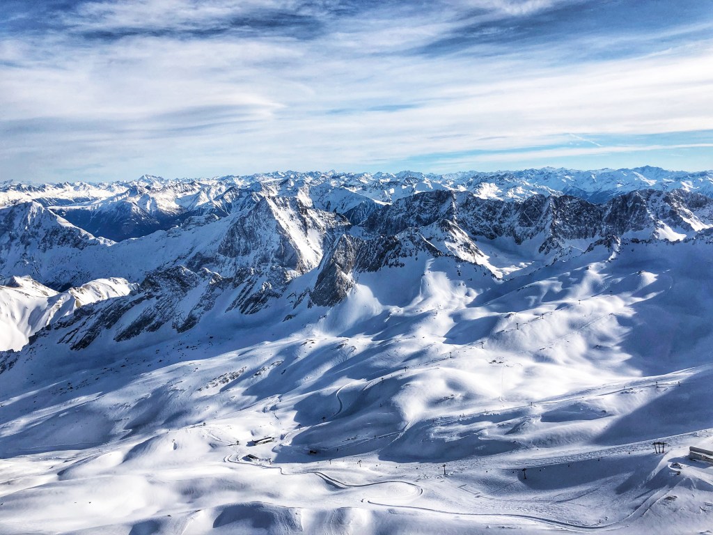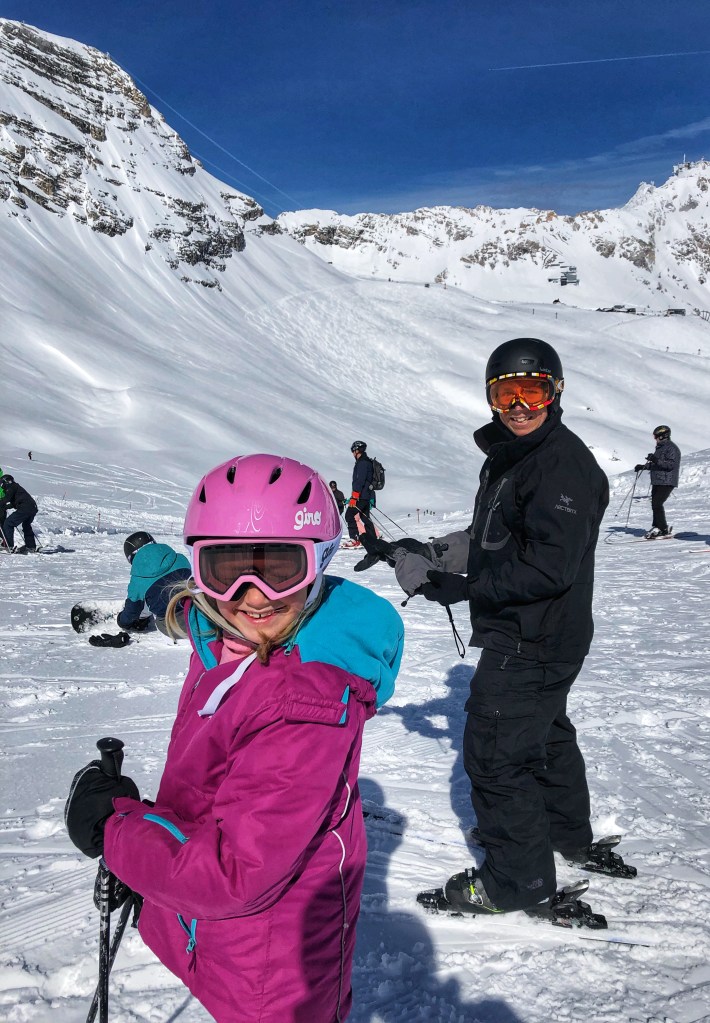 Saturday was the exact opposite of Friday weather-wise, so we were VERY excited to make our way to the infamous Zugspitze! After yesterday’s dumping of snow, we knew the conditions were promising. There are several ways to get to the Zugspitze ski area – via the train or two gondolas, one in Germany and one in Austria. We decided to take the brand new, world-record breaking Seilbahn Zugspitze gondola up the Germany side from Eibsee. Parking was fairly easy, and since we got there early, the wait times weren’t too bad. The Zugspitzbahn (cable car) is the longest free span in a cable car at 3,213 meters (over 10,000 ft!). It can hold 120 people at a time so the gondola itself is huge, and we were amazed at how fast and smooth it was, too! Once you reach the top, you’re at the highest elevation in Germany at 2,962m (9,718′) above sea level. From there you have to take an additional cable car down the hill to the ski bowl, which is basically a giant glacier. We all exclaimed how impressive it was to start above the clouds and descend into the ski bowl where not a single tree was visible. Only snow and mountain peaks as far as the eye could see! It really felt like we were on top of the world! From parking the car to taking our first run it took about an hour, so plan accordingly with children and arrive early for the best parking spot!