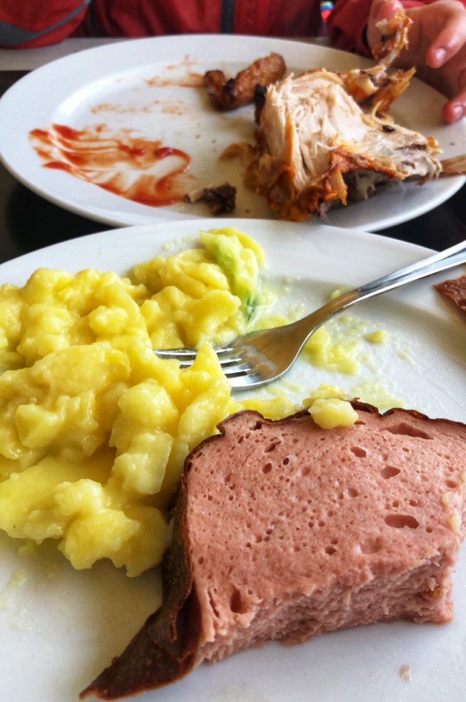 When we skied at Garmisch-Classic last month, the weather didn’t cooperate for a third day of skiing on Zugspitze, so we were eager to check it out this time. We arrived in Garmisch on a rainy, cloudy night and the weather for the following day didn’t look promising, but we ventured out with our gear anyway. To our surprise, in spite of the wet weather in the valley, the Garmisch-Classic ski area was getting hit HARD by snow instead! We were greeted by a winter wonderland when we exited the gondola. It was beautiful and a big relief to know we wouldn’t be skiing in the rain (which we decided we wouldn’t do anyway). Still, the heavy deep snow made it a bit tricky for Josh to learn on and for the kids to ski in. They were good sports in spite of the conditions! Big bro didn’t let the deep snow stop him and lil one was a powerhouse, showing off her solo moves. I didn’t worry one bit when she would take a spill because she always came up laughing and half buried in fresh snow! Middle one took some convincing to get going as the snow was SLOW and her muscles (and attitude) fatigued quickly, so it was a learning experience for her. Overall, for a day that looked like it might be a dud, it turned out just fine! It was fun to experience so much snow and learn ways to maneuver in it. I think Josh found it to be a good way to learn too, when an unexpected slip landed him softly in fresh powder. We also found out that a German “meatloaf” is basically a giant hotdog loaf. Go figure!
