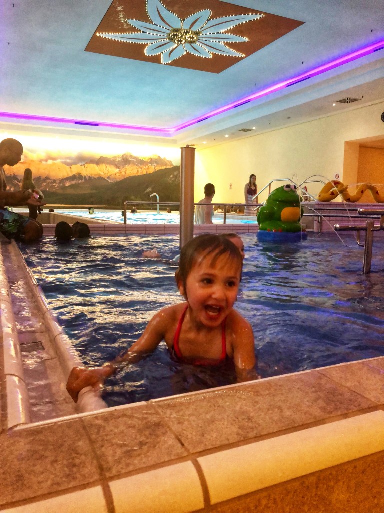 That night the kids got to go to the Edelweiss ‘Kids Night Out’ and had a blast with other kiddos eating dinner, playing games, doing arts and crafts and watching movies while daddy, Josh, Meryl and I went out to dinner. It may have been a drizzly evening but we were still able to hop around the town and check out a few places for drinks, dinner and dessert. Servus, where we had drinks before dinner, was a nice little bar with eclectic decor and a relaxed vibe. Mukkefuck was a delicious place we ate at for dinner (reservations recommended) that friends had suggested, and we gorged on big beautiful salads, fresh bread and a selection of meat and gnocchi dishes. We ended the evening eating dessert at Maronis and had delicious chopped up “pancakes” with plum sauce and powdered sugar (a German specialty) that were a big hit. Garmisch is such a cute little German town…its a place that will be fun to explore in the future! Lots of little shops, bakeries and eateries, and everything seems accessible on foot. We made our way home that way, walking off our massive apres-ski dinner!