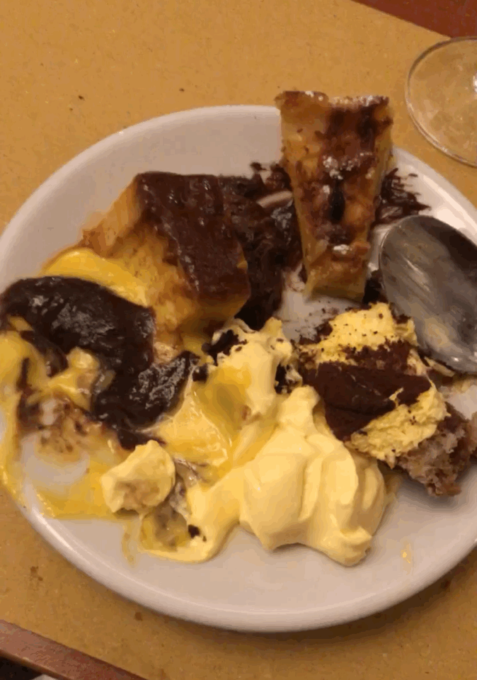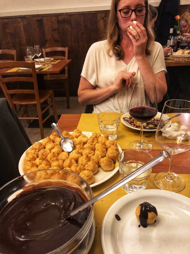 After that came a casserole dish full of tiramisu, AND an entire cake-like tart. We couldn’t keep up, and by the end of it we were laughing so hard we could barely chew…we couldn’t believe there could possibly be anything else, when they cleared away the vats of pudding and plates and brought out a huge platter FULL of little sugar-dusted puff pastries and a huge bowl of chocolate sauce! Everyone was staring at us and we were totally boggled by the whole experience! After each dessert course we could see they were returning the uneaten food to the refrigerator to serve later – something that we never imagined could or would ever happen! Only in Italy I guess!