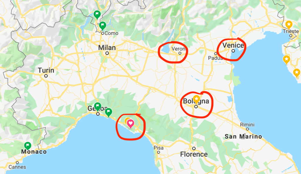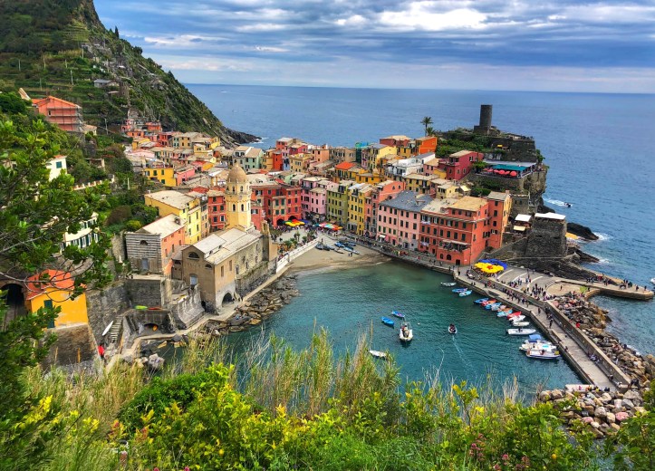We were so lucky…it didn’t rain on us all day so we were able to enjoy the full brightness of the colorful Cinque Terre towns. We saw four of five of them (only missing Corniglia) and really felt like we were able to get a great overview of the area in just one day! Only as we were settled in late into our dinner did it start to sprinkle on us and by then we didn’t care! We were nestled under an umbrella with seagulls coming to say hello, people watching selfie-takers down below and placing bets on which parcels of land we were able to see form high up on our Nessun Dorma cliff. We just kept ordering food and drinks until we got tired and the sun set – it was an absolutely magical day!