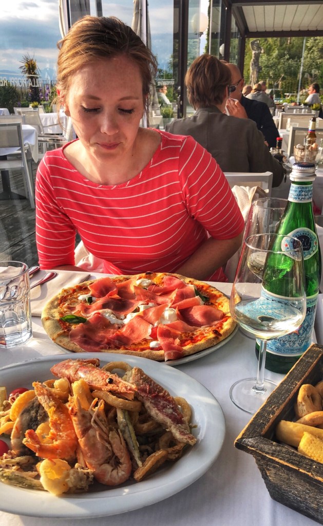 We checked into our hotel and rested for a moment, figuring out our game plan for the evening. We went out for a little walk to see the lake and then went down to join the fun at the races. We walked along the race route and finally settled in for aperitifs and dinner at Villa Pioppi Hotel. It was a lovely evening filled with laughter, birds stealing our food, German racegoers picking our brains, and a plate of seafood with more eyeballs than we’d ever seen before!
