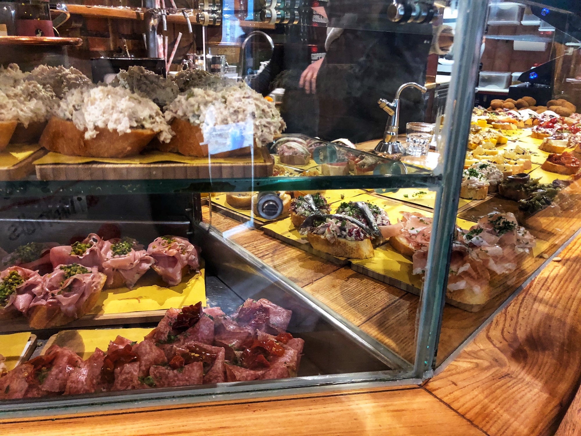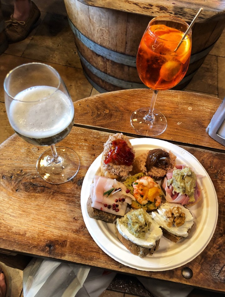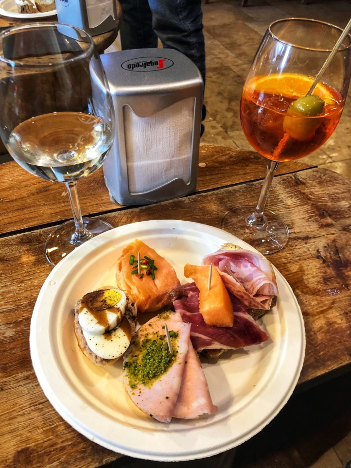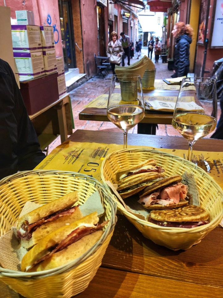 Before delving too much into sightseeing, we decided on food and drink. We walked down Via Pescherie Vecchie and found a great place to grab a light lunch – Zerocinquantino. They had a delicious assortment of “Tigelle” sandwiches, made from little round breads exclusive to the Modena region of Italy. We shared half of them on the menu, and of course, wine! Despite the overcast skies, it was a great day for people watching. Bologna was less touristy than Venice; we felt like we were mixed right in with the hustle and bustle of everyday Bologna life! After we ate lunch, we bought tickets online to climb up the tower. (You can’t buy tickets at the tower, so online is the easiest way to secure a spot.) Then we grabbed some ice cream, walked around a bit, and grabbed Prosecco in a little bar…just before our time slot arrived to ascend Torre degli Asinelli! After the rewarding climb, we descended and walked around the Piazza Maggiore with wiggly legs.