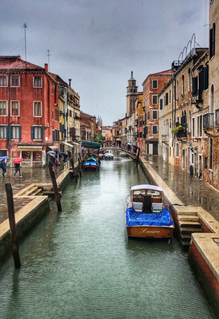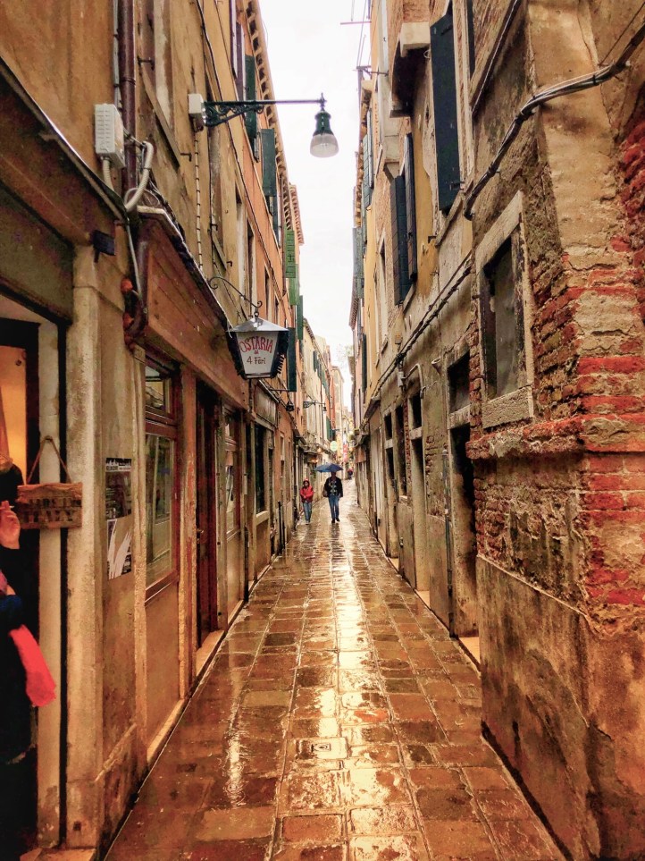 The next day it was pouring. All day long. After breakfast at our hotel we put on our wet gear and vowed to not let that stop us! Varying conditions of “wet” meant we had to be creative. We weren’t able to view the city atop the Fondaco dei Tedeschi (but we went up there and highly recommend it! Views *would* be beautiful and FREE!) adjacent to the Rialto Bridge, so instead we sat in the atrium cafe and had tea and people watched. We didn’t have great luck strolling the wet streets so we ducked into Osterias and enjoyed glass after glass of Prosecco and had a progressive lunch of cicchetti. Cicchetti, or “small snacks” are a most amazing, delicious and affordable lunch option in Venice. They’re basically an open-faced sandwich. You can count on food in Venice to be quite expensive ($5 for a little coffee!) so at around $1.50 per piece, cicchetti is a welcome options with limitless variations! And $2 wine? Yes please! We fell in love with two places in particular, and had great luck finding seating in the cozy little establishments. Overall it was a great day in spite of the rain! We walked over six splashy miles, found some terrific souvenirs, and didn’t have a care in the world (except trying to stay dry).