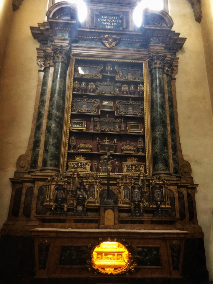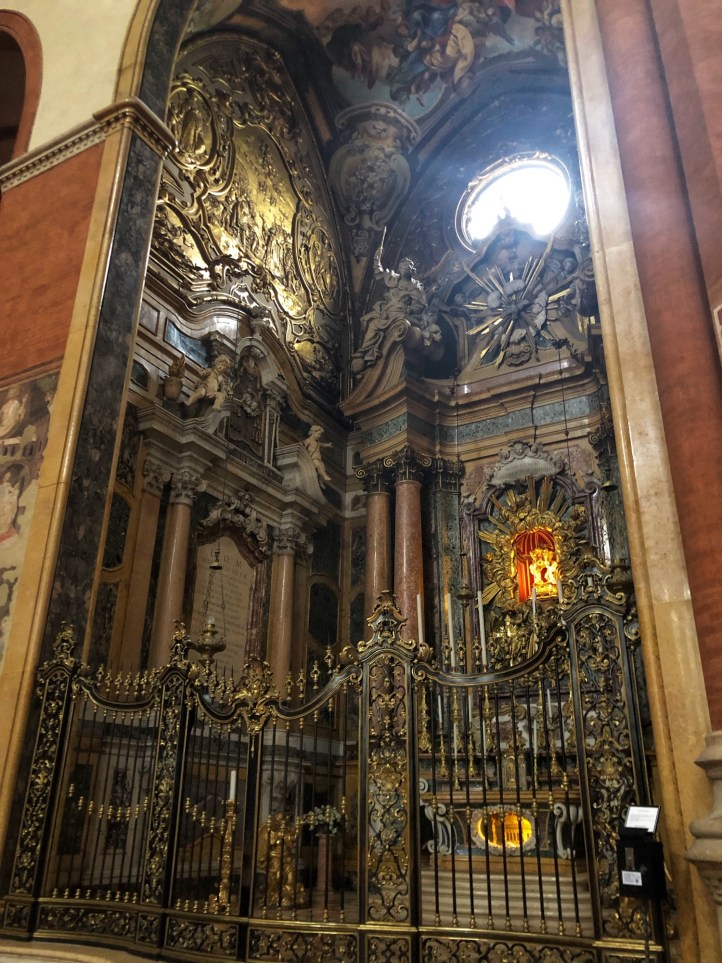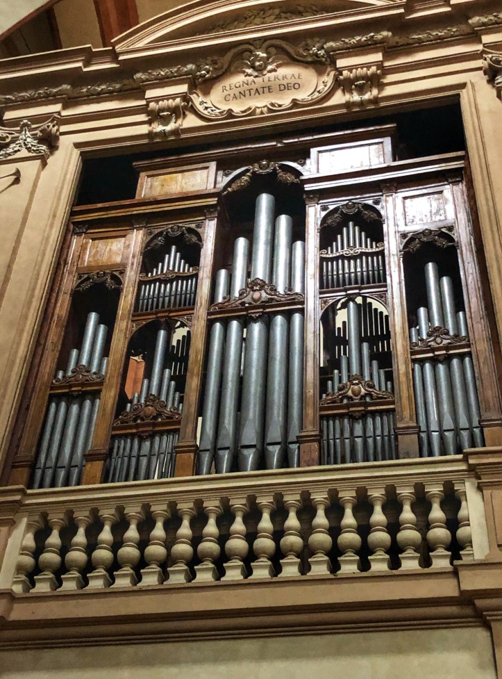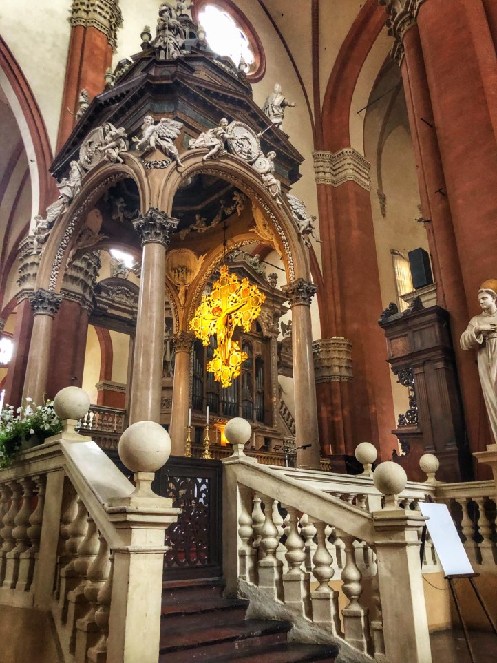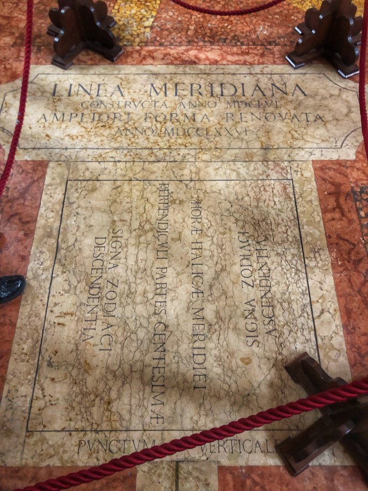 Inside the Basilica I immediately noticed the floor. The marble mosaic tile is stunning – but something else stood out. There was a line resembling a meridian that extended at a strange angle along the left aisle. We learned that the line was designed and installed by Giovanni Domenico Cassini, who taught astronomy at Bologna University in 1655. The line he created is 219 feet long and is used as an astronomical instrument to make accurate measurements based on sunlight coming through a tiny 1 inch hole 88 feet high in the vaulted ceiling. The sun projects an elliptical image that falls exactly on the meridian line at noon every day (when it’s not cloudy), and from the varying positions, Cassini and his students were able to calculate equinoxes, solstices, the duration of the tropical year and much more. Apparently it was the first experimental verification of Kepler’s laws of planetary motion. Fascinating. (Thanks, google!) We were lucky to be able to listen to an organ demonstration and wander around many of the 22 side chapels.