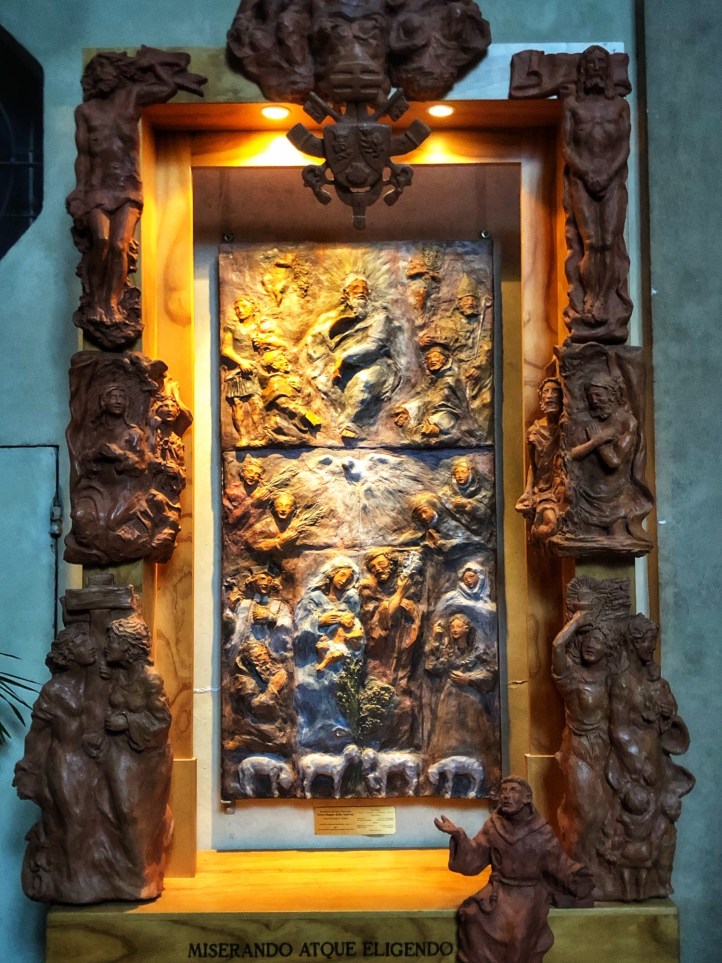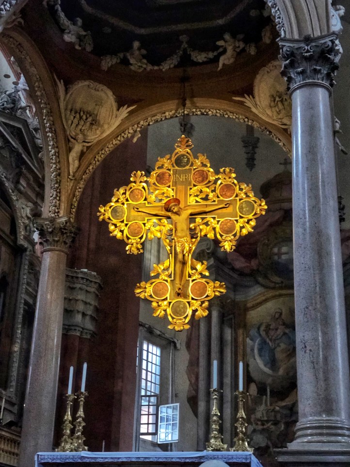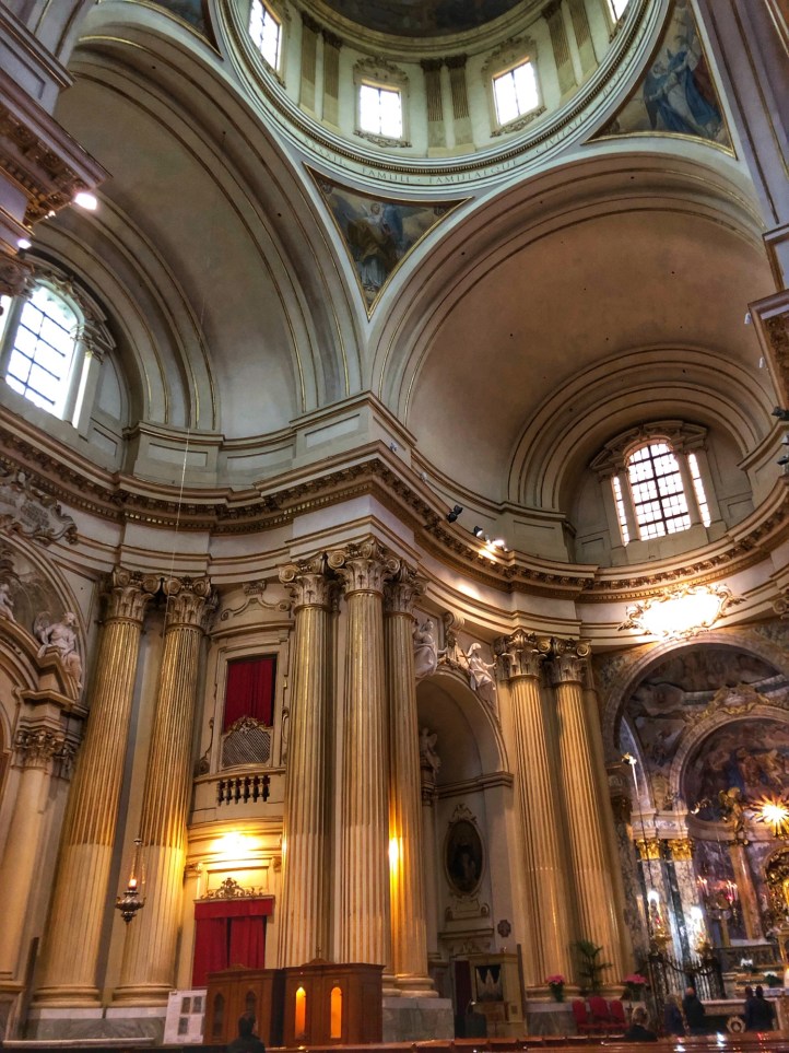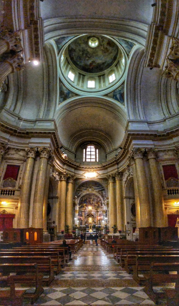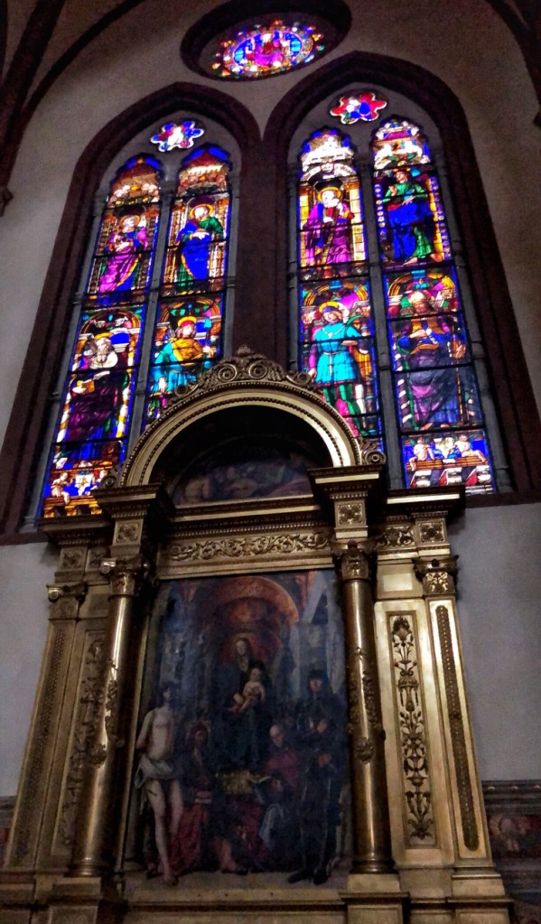 Inside the Basilica I immediately noticed the floor. The marble mosaic tile is stunning – but something else stood out. There was a line resembling a meridian that extended at a strange angle along the left aisle. We learned that the line was designed and installed by Giovanni Domenico Cassini, who taught astronomy at Bologna University in 1655. The line he created is 219 feet long and is used as an astronomical instrument to make accurate measurements based on sunlight coming through a tiny 1 inch hole 88 feet high in the vaulted ceiling. The sun projects an elliptical image that falls exactly on the meridian line at noon every day (when it’s not cloudy), and from the varying positions, Cassini and his students were able to calculate equinoxes, solstices, the duration of the tropical year and much more. Apparently it was the first experimental verification of Kepler’s laws of planetary motion. Fascinating. (Thanks, google!) We were lucky to be able to listen to an organ demonstration and wander around many of the 22 side chapels.