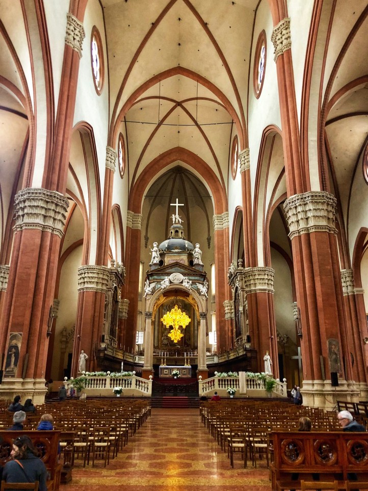 Our bus exit was in Piazza Magiorre, and we were happy to be here with healthy appetites. Bologna is a foodie city indeed, and from the piazza we could look down narrow city streets filled with eateries and markets. Right away we noticed the acclaimed vaulted porticos, but also took note of the medieval looking buildings. They had a decisive Gothic style, but their construction felt unique to this city. The walled fortress design extended throughout the city in a uniform way – each building having the familiar pointed arch windows, various battlements, and simple, symmetrical footprint. Even the Basilica di San Petronio – the centerpiece of the city – is the only church of its kind I have ever seen. The interior was classic Gothic style, but the exterior was fortified almost the same way the surrounding buildings were! There were technically buttresses on the cathedral but they were unlike any other.