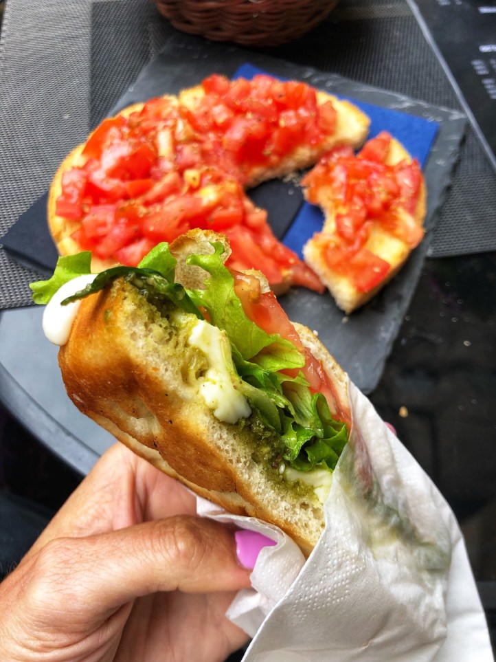 In Vernazza we jumped back on the train and went down to Riomaggiore. There we walked around, peeked at Riomaggiore Beach, and then walked back up the narrow streets to grab wine, bruschetta and another focaccia snack at Vertical Lounge Bar! I would say the most delicious focaccia we had the whole trip was at Vertical Lounge Bar, but really any focaccia you order is delicious when it’s fresh! What a treat – after that long hike to sit on a patio, people watch and enjoy amazing Italian cuisine!