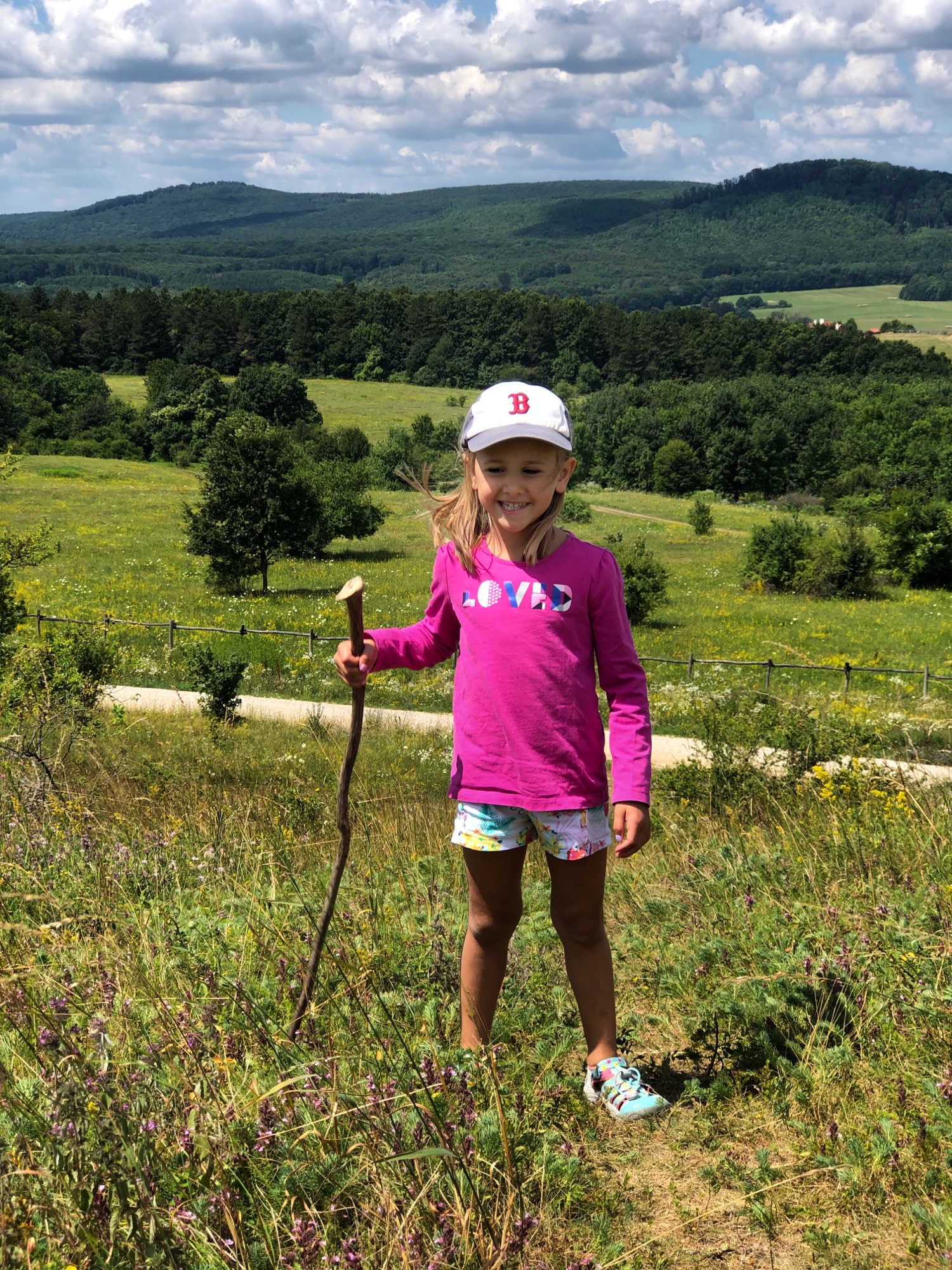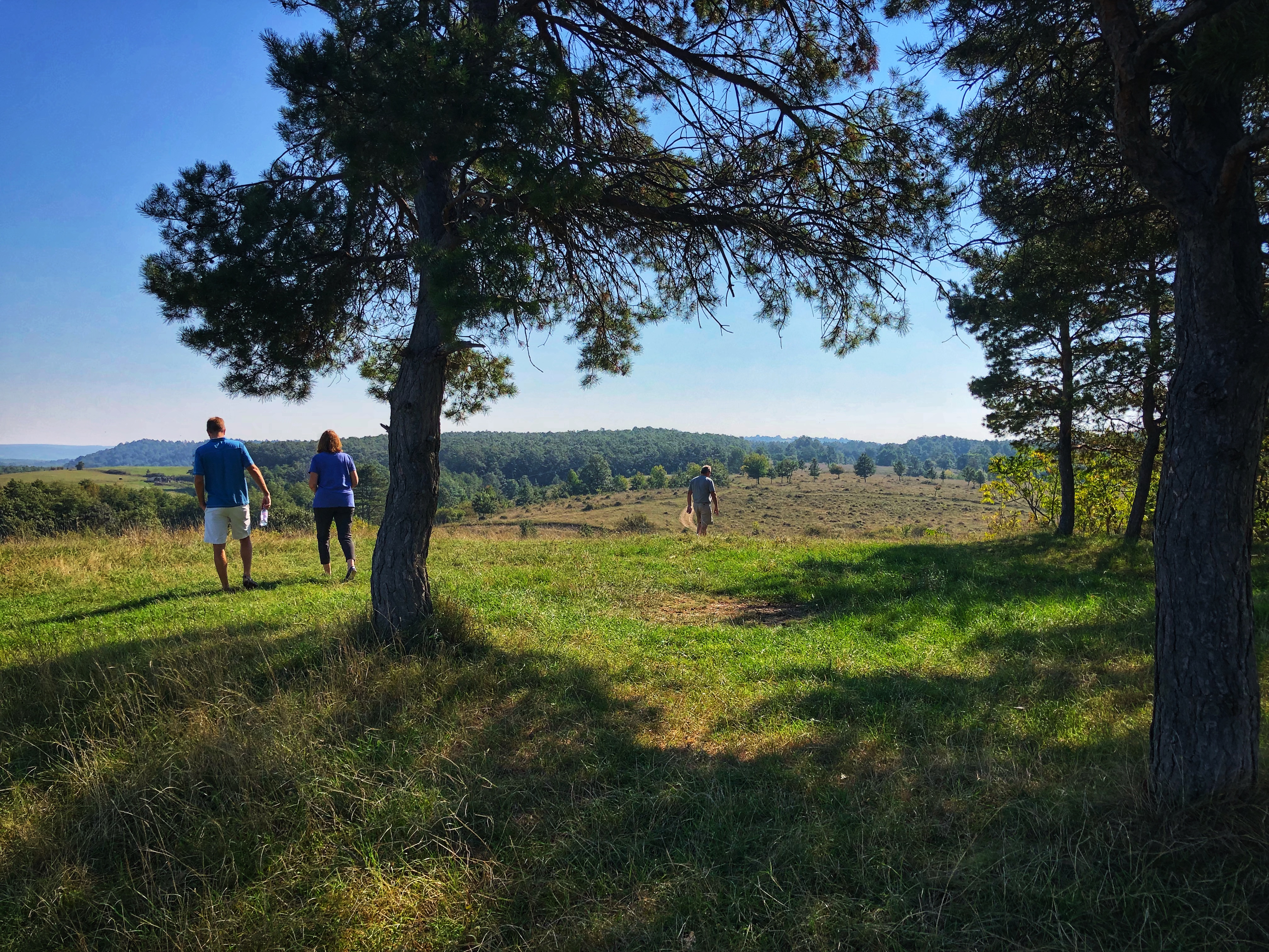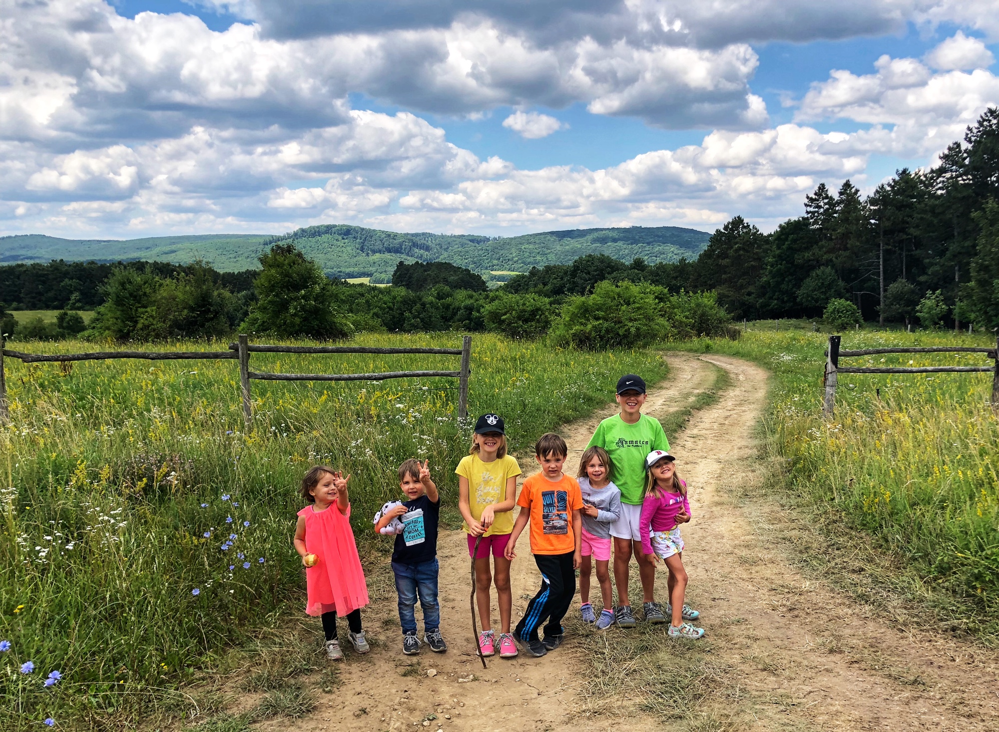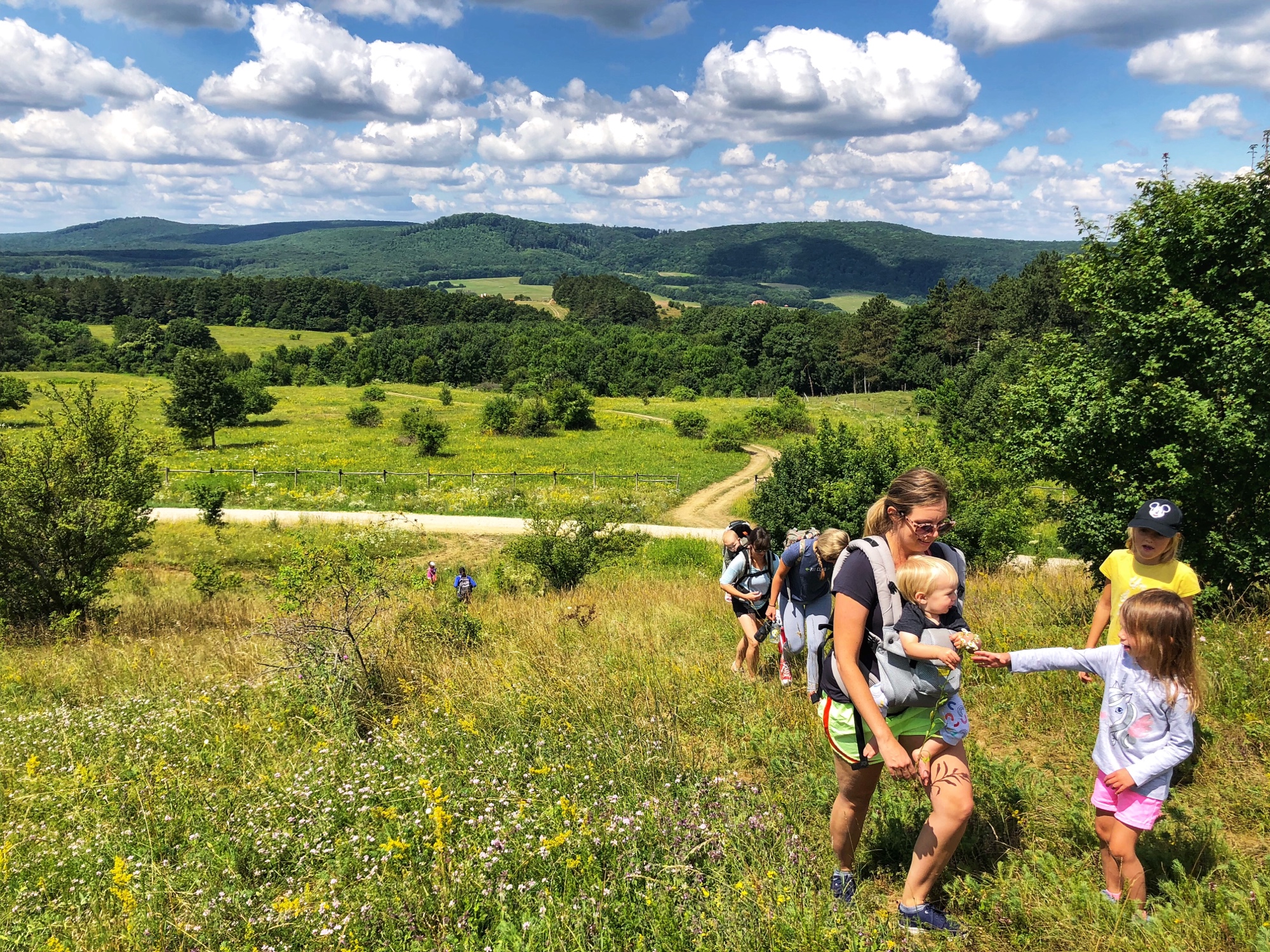 Of all the hikes mentioned here, this one has the most hiking and the least dead volcanoes. Drive to Bakonybél and take a right onto Petofi utca just past the monastery in town. There, just after the road turns to dirt, is a lovely, large parking area across from a quaint little reverent park with a pond (google calls it a museum). It is easy to find the trail labels from this spot, and they will take you up a steep hill through a forest, past a large fenced pasture to a dirt road that, once you cross, has a little hill to climb with a beautiful view from the top. It is a perfect picnic spot. Use google maps to follow the rocky road back to the main road past a big cow pasture, through little neighborhoods and into town for a nice walk back to the parking area. Children of all ages can handle this length and terrain. Again there are no facilities, except for along the road to where you park, so bring a lunch and plenty of water!