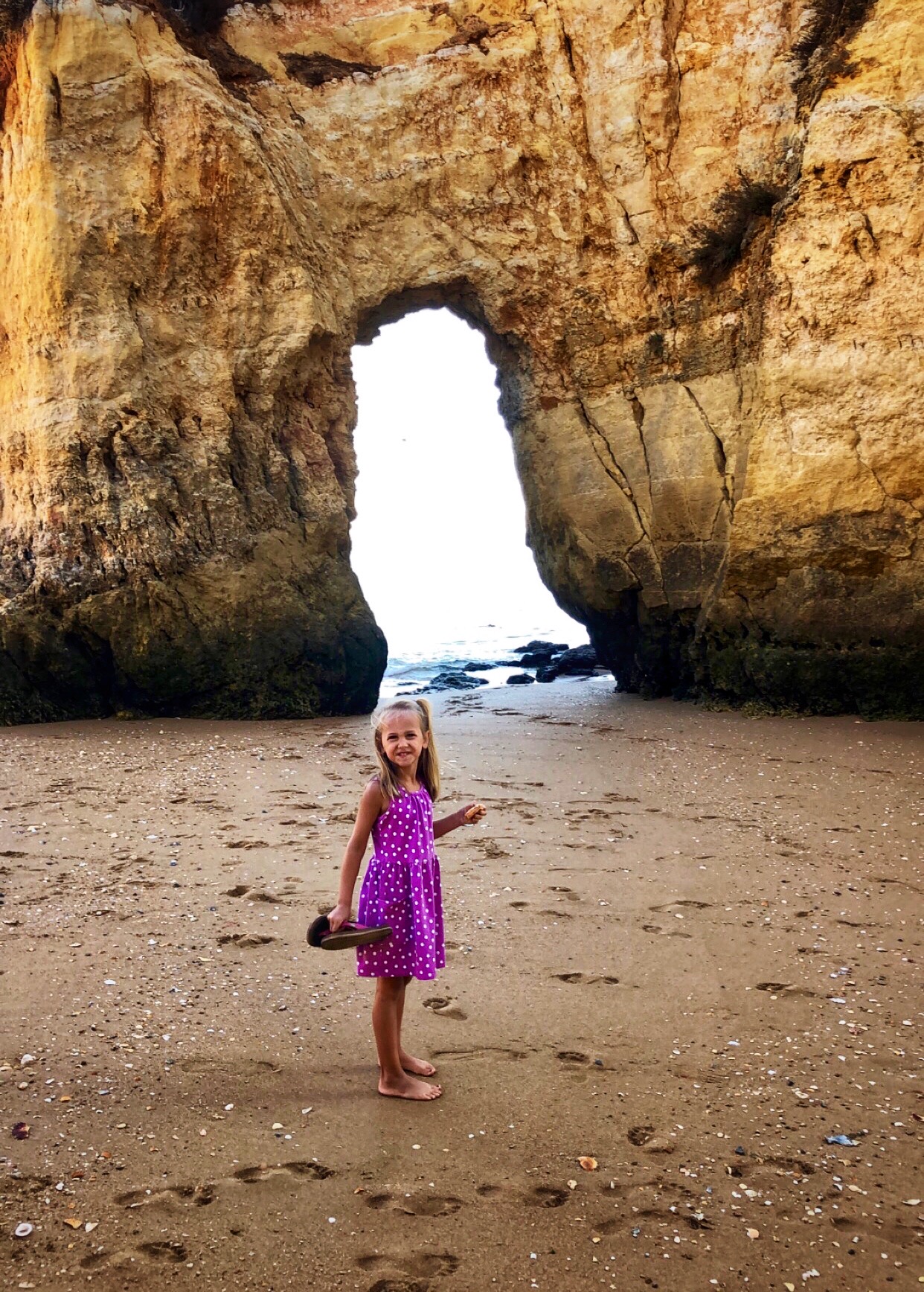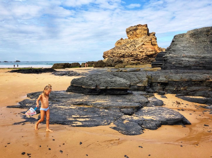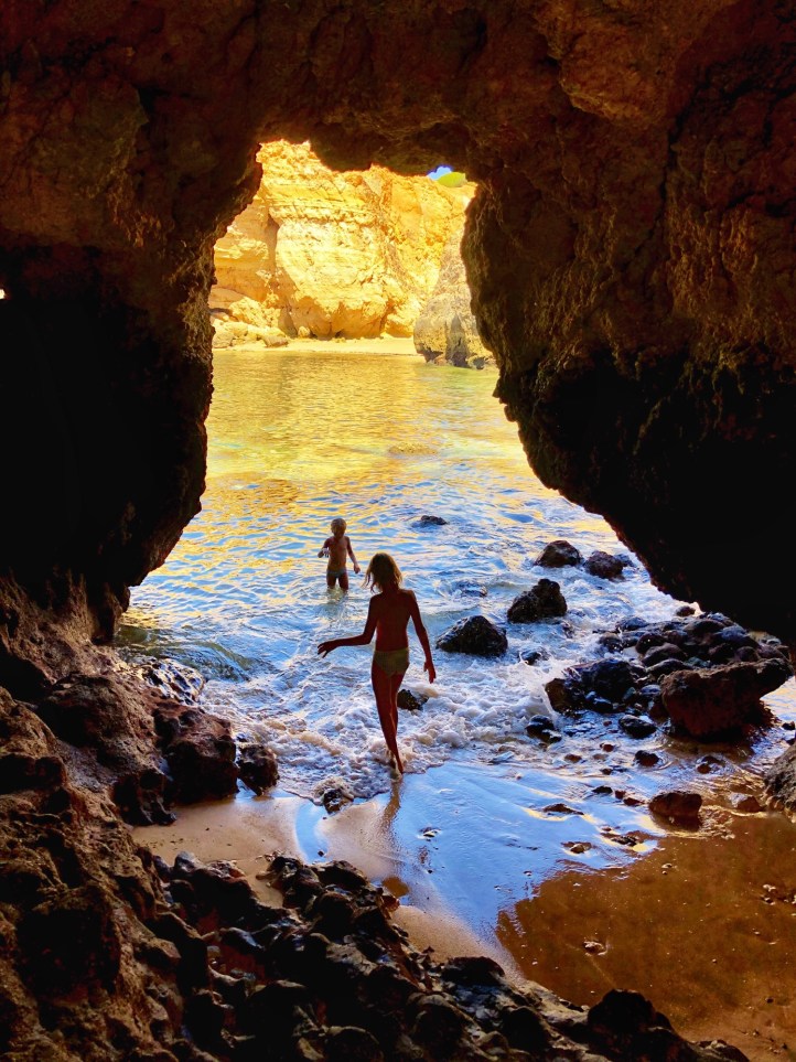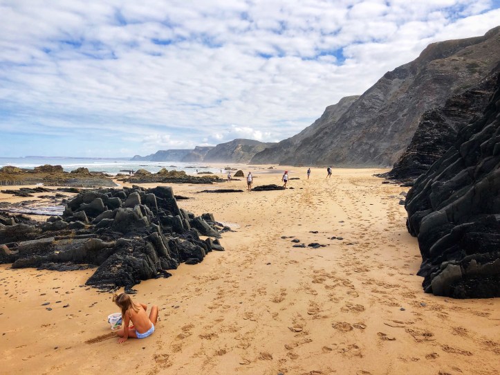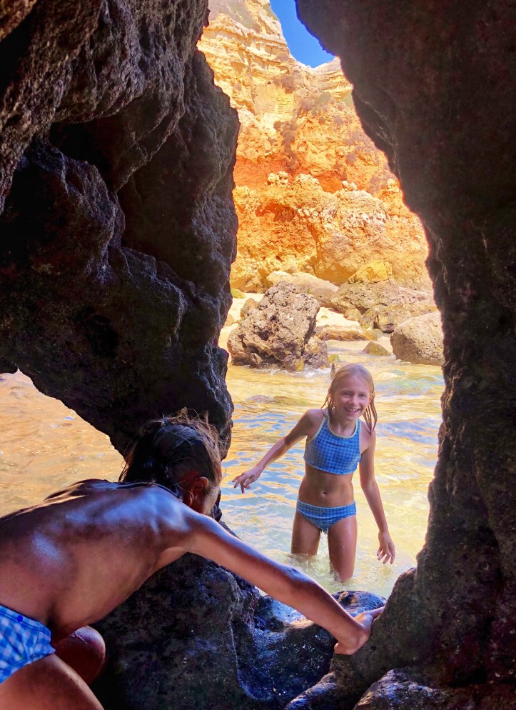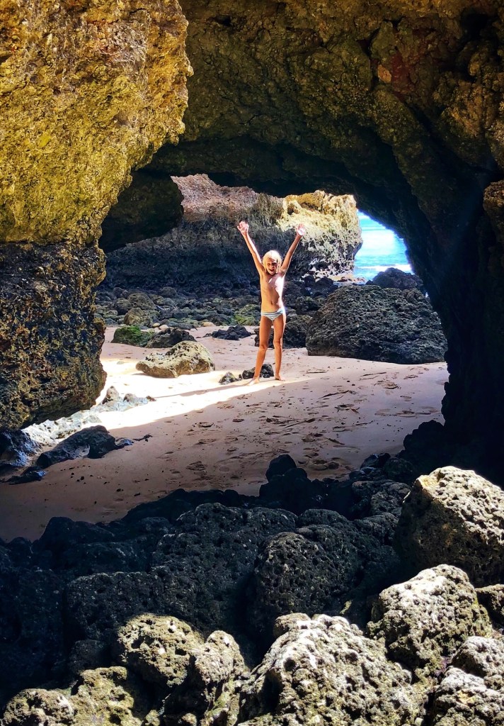 Like almost all beaches in this region, Praia João de Arens features natural tunnels and caves that lead to various other beaches and private openings that made for an especially fun place to explore. The kids were occupied with floating on the boogie board, climbing through caves and burying each other in the sand! This was the first time I felt comfortable (and in good company?) going topless as the girls did it naturally, and I must say it was very freeing! Obviously I had to be careful about my photography so I was discerning about where and when I took out my phone, but this is a decent overview of the beach – certainly one I recommend if comfortable with naturist beaches! As we learned early on, if you time this place right with the tides, it is a magical place indeed.