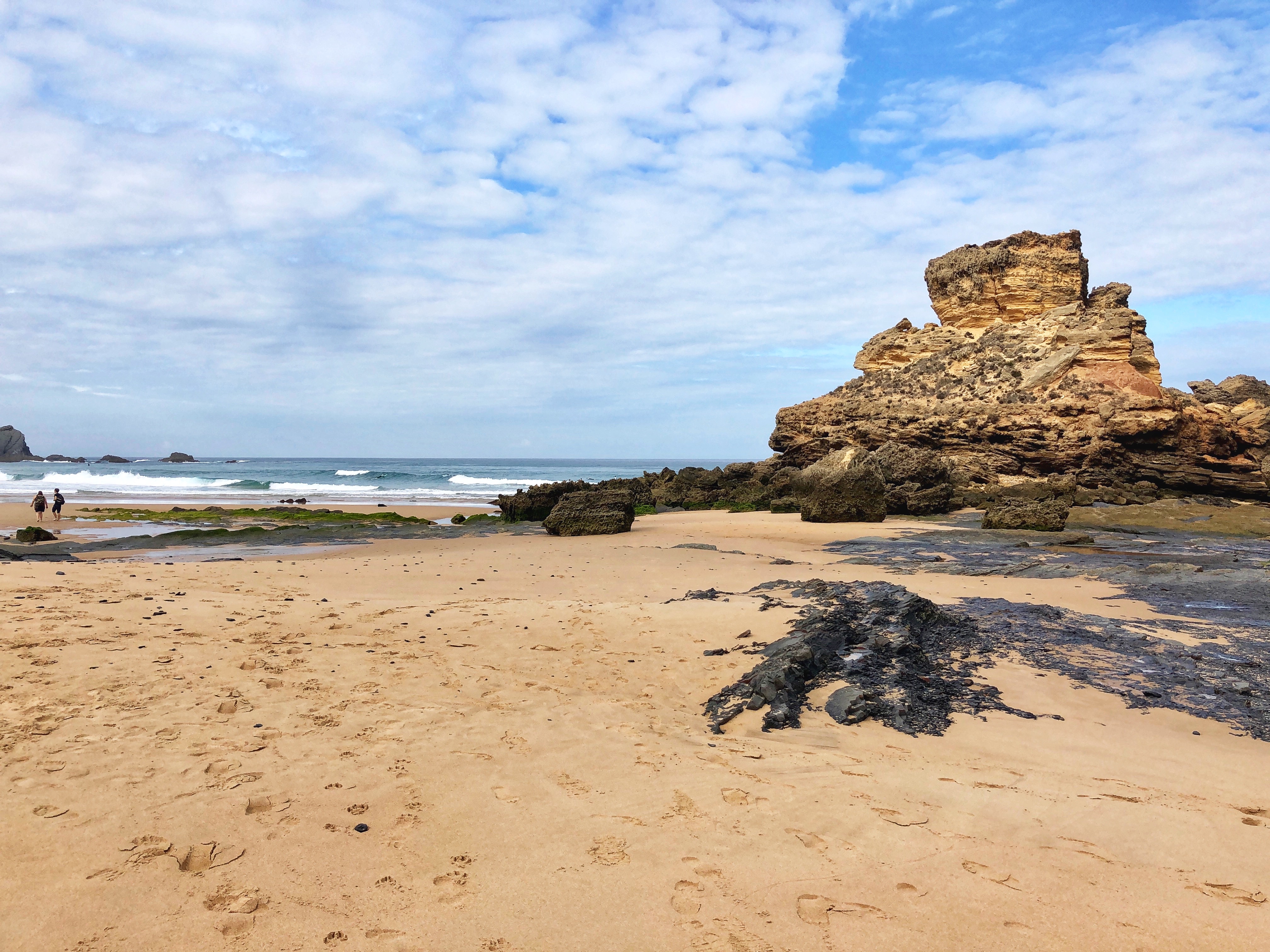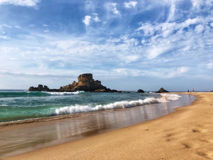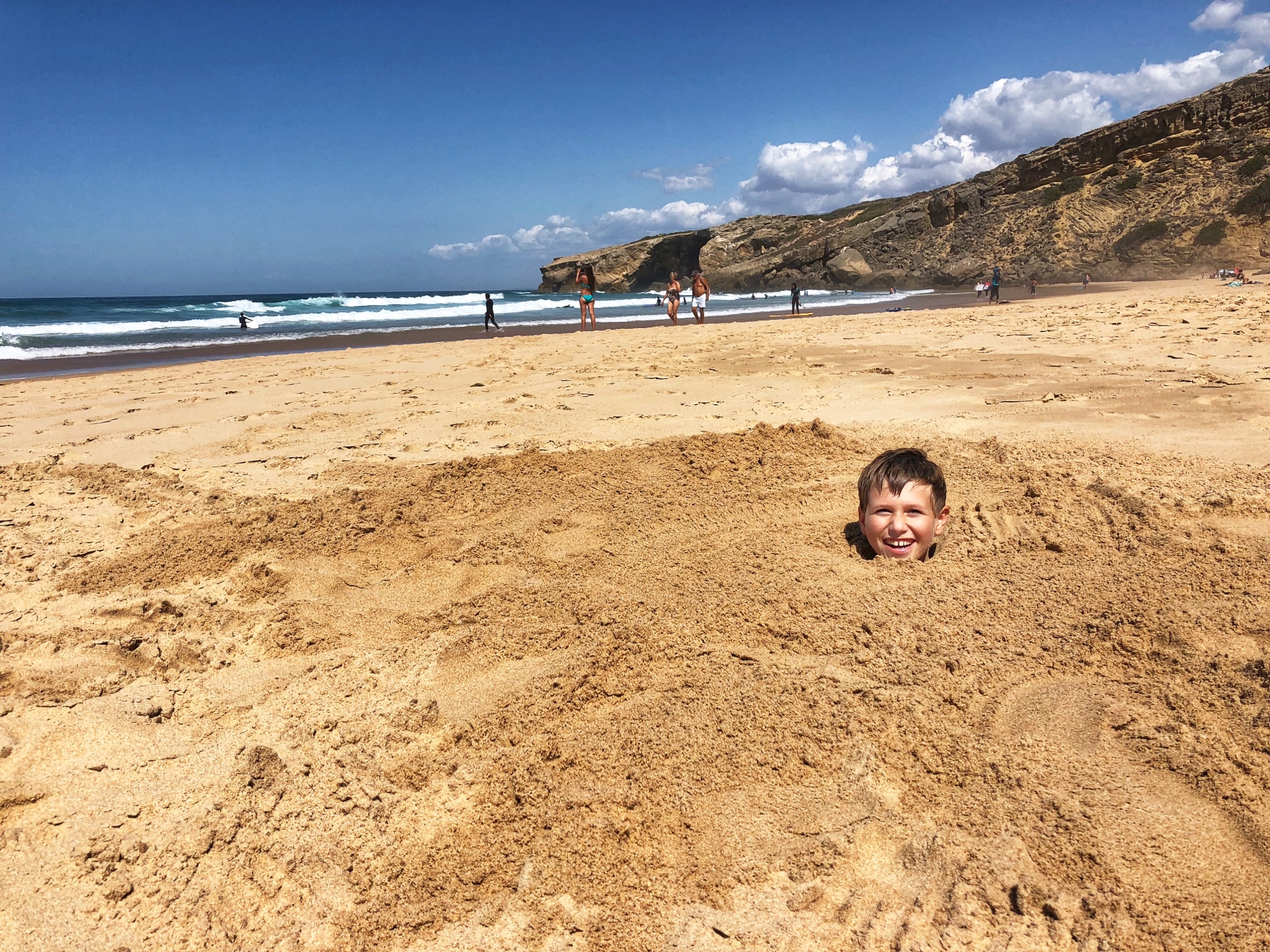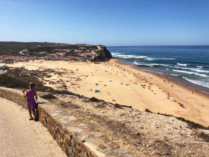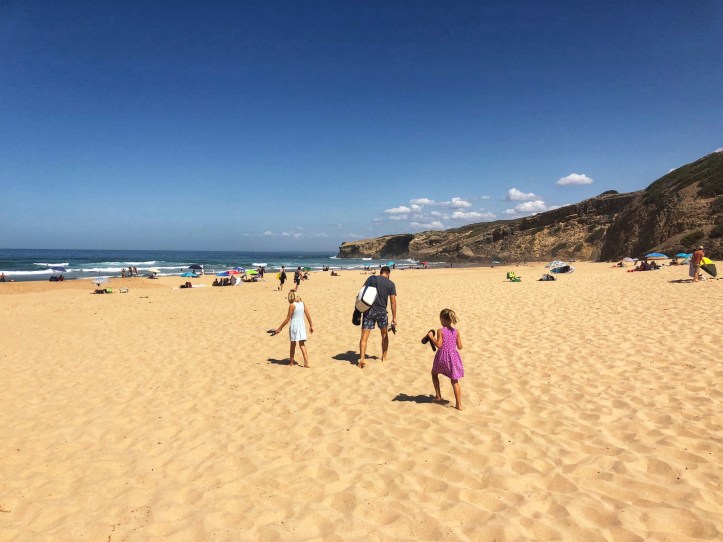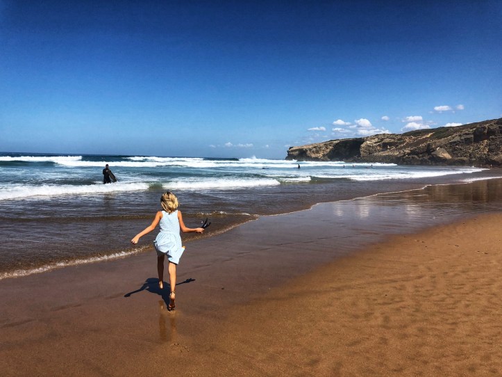 We flew into Lisbon, rented a car, and headed down the coast. Our first stop in the Algarve region was the small town of Rogil. We found a lovely, cheap place to stay for the night so we could spend the entire day at Monte Clerigo beach. The west coast of southern Portugal is flanked with cliffs and the Atlantic displays impressive waves for surfers and little boogie boarders. Our travel day from Eastern to Western Europe was so long that the kids were more than ready to get their feet wet and spend an entire day digging in the sand. Boy, was this place glorious! It was a great first impression, and daddy couldn’t say enough about how perfect the place was. He and I have slightly different ideas about what an “ideal” beach experience is, but we could definitely agree that the great waves, gradual depth, spacious sandy beach and fun rock formations made for a most memorable first beach day! It is worth noting the waves – impressive, consistent and very long.