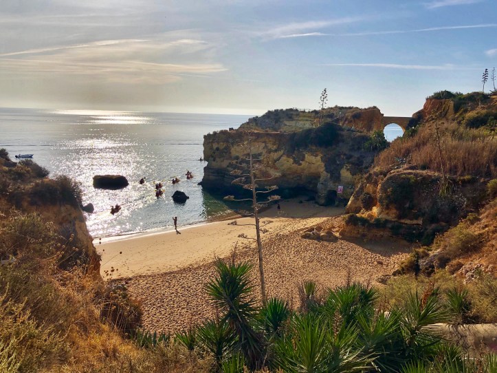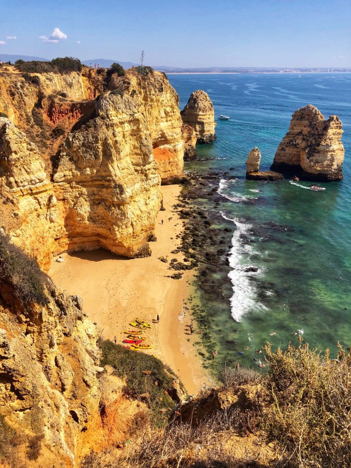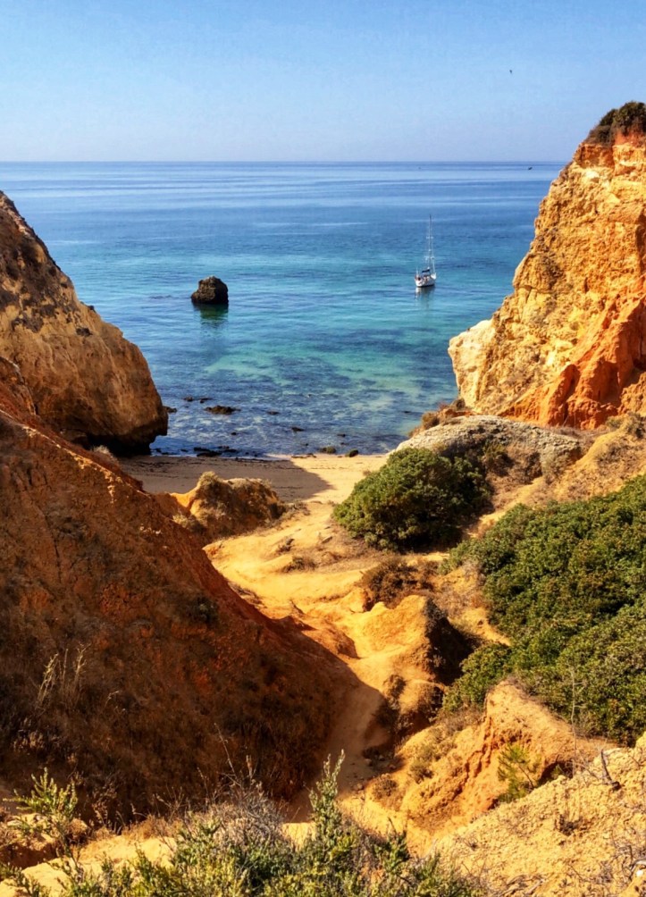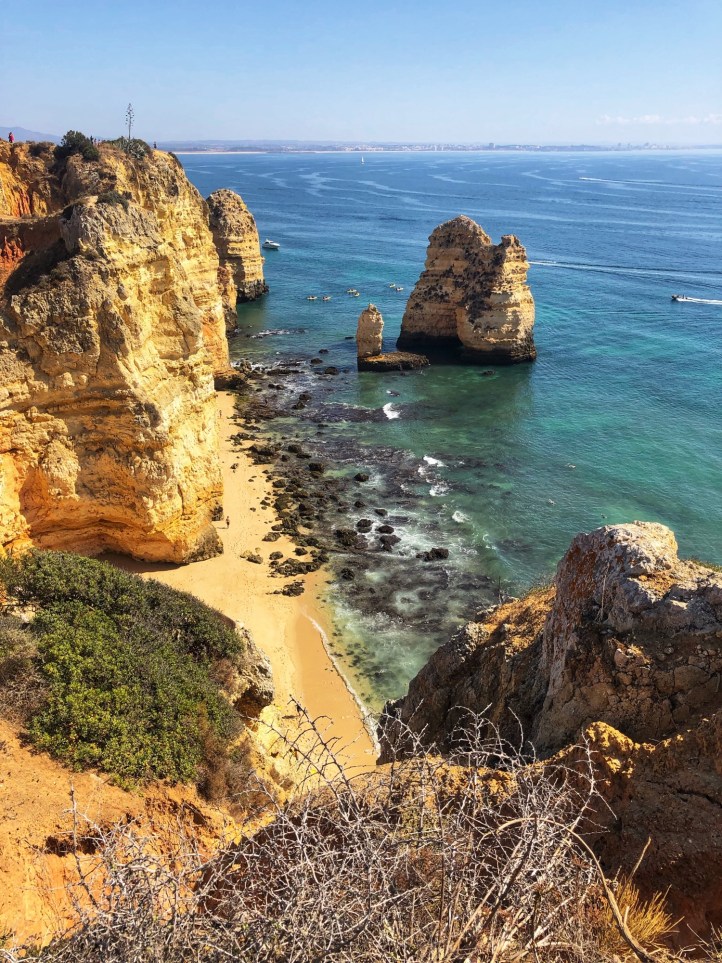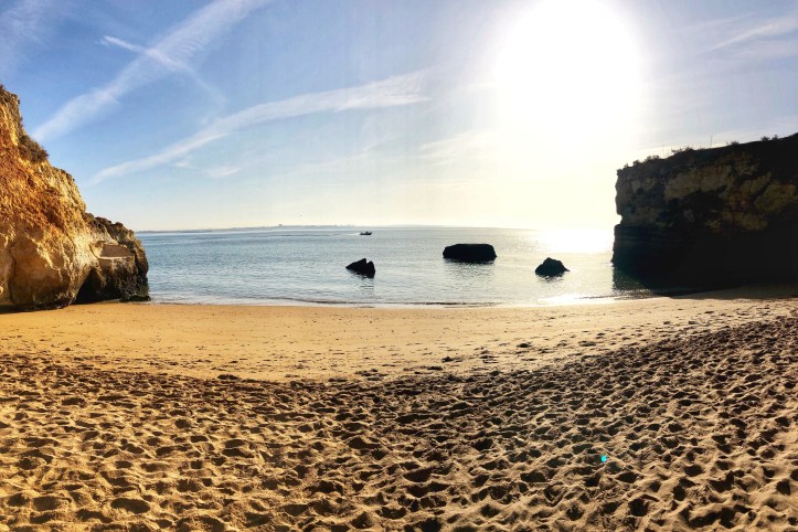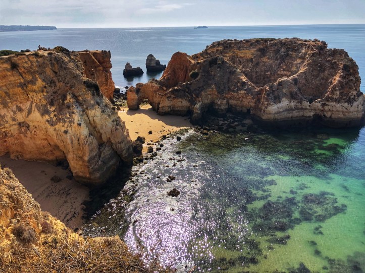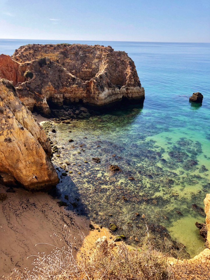 We arrived before noon to the second beach, Praia João de Arens, situated just east of Lagos. The walk there was soft and sandy along a well trekked path, but wasn’t labeled so we just followed the gps. There weren’t many people there which was nice, and once we made it to the cliffs we could scope out the beach down below and figure out a path down. It was easier to climb down to this beach compared to earlier that morning at Balança, and we had found our way down in no time. There were only a couple of other people on the beach – so we felt like we had scored again!