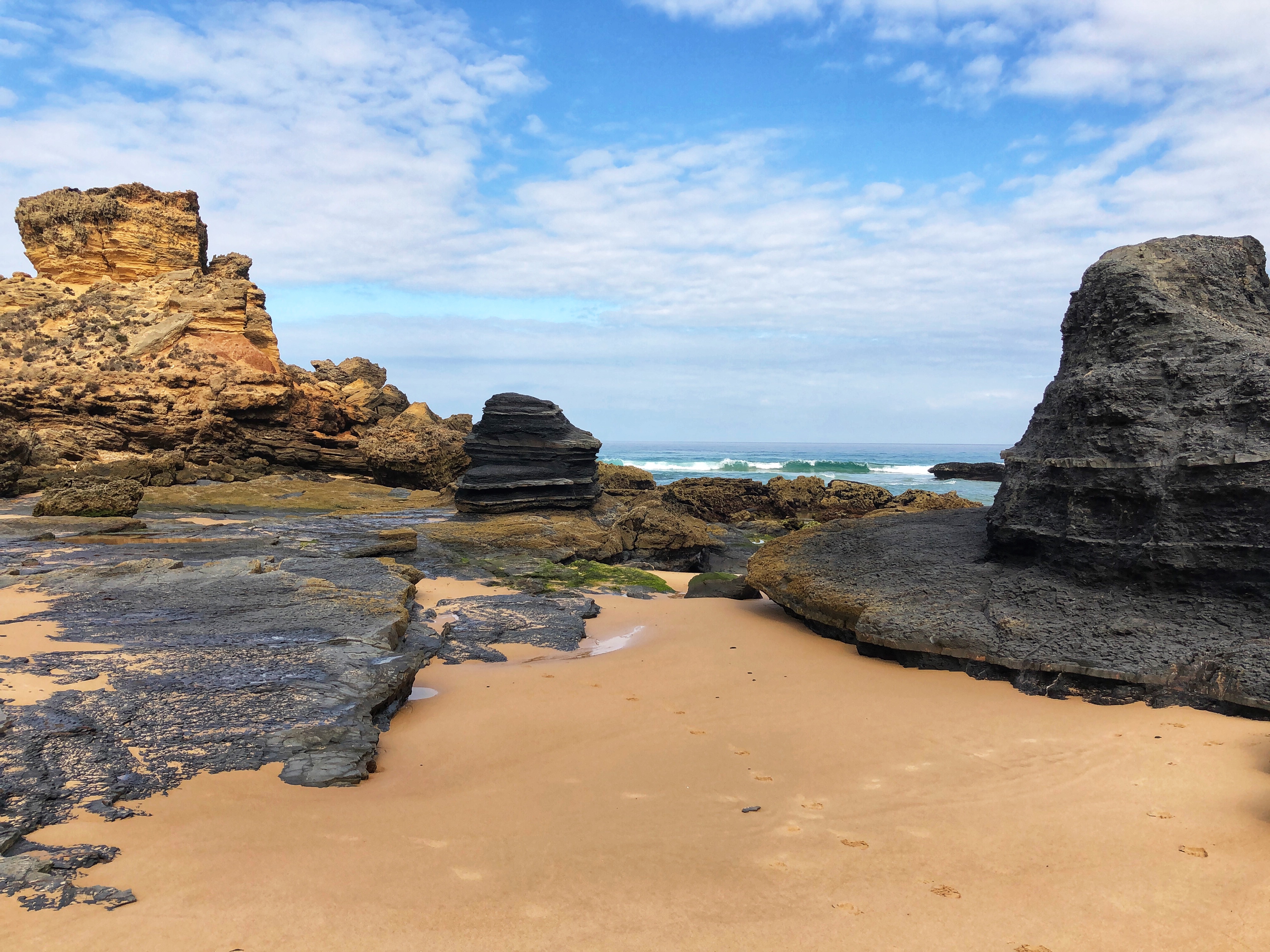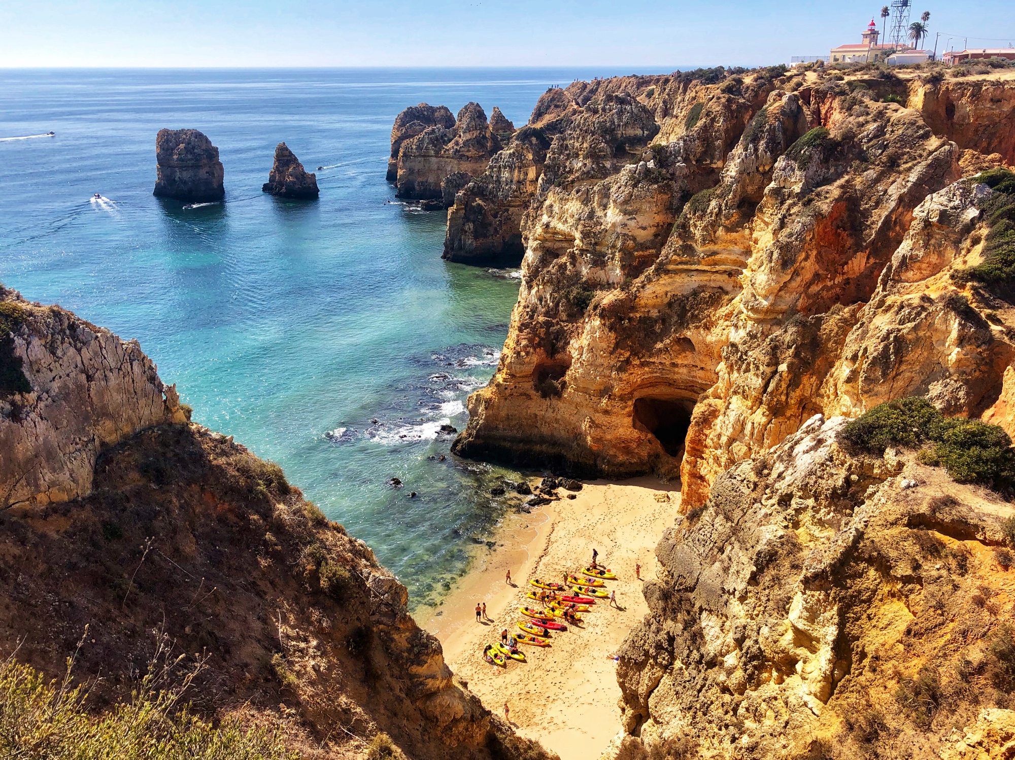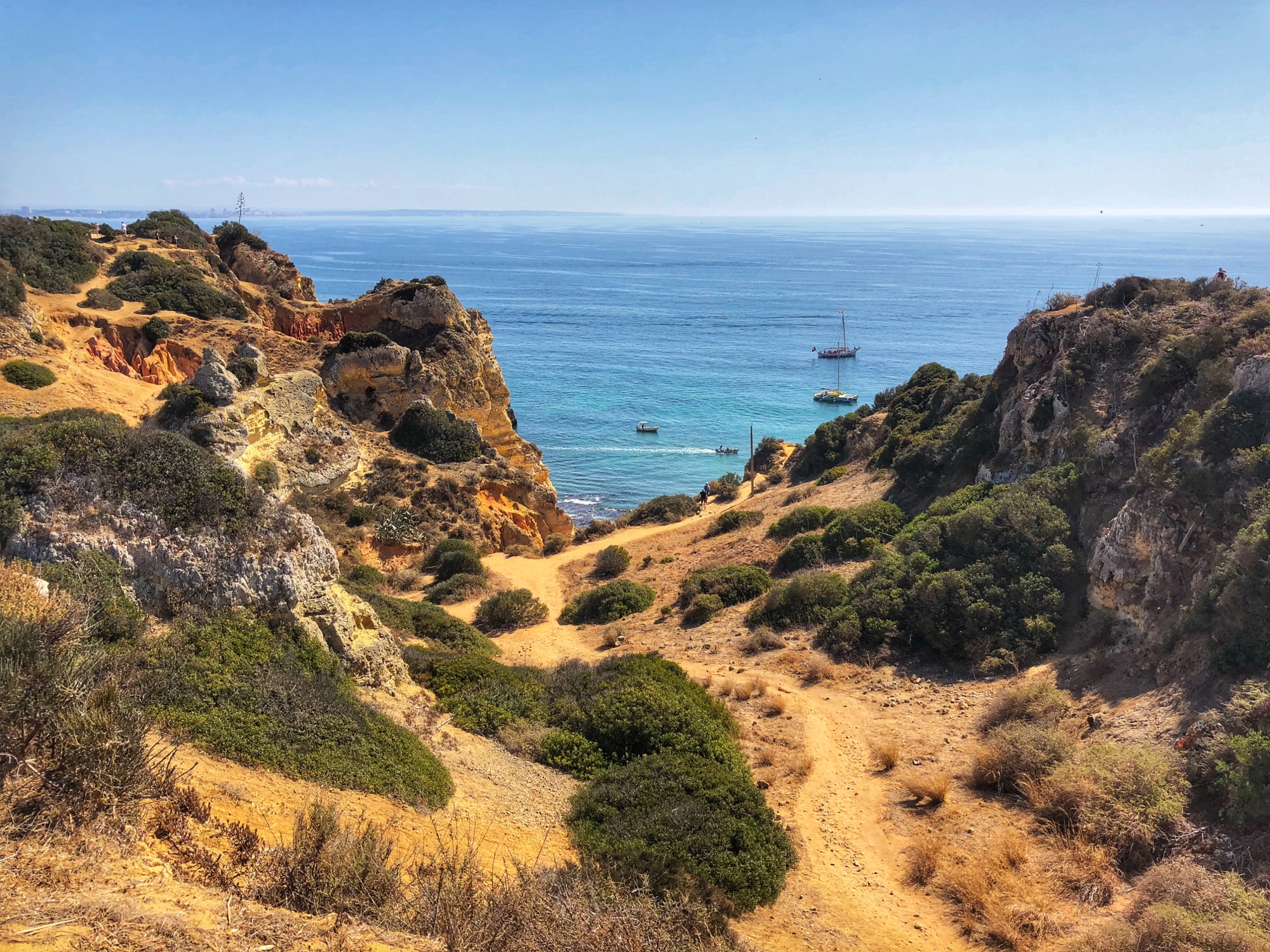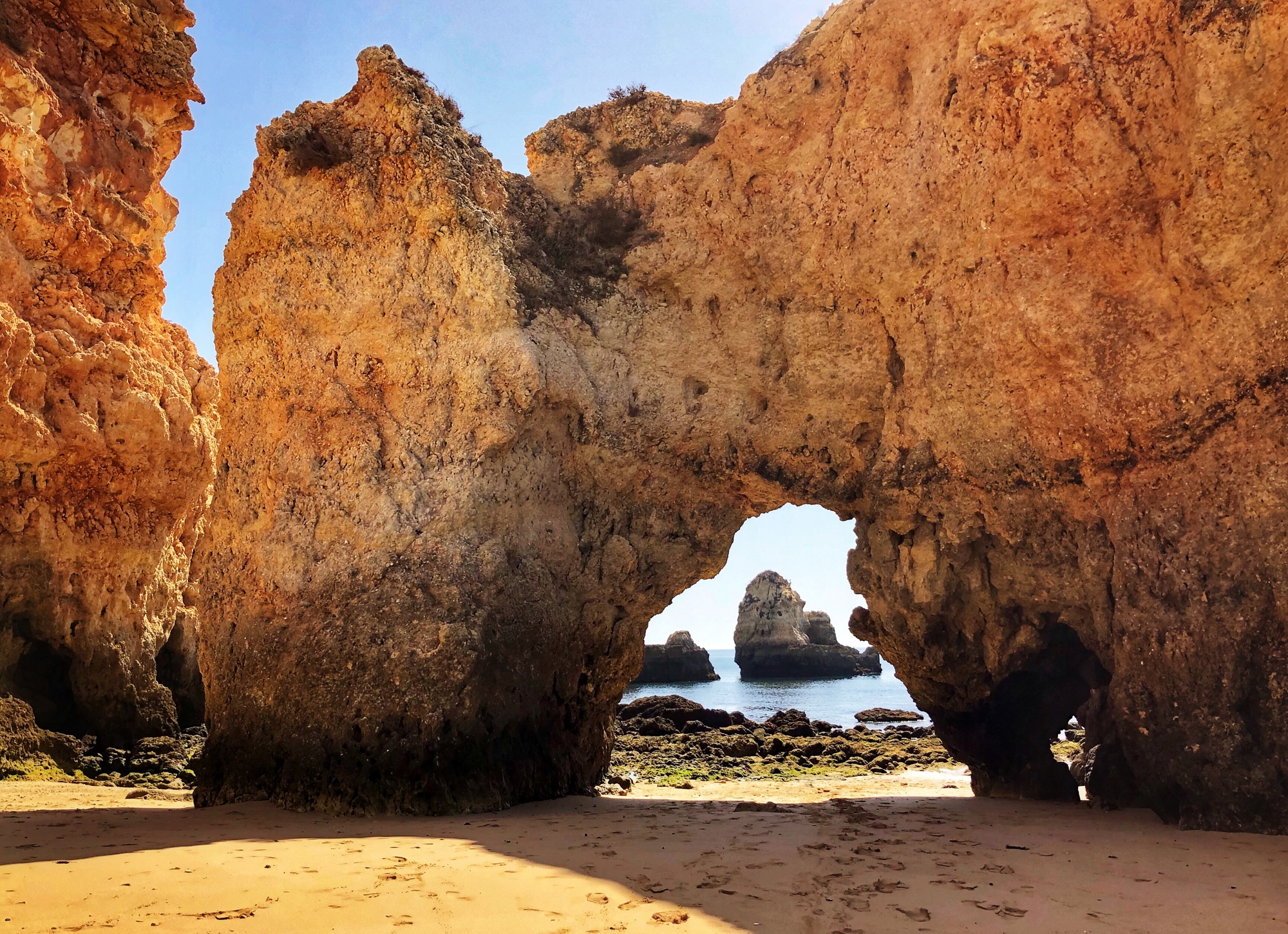 We arrived before noon to the second beach, Praia João de Arens, situated just east of Lagos. The walk there was soft and sandy along a well trekked path, but wasn’t labeled so we just followed the gps. There weren’t many people there which was nice, and once we made it to the cliffs we could scope out the beach down below and figure out a path down. It was easier to climb down to this beach compared to earlier that morning at Balança, and we had found our way down in no time. There were only a couple of other people on the beach – so we felt like we had scored again!