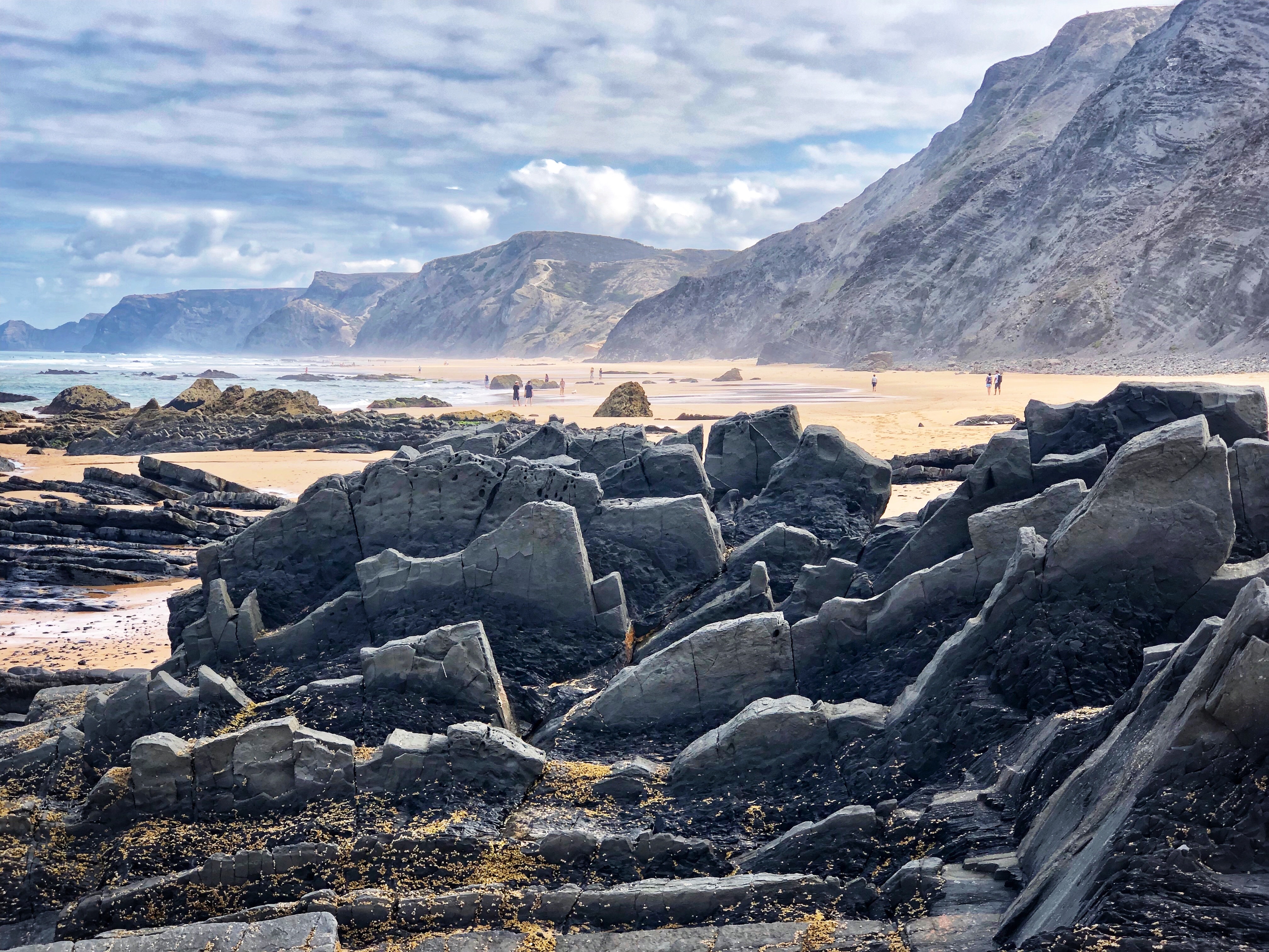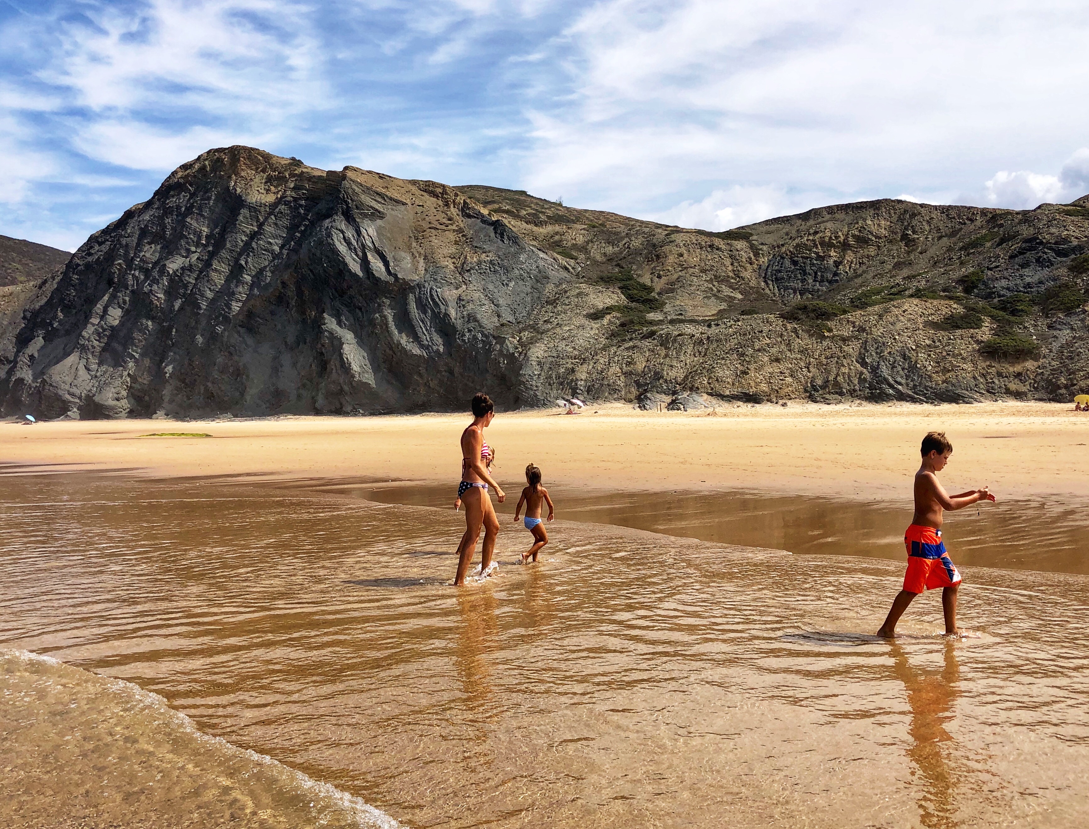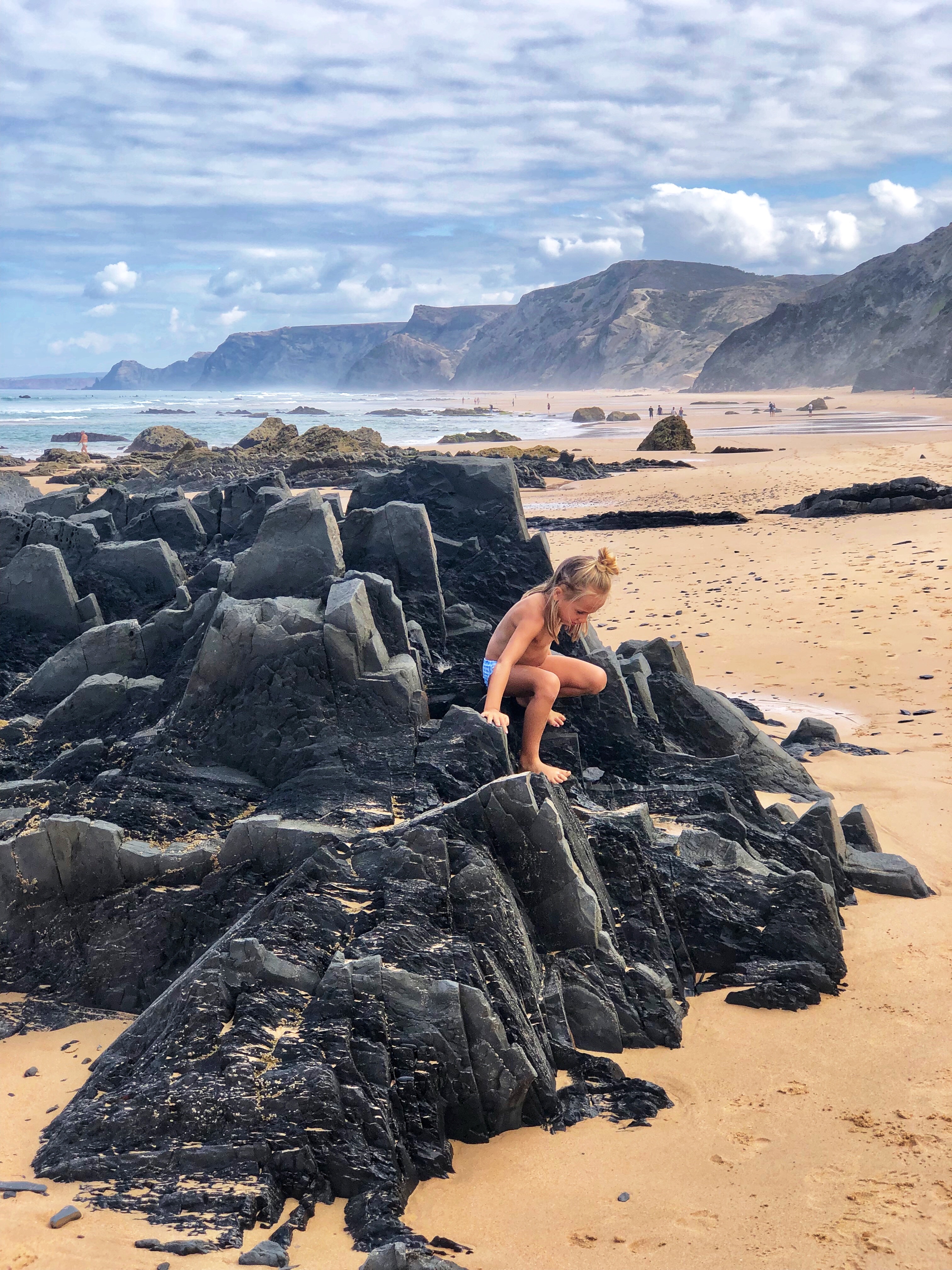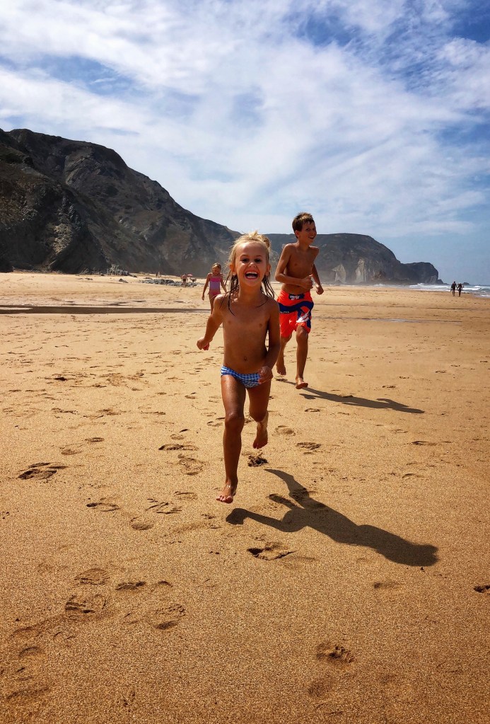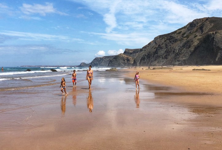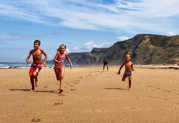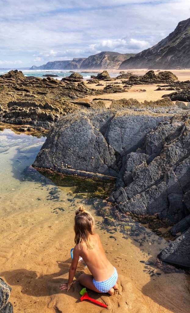 After a couple of days of cliffs and monoliths, daddy was eager to get back to the vast beaches with huge surfy waves so we spent our last day at Praia do Castelejo on the southwest Atlantic side of Portugal. Once again, at low tide a large walkway between jagged rocks is uncovered and it is possible to walk between the neighboring Praia da Cordoama. Cordoama was much longer – we took a walk over there and the kids had sprint races – but we preferred Castelejo as the sandy area was larger between the cliffs and the surf, and the rock formations were unbelievable and so fun to explore. At this point in the journey I ran out of words to describe just how cool these beaches were.
