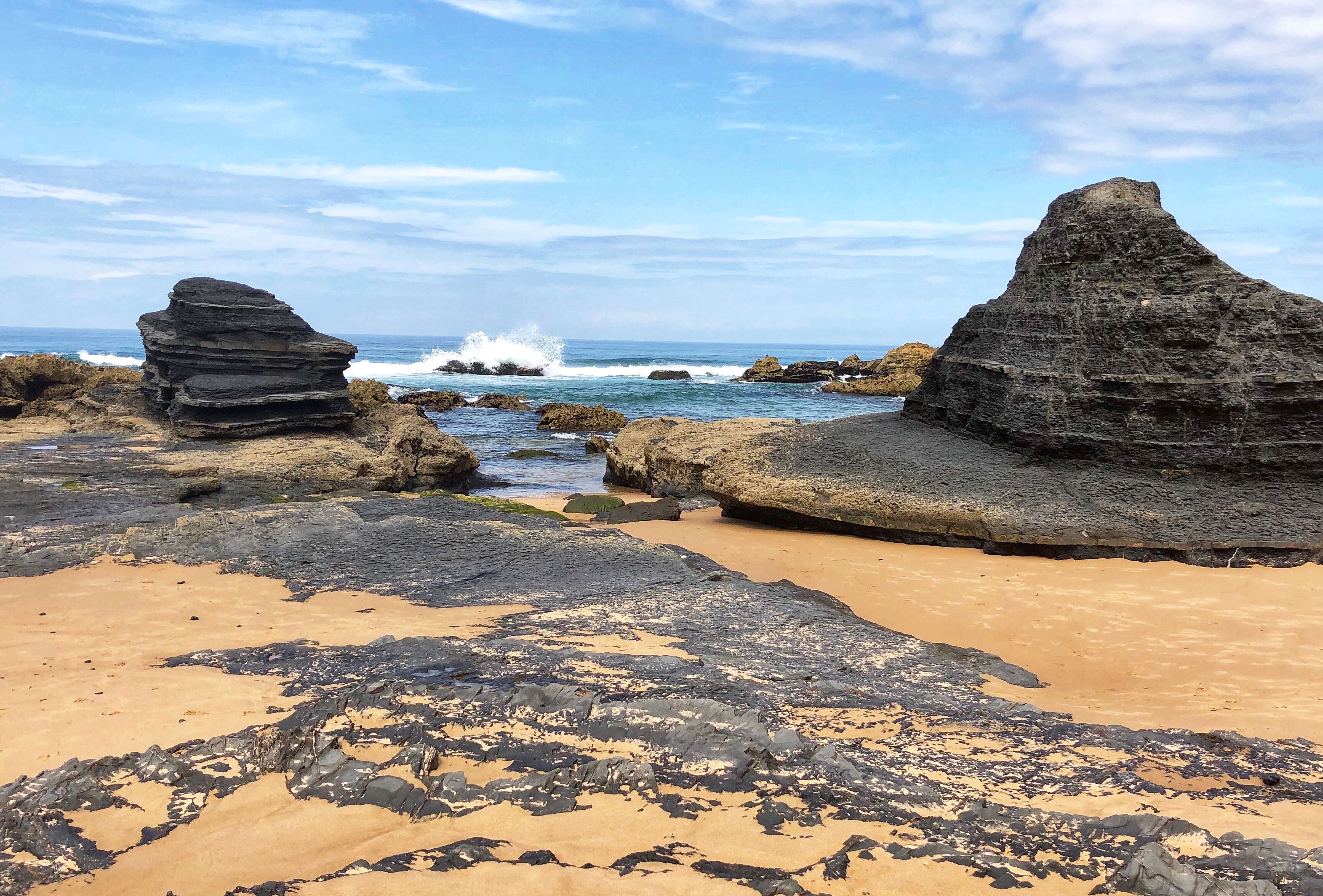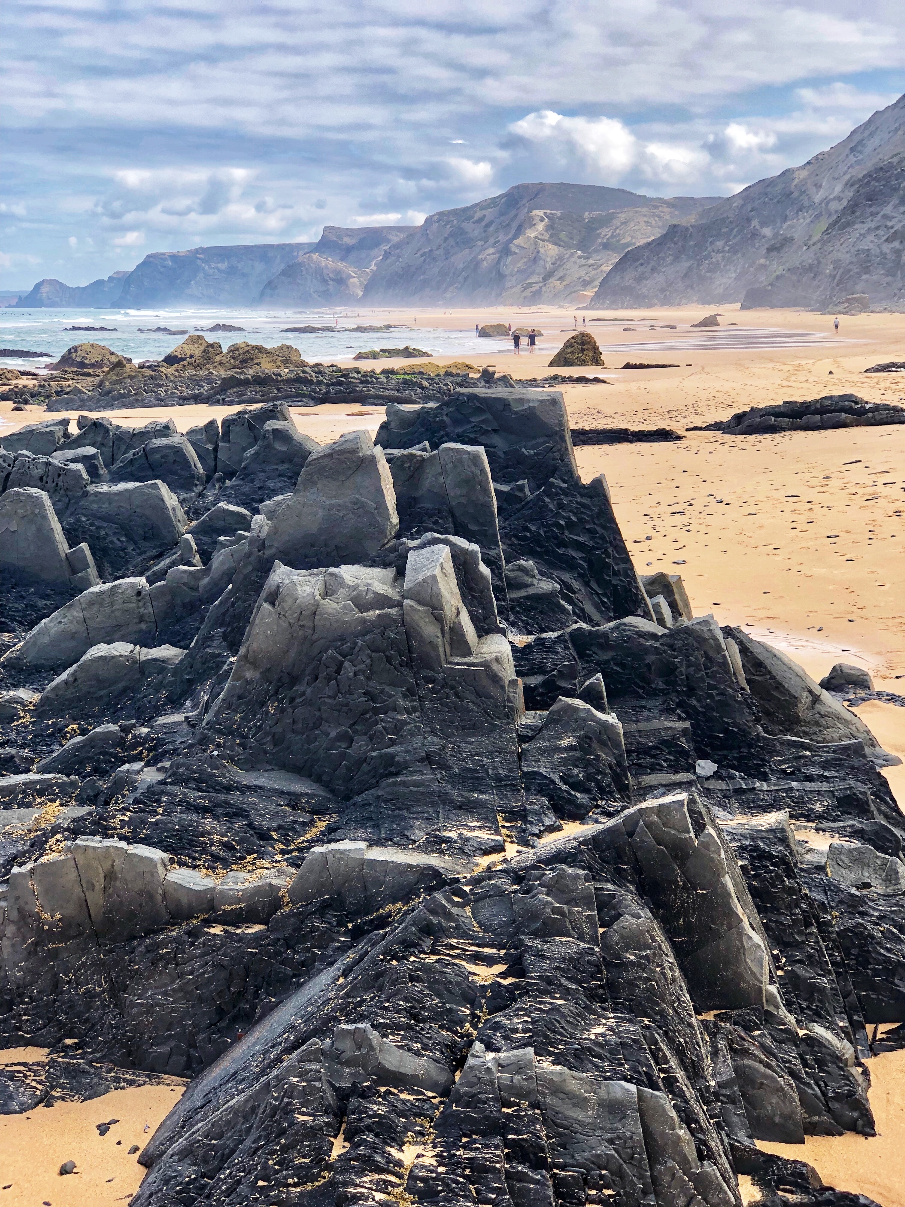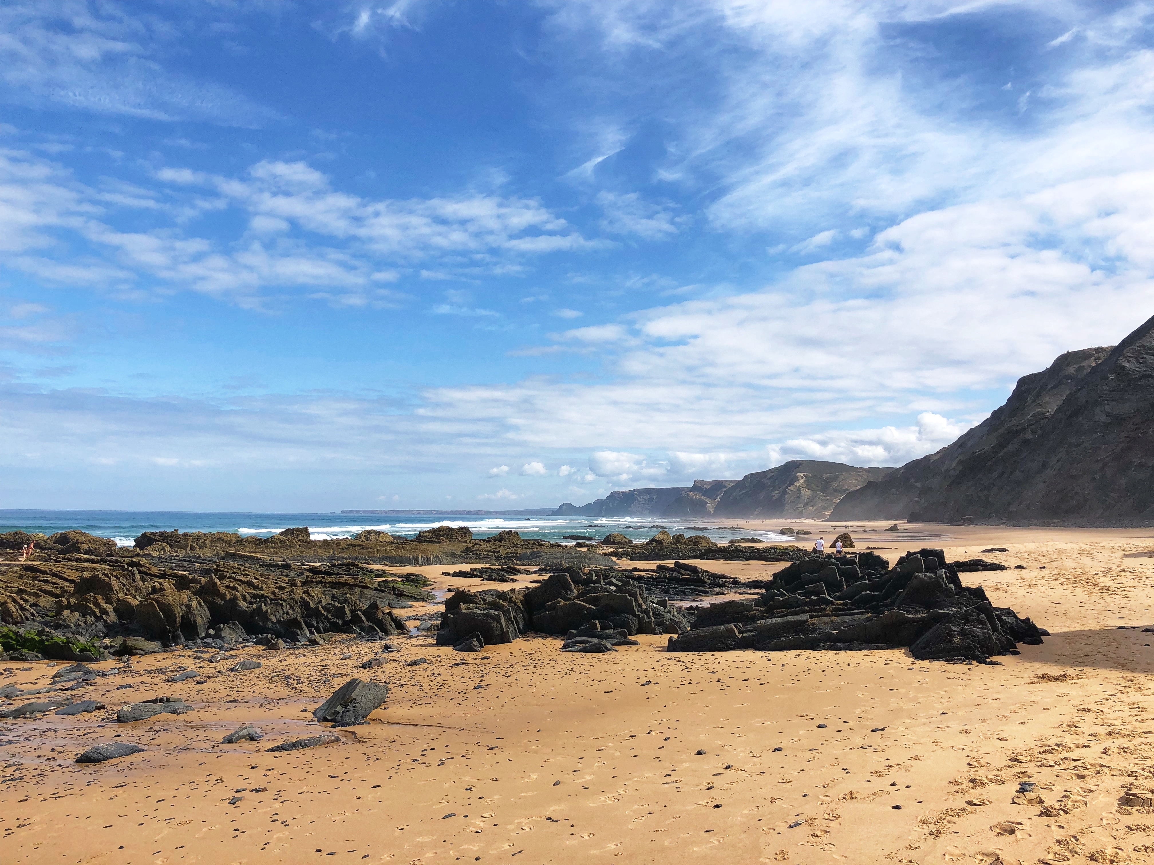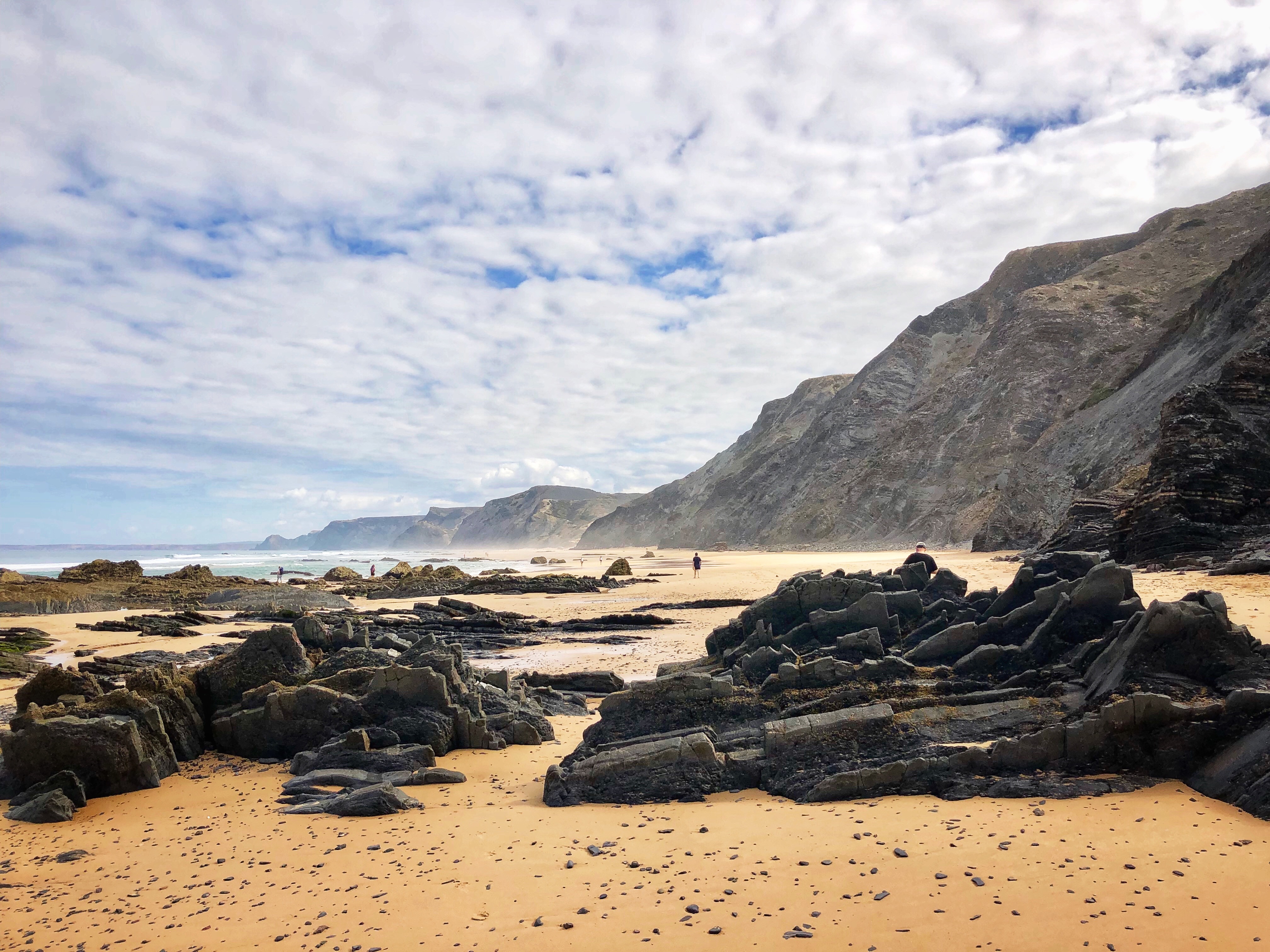 After a couple of days of cliffs and monoliths, daddy was eager to get back to the vast beaches with huge surfy waves so we spent our last day at Praia do Castelejo on the southwest Atlantic side of Portugal. Once again, at low tide a large walkway between jagged rocks is uncovered and it is possible to walk between the neighboring Praia da Cordoama. Cordoama was much longer – we took a walk over there and the kids had sprint races – but we preferred Castelejo as the sandy area was larger between the cliffs and the surf, and the rock formations were unbelievable and so fun to explore. At this point in the journey I ran out of words to describe just how cool these beaches were.