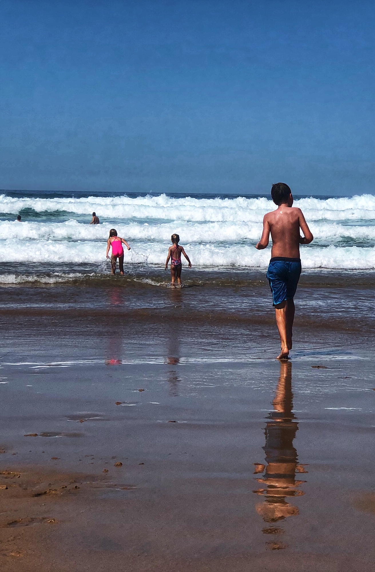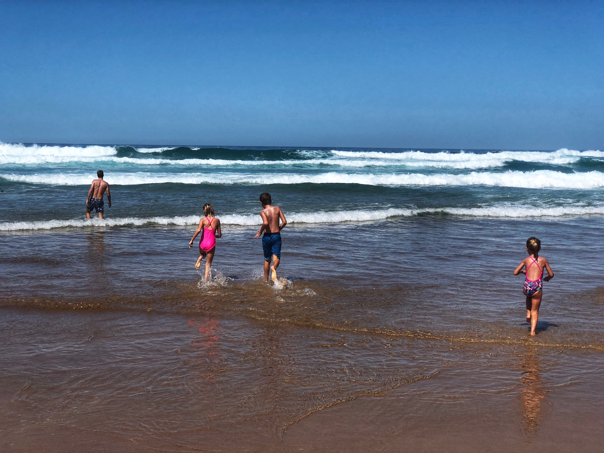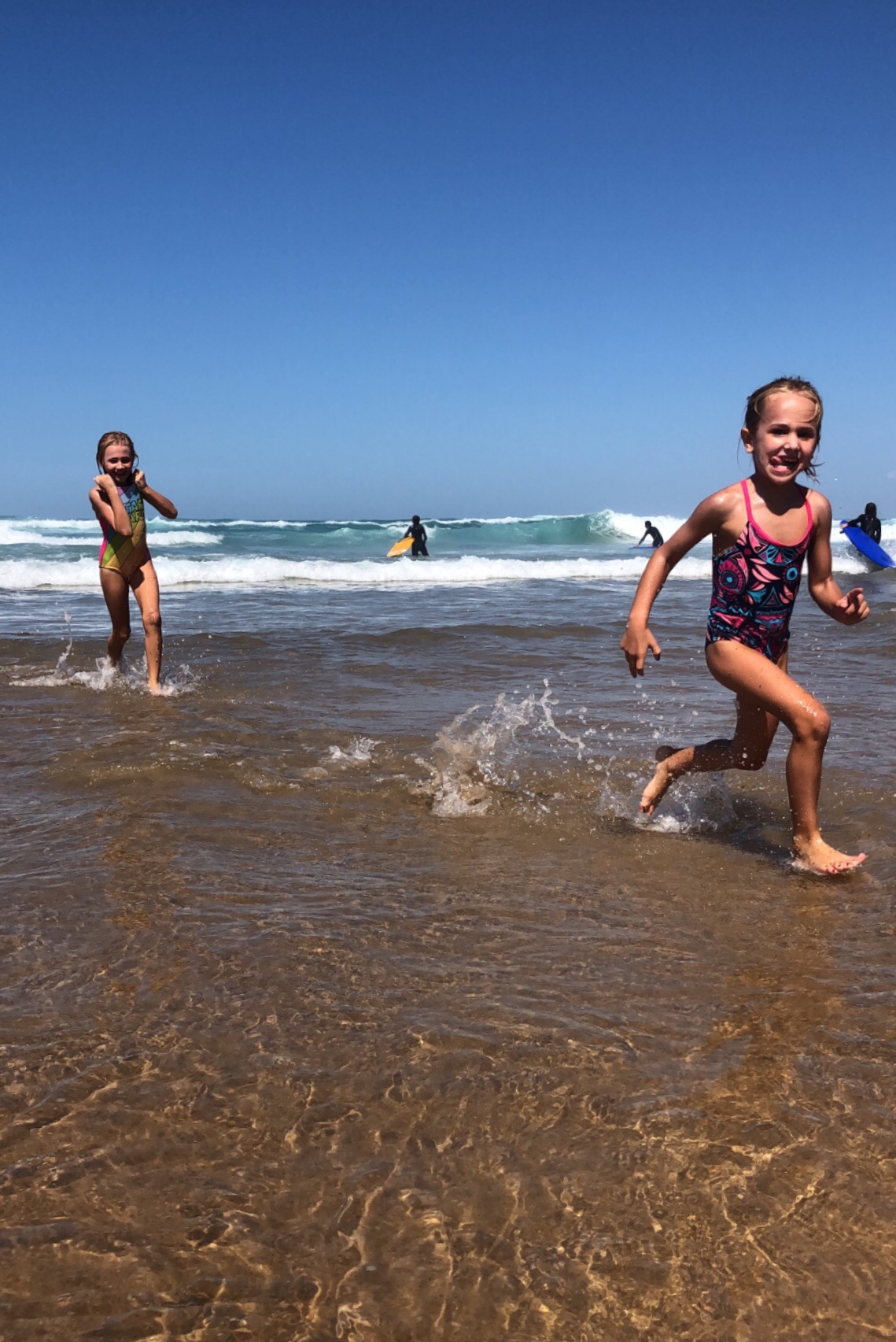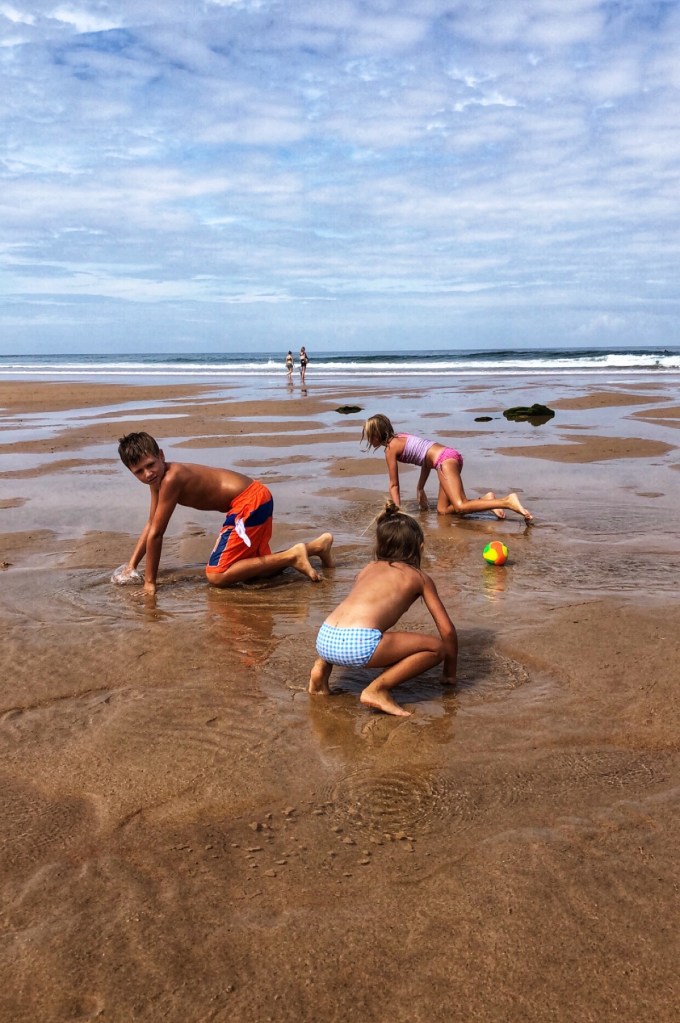 We arrived just before noon time so parking was sparse. We just got lucky and found a free spot at the top of the hill; it was loaded with surfers in their little vans all along the side of the road! At the end of the day they had buckets of water they were using to “shower” with. It was hilarious! There were groups of surfers doing surf school and the water was peppered with dudes hanging loose in the waves. The kids wanted to try boogie boarding, so we added that to the list of things to consider for another day. After we found a spot to plunk our stuff down, it was non-stop in-and-out action on the beach for the rest of the day.
