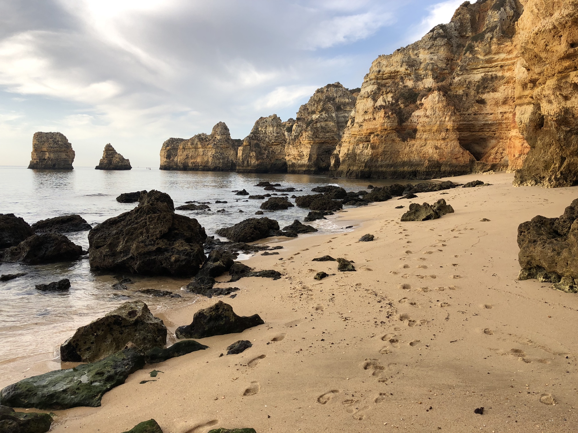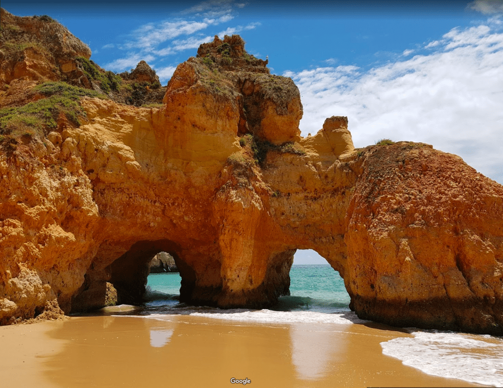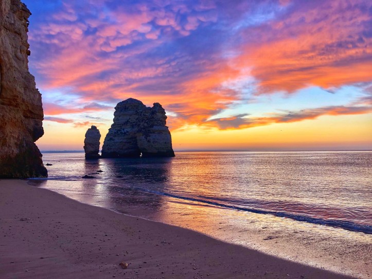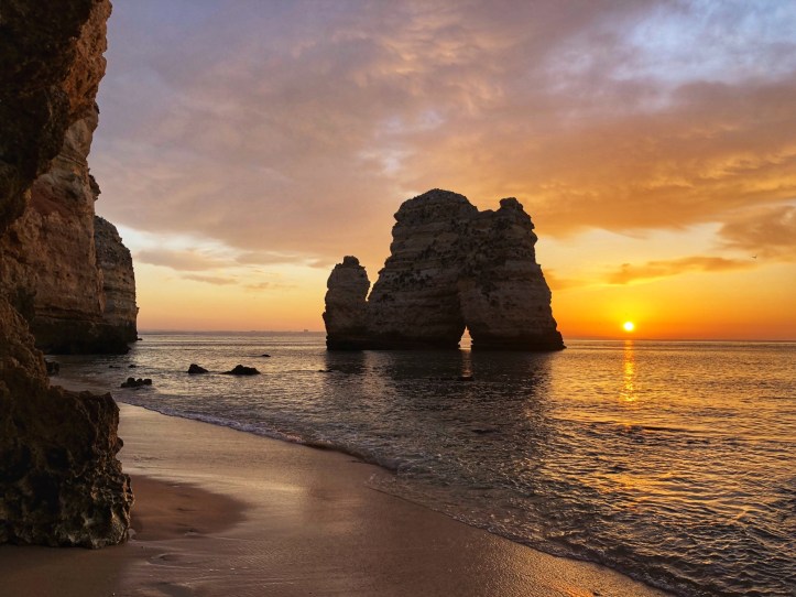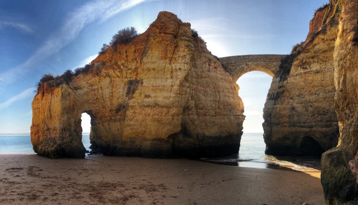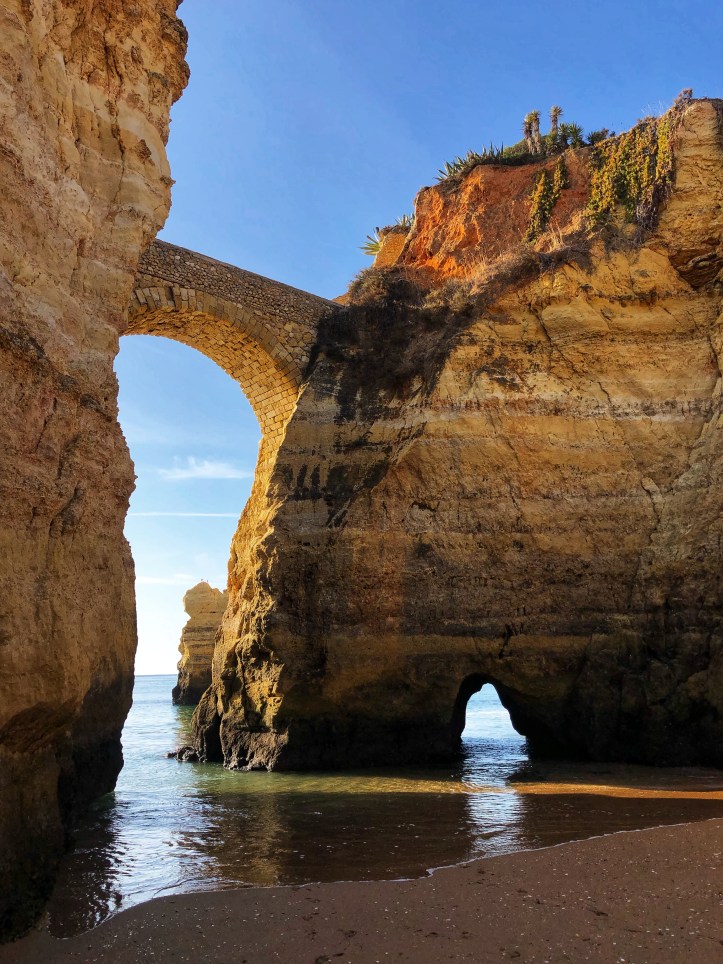 Very close to our apartment was a small parking area near a couple of beaches – Praia dos Estudantes and Praia da Batata. The stairs led down to one part of Student Beach, and true to form, a cliff tunnel led to a second part of the beach, where a beautiful stone archway connected two monoliths – the Lagos Roman Bridge. It was so nice to see this in the light of the morning with very few early birds on the beach. The lighting was perfect and the water was low so we didn’t even need to get our feet wet!