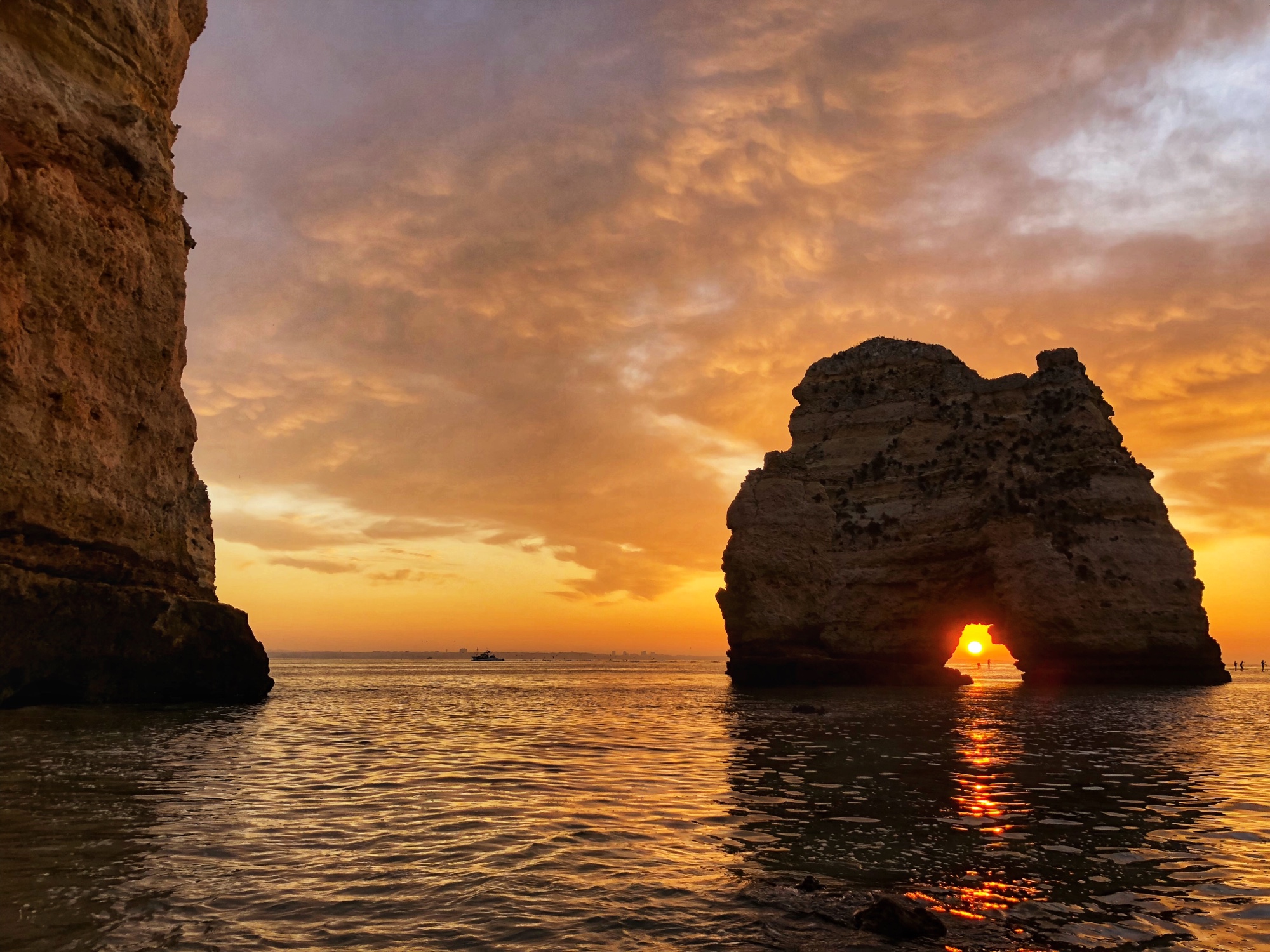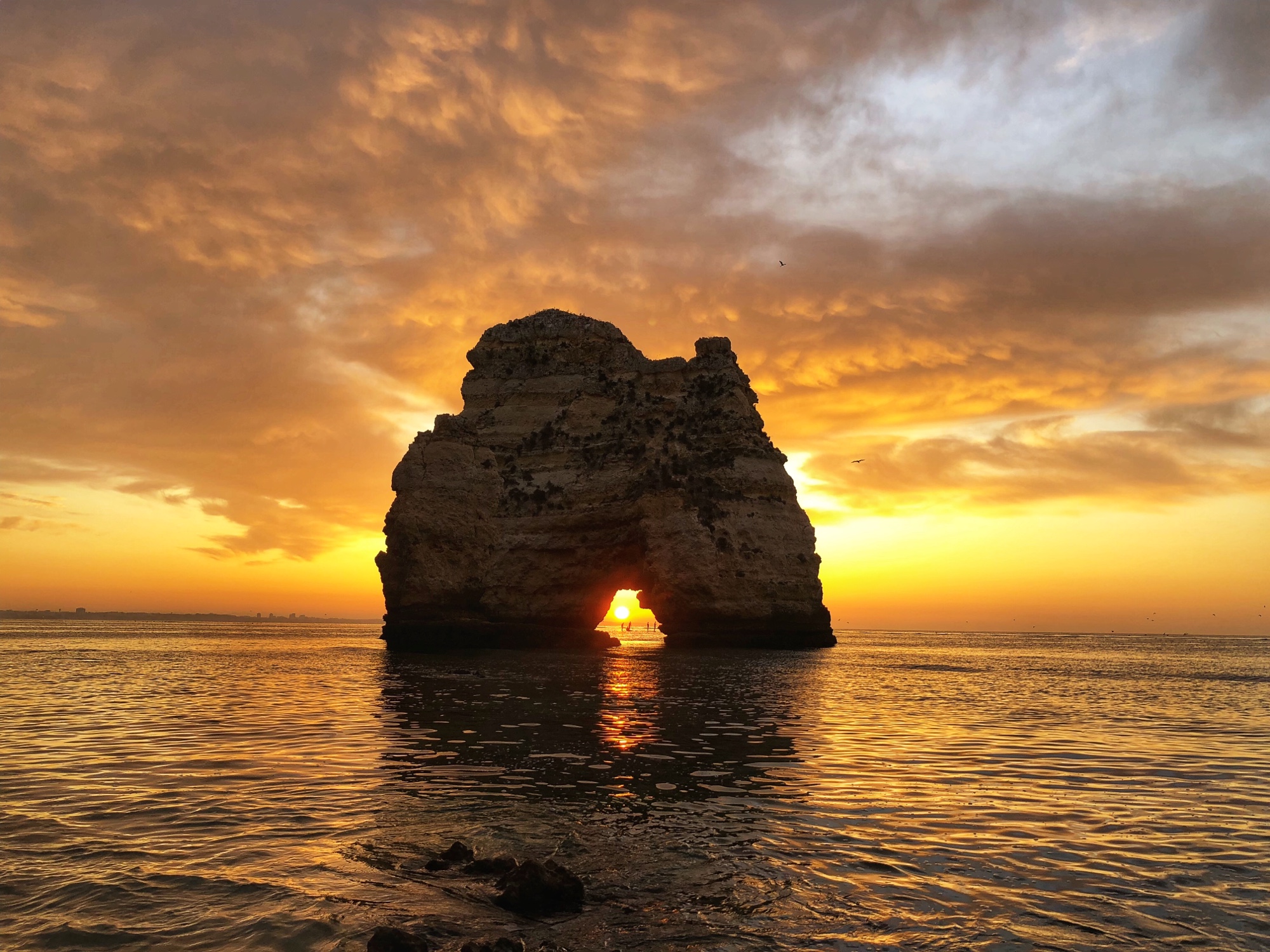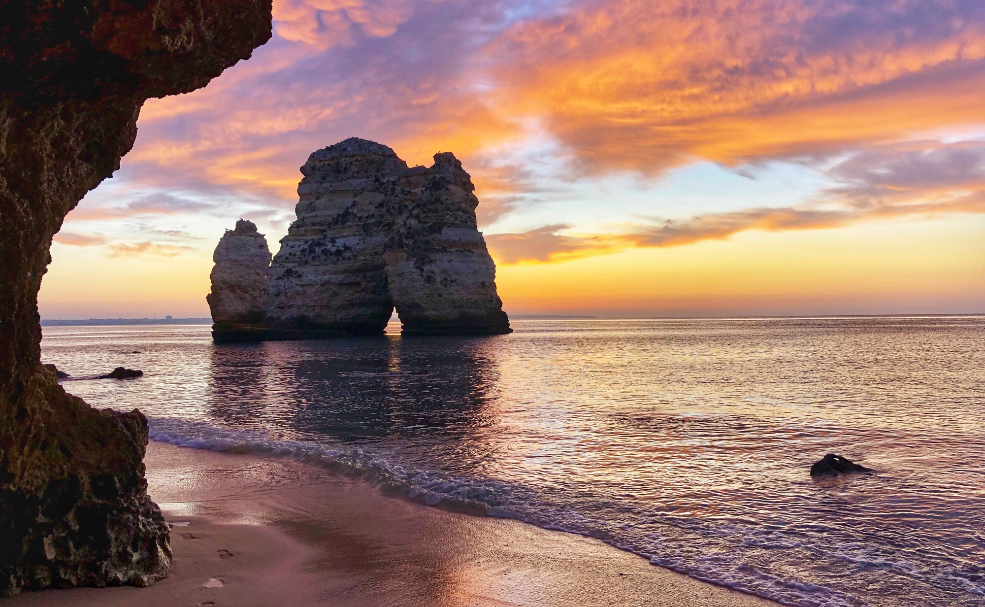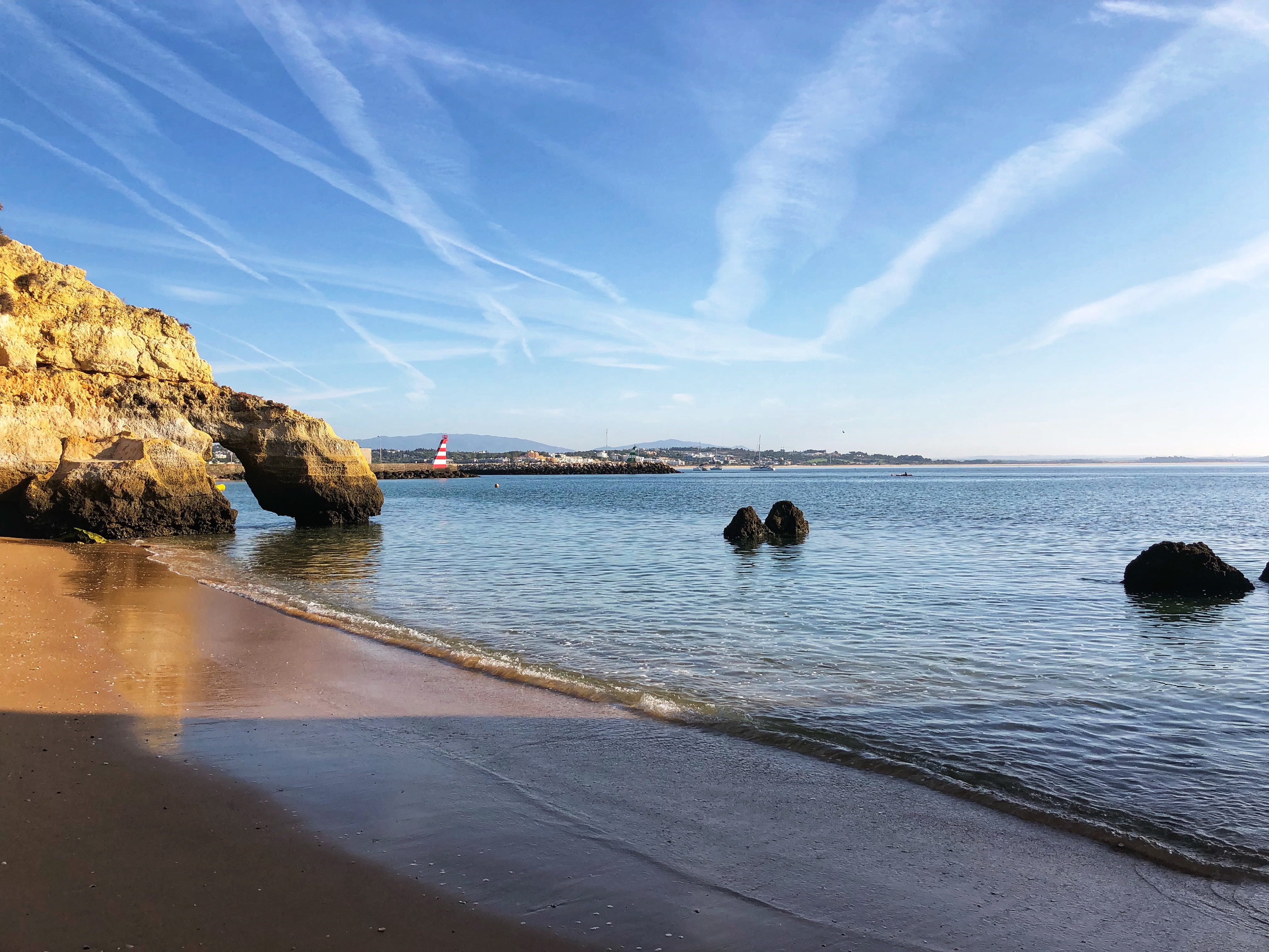 Very close to our apartment was a small parking area near a couple of beaches – Praia dos Estudantes and Praia da Batata. The stairs led down to one part of Student Beach, and true to form, a cliff tunnel led to a second part of the beach, where a beautiful stone archway connected two monoliths – the Lagos Roman Bridge. It was so nice to see this in the light of the morning with very few early birds on the beach. The lighting was perfect and the water was low so we didn’t even need to get our feet wet!