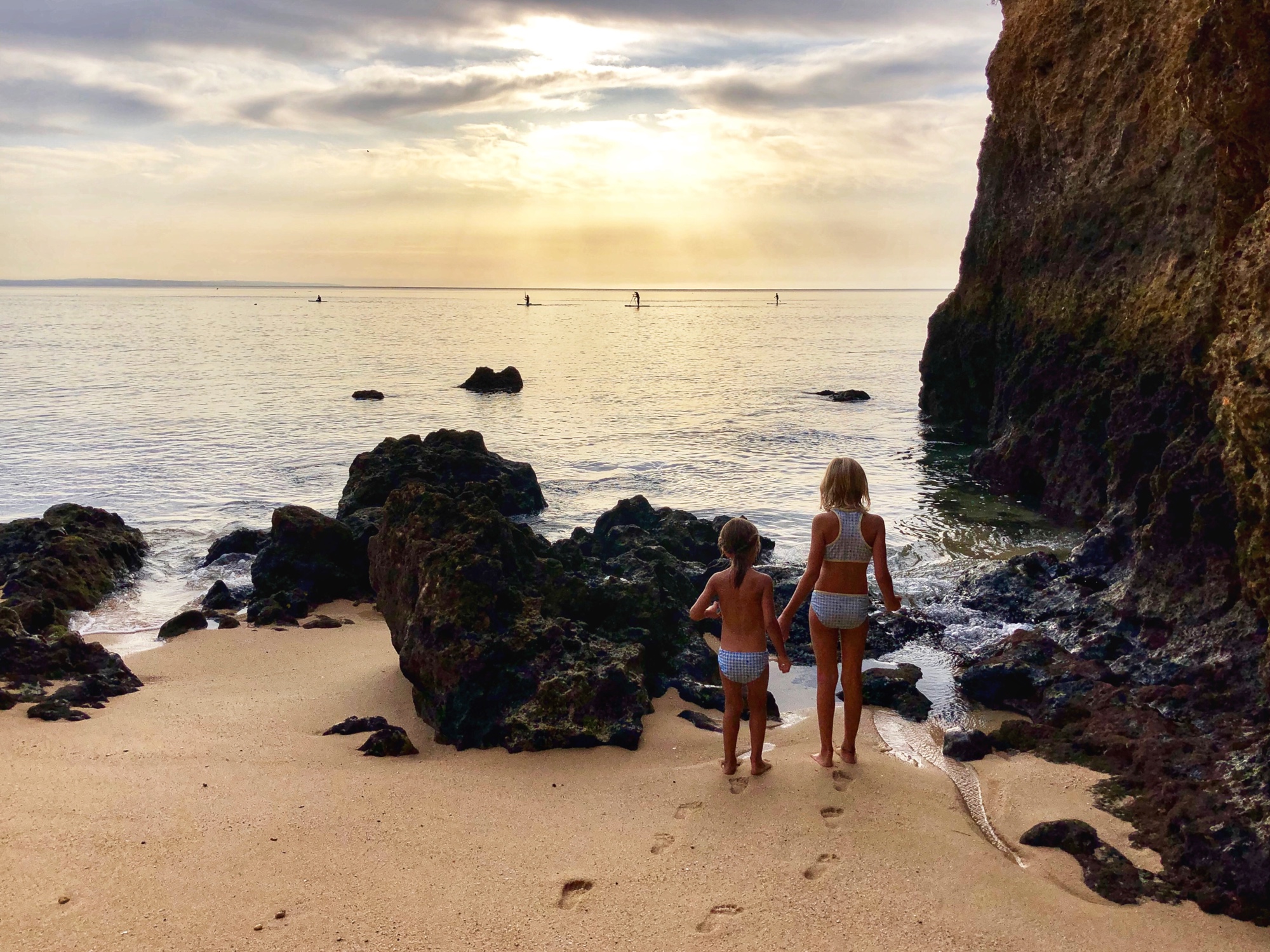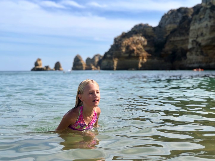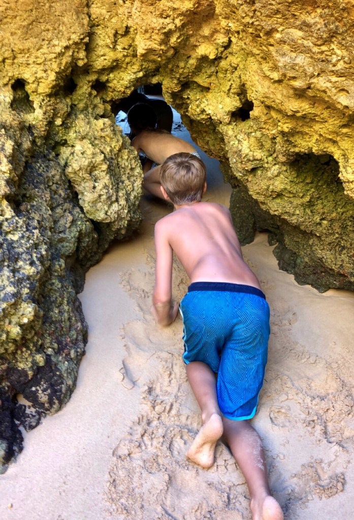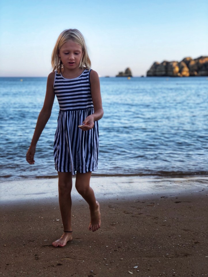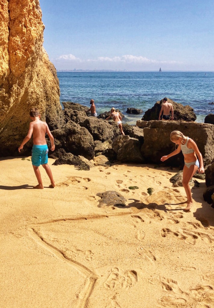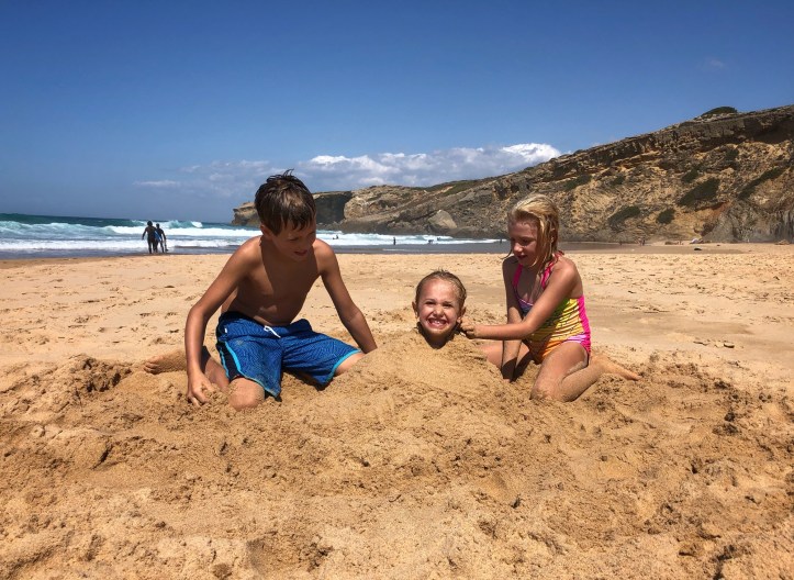 The kids did some school work between boogie boarding on epic waves, climbing rocks and spotting crabs, and digging in the sand. Middle one loved practicing handstands and little one insisted on being buried multiple times. The kids even dug a hole so deep that lil one disappeared in it! I started calling her Mowgli – the little wild thing! It’s safe to say our need for peace and family time was perfectly quenched in Portugal’s Algarve region. All of us ended up well rested, very brown, and with sand in places where the sun don’t shine.