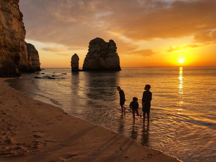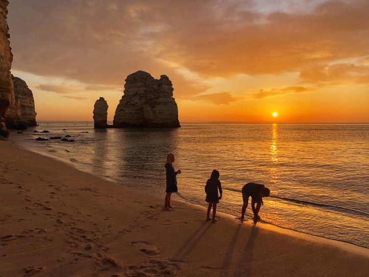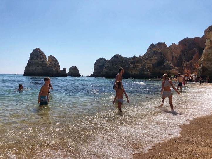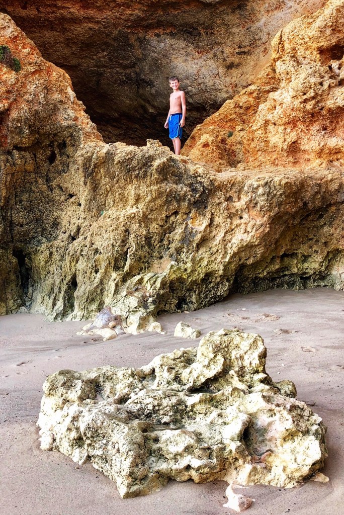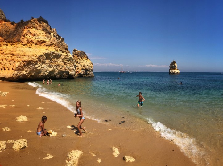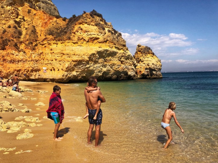 We took another quick peek at the Ponta da Piedade cliffs and then headed straight for another beach I was very excited to see. The theme of the day turned out to be “climb down to the beach,” and the kids were becoming experts at it at this point, so they weren’t daunted at all when I told them they had more climbing to do. “Can I just use bare feet??” asked middle one, and I said yes – and followed suit with my own bare feet.