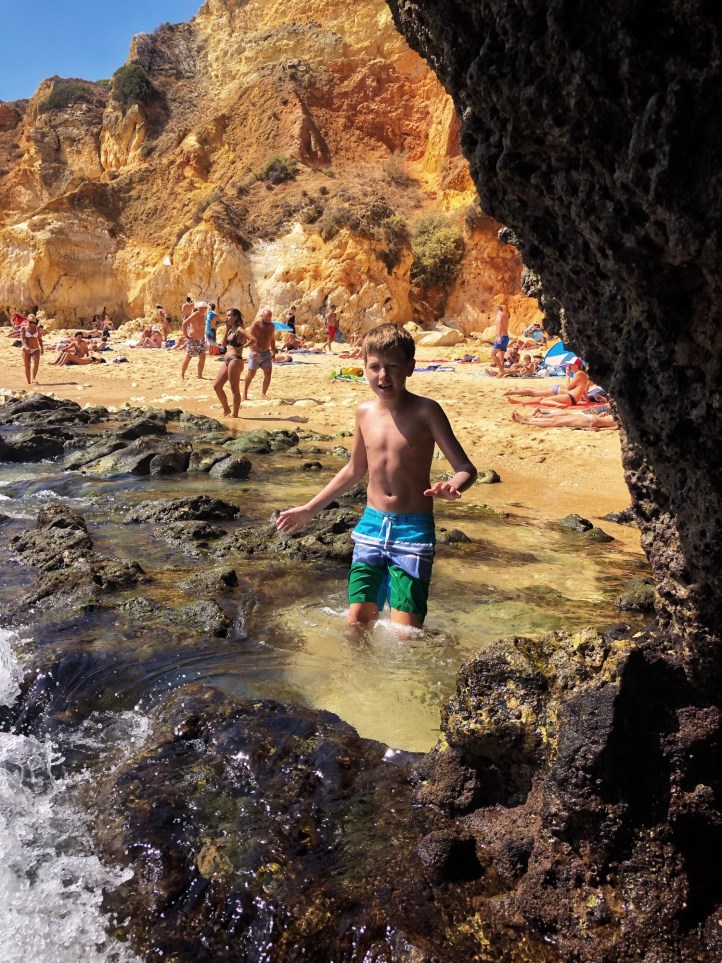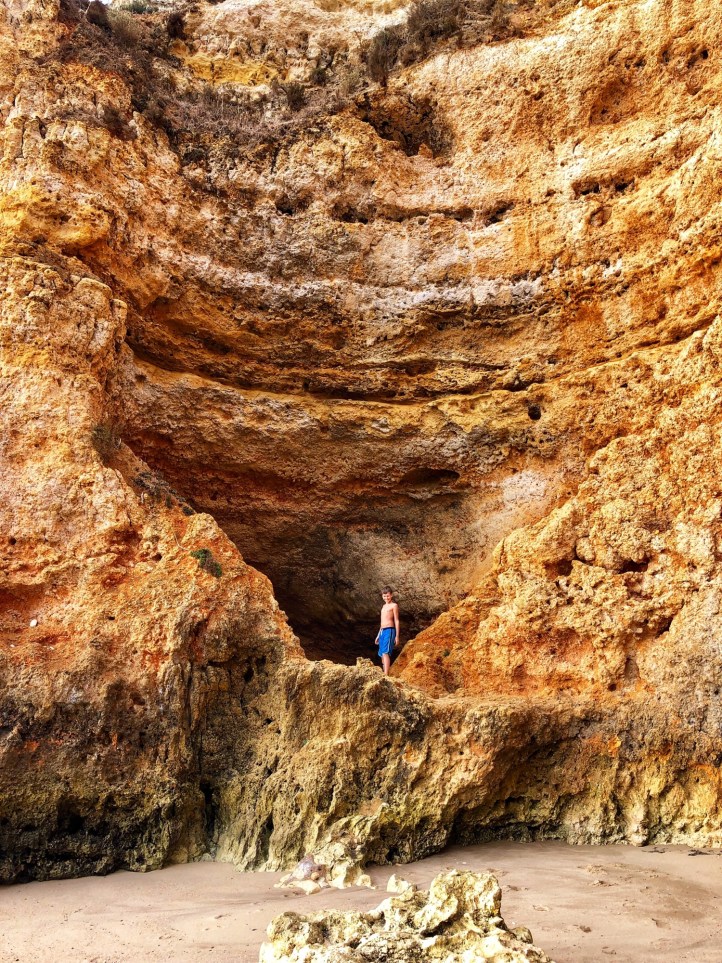 The next day we awoke to the most amazing red sunrise! Big bro always gets up early, so it was no surprise to see him making a cup of tea and a little breakfast sandwich to take out onto the balcony and watch the sun come up. Such a little man! We got ourselves ready and made a pitstop at the store for breakfast. Then we drove about 30 minutes east along the coast to the Benagil Caves. We parked in a huge free lot at the top of a hill and were early enough that there was ample space, and then walked down to the beach. Mommy didn’t do research on this place very well, and we quickly realized that most people were visiting the caves via a boat tour or kayak rental. We didn’t want to bother ourselves with such things, and noticed there were plenty of folks swimming from Benagil Beach around the cliff to the caves. I figured that was going to be our best bet.