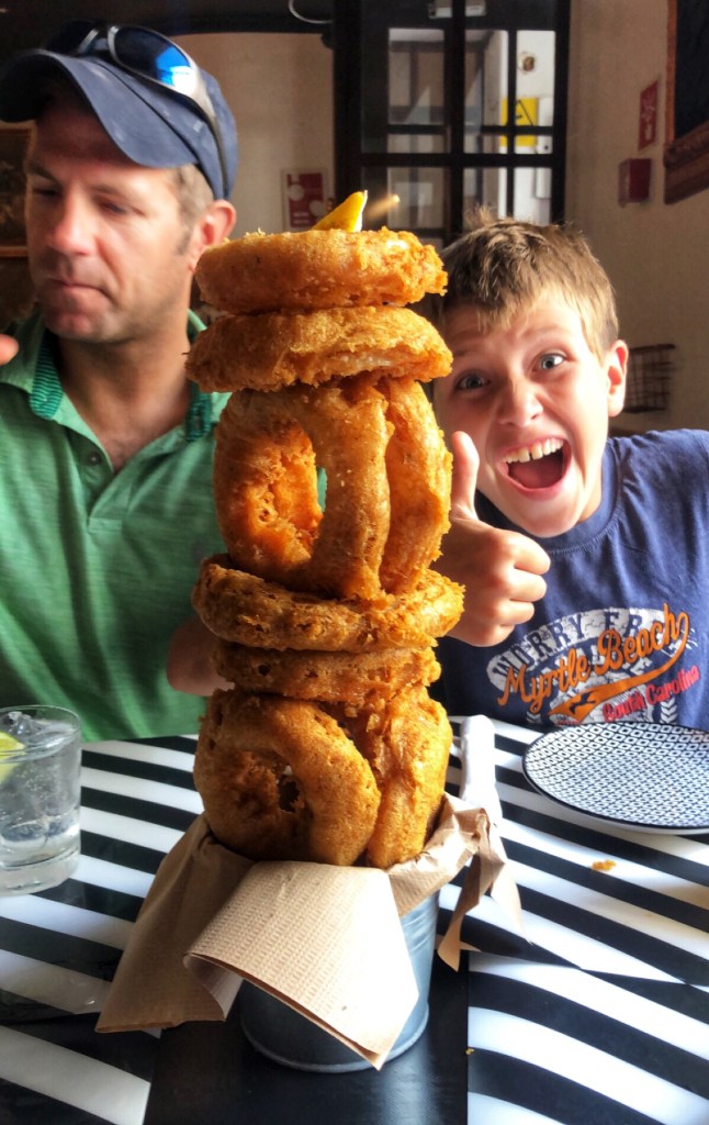 We regrouped and headed into town for dinner. We all had a hankering for seafood so we found a great place called “Ol’ Bastards” that served delicious fish tacos and an onion ring tower over a foot high. The kids still wanted to be able to walk down to the beach after dinner, so we made a point of eating early enough that we could catch the sunset on the beach near our apartment. So far everyone in restaurants and in town spoke perfect English (we do not speak Portugese) so that made things very convenient. The food was delicious, and we all stuffed ourselves. It was nice to log some miles, too – each day we ended up with 3-5 miles walked. It may have been relaxing, but it was also an active vacation for sure!