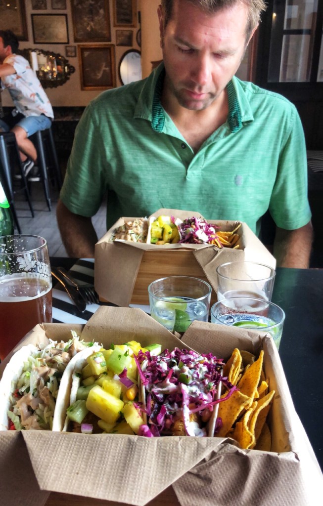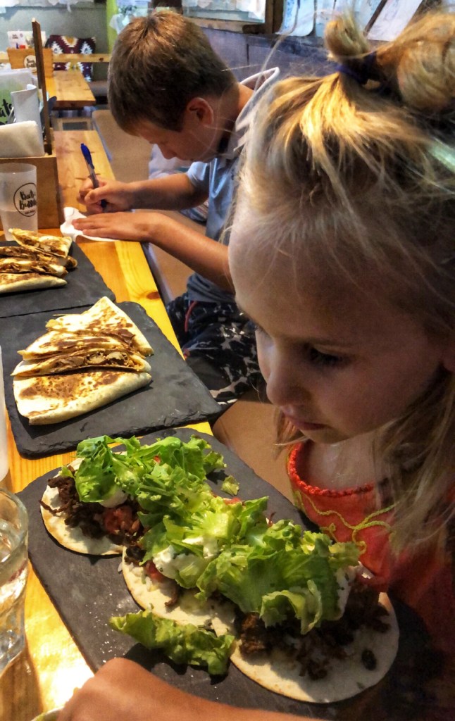 From there we walked back down into the old part of Lagos to scope out “Beats & Burritos,” a super hip joint serving all sorts of fresh Mexican favorites. The walls were covered with napkins that patrons had decorated with artwork and the kids were amazed by it. “Can I make one?” Middle kiddo asked. “Of course you can,” said the waitress, again in perfect Kiwi English. All three kids kept busy decorating napkins and when the food came we gobbled down quesadillas, burritos, guac-a-nachos, tacos and a yummy taco bowl. I was impressed by the high quality of ingredients, the cute atmosphere and great service, and especially the price. This place is not to be missed – there’s something for all diets.