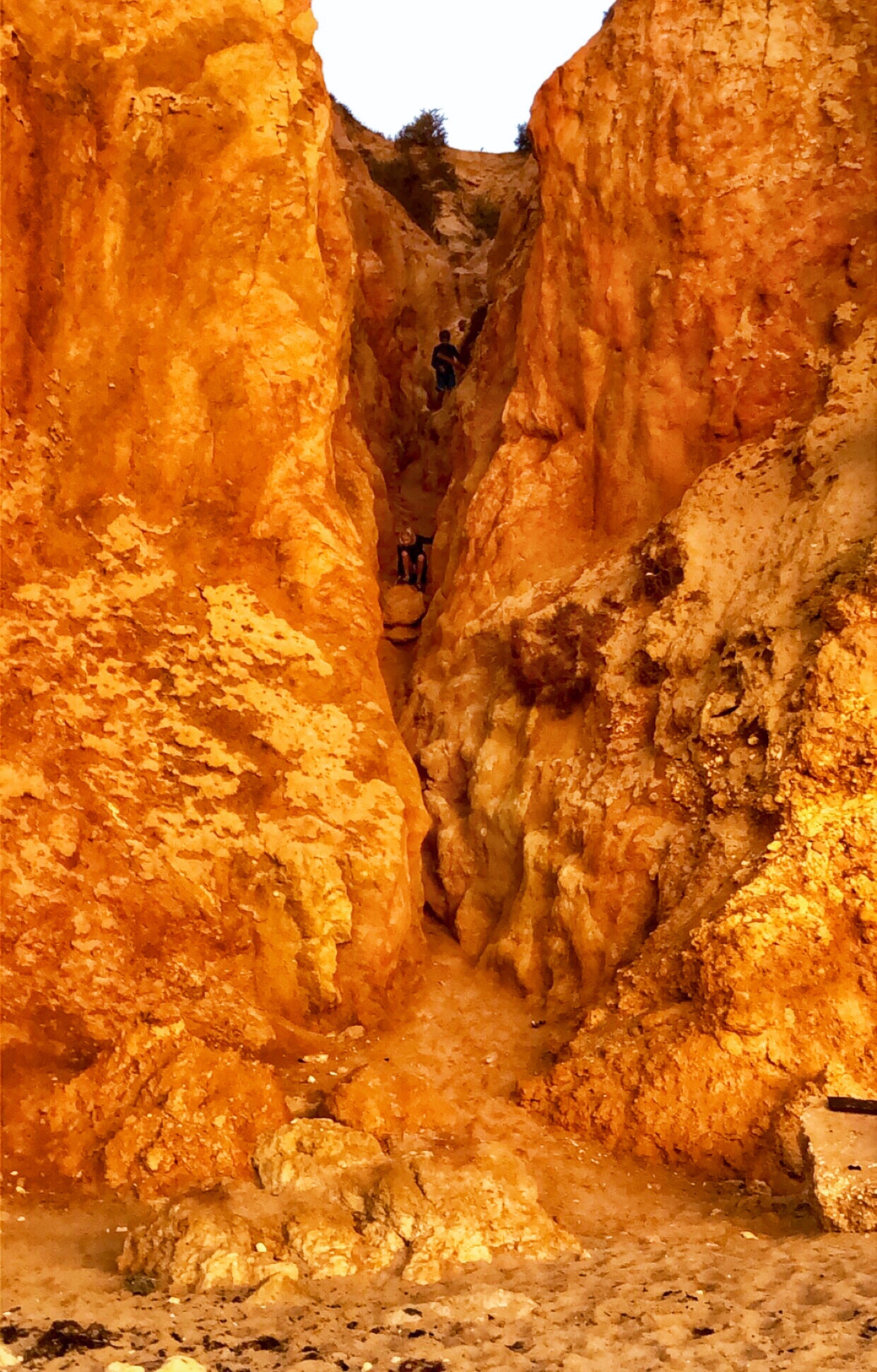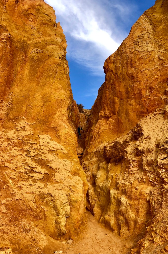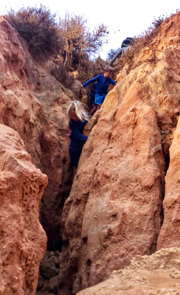 I was determined to catch a sunrise ON the beach, so the next day we got up early and drove down to Ponta da Piedade to take in a sunrise on the water. It was a daunting task – we knew from our first day that the climb down to the beach was formidable. It was a total crapshoot as we hadn’t done this climb before, but we prepared the children that it would be challenging and even a bit dangerous, so to use all of the things they learned about climbing to stay safe. The sun rose fairly late, around 7:45 AM, so that was an advantage for us. We found a reasonable path down to Praia da Balança, carefully walking past a tent that had been pitched right on the cliff. We slowly climbed down the crevasse using our hands to brace ourselves on either side of the wedged in walls. The orange rock was very dusty and crumbly – almost like clay. All three kids did great, climbing like little monkeys!