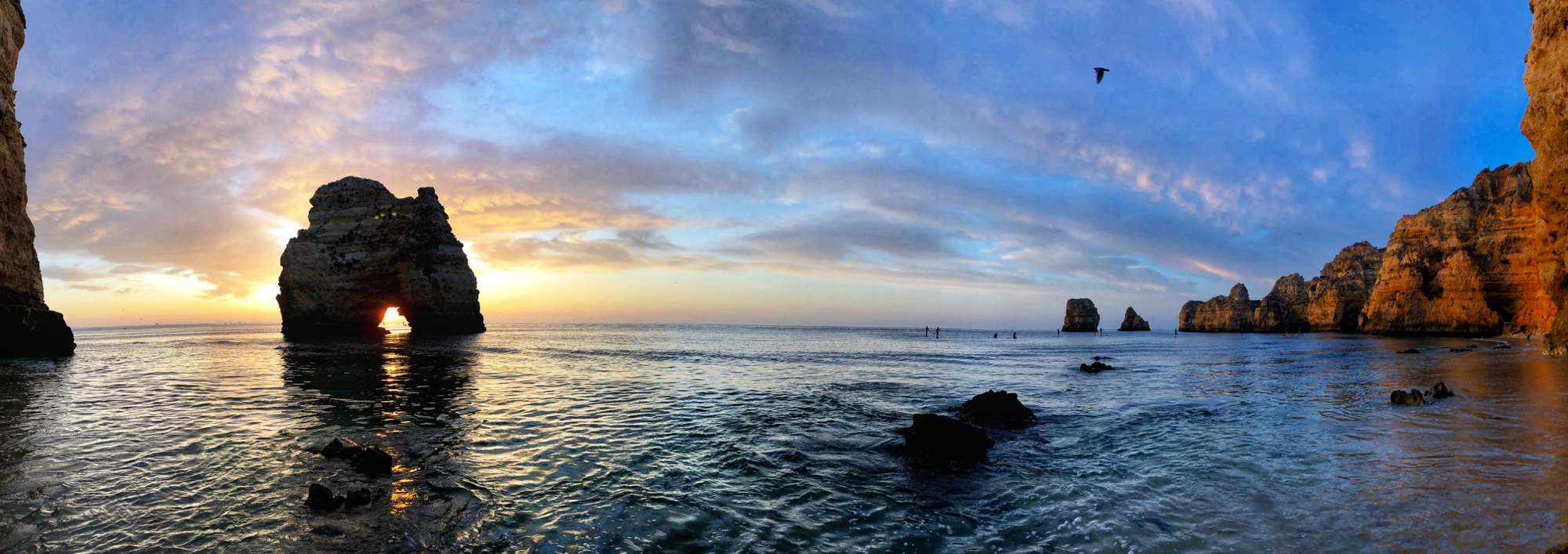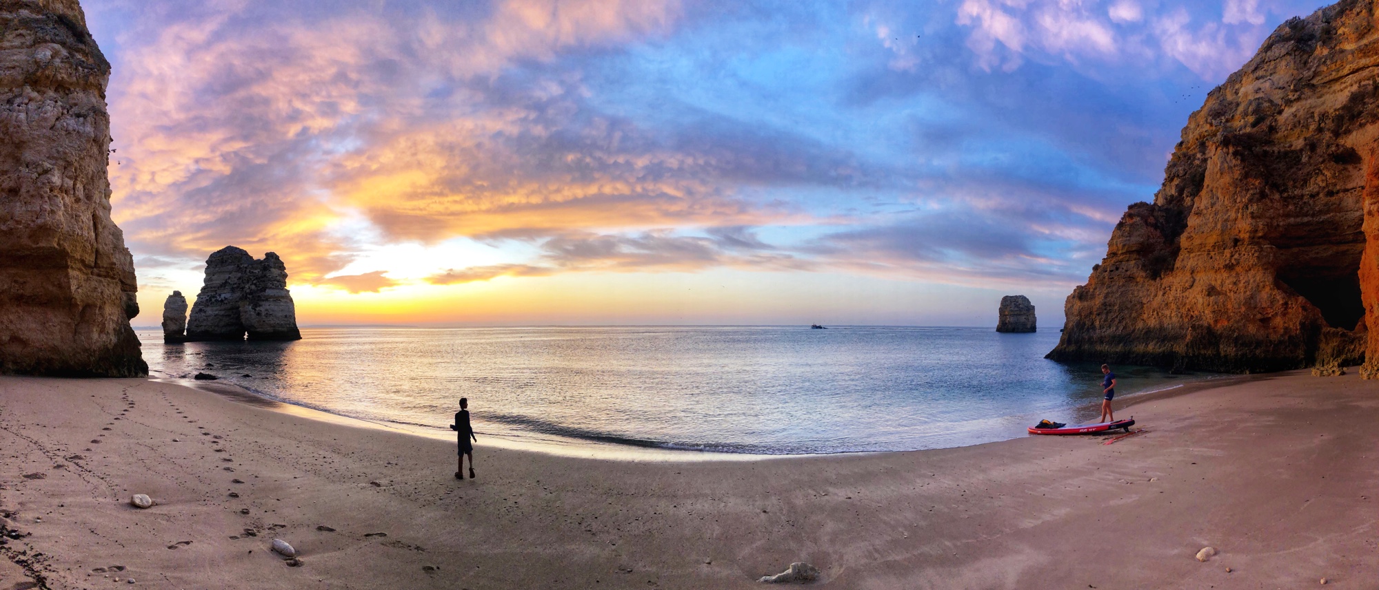 We almost had the beach all to ourselves – except for one dude who had the same idea as us. We made friends with him, a solo traveler from Utah. He was very nice and chatted for a while and took a nice family photo of us. He didn’t stay long, so we really did have the beach all to ourselves for the whole time we stayed there that morning. It was such a peaceful, still morning. The water was gentle and was only disturbed by the occasional line of SUPs or kayaks passing in the distance. It’s easy to say this was my favorite moment – even after chasing big bro down and throwing him into the water for picking on his siblings. HA! This beach is especially fun because, like other beaches, at low tide you can walk along to other little cave/beach areas and there is a little open cave-like place to climb into on the other side of the beach. The rock formations, including an iconic archway in the water, were magnificent. Below it is possible to see the entirety of the crevasse we descended, and next to it a full shot of the cliffs with the moon still visible as the sun rose.