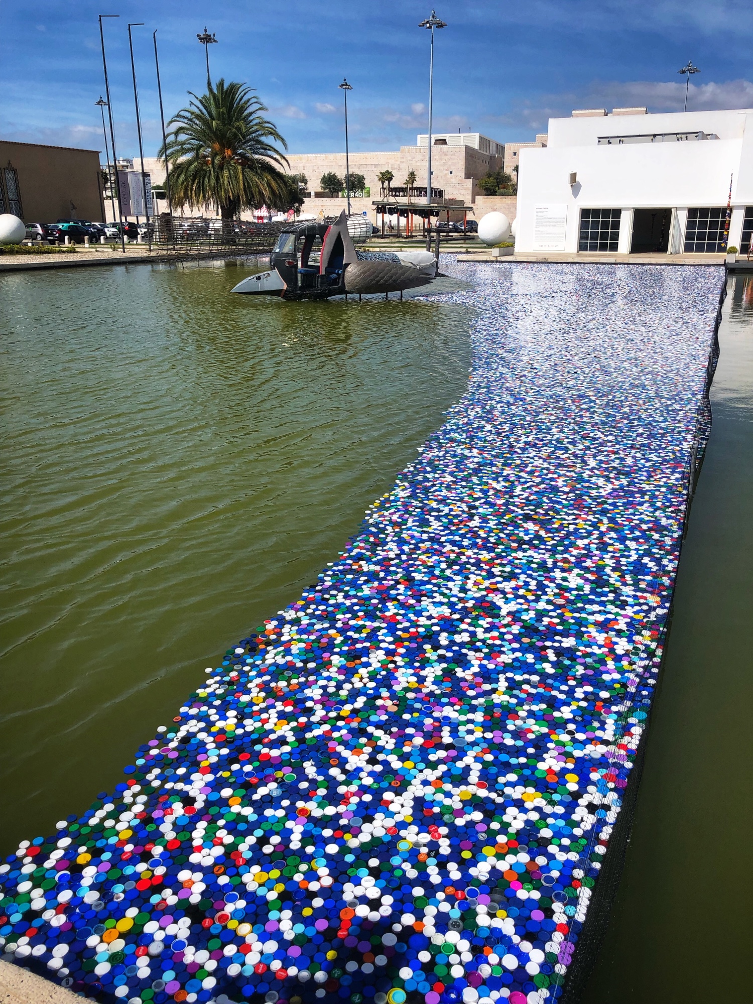 Art instillation overlooking the “golden gate” bridge and Santuário Nacional de Cristo Rei in the background