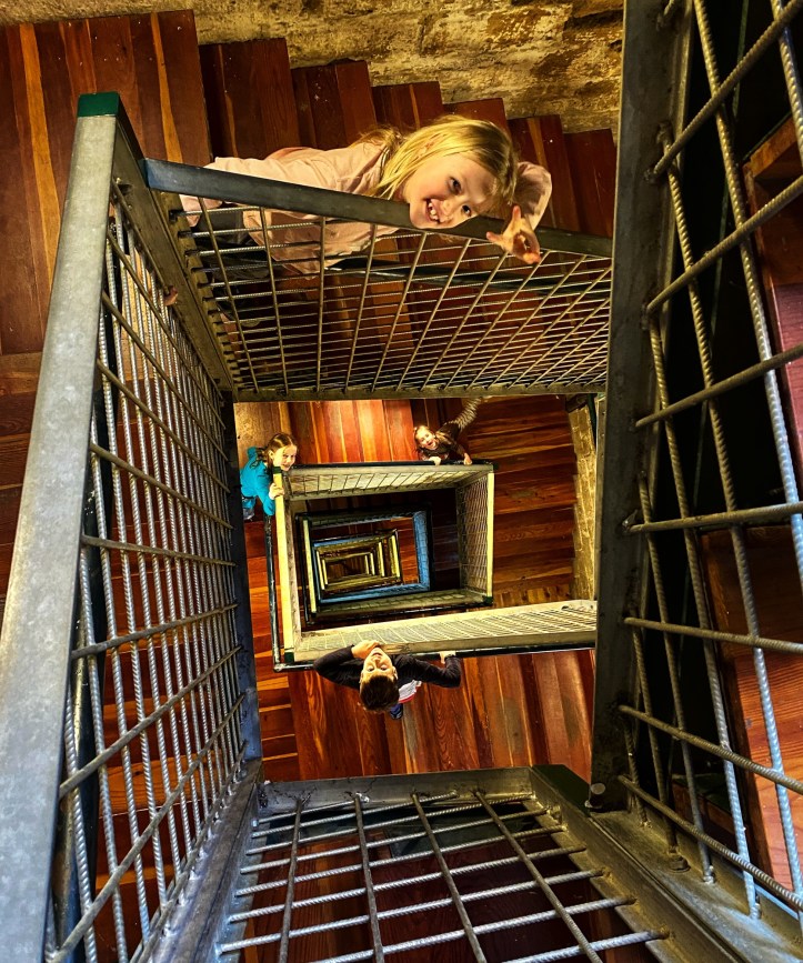 Orvieto is one of many hilltop “fortress-type” ancient towns in Italy, and this one happens to be well known for its church and tower. We made it inside the walls and were able to take in the clear, late afternoon views before venturing into the town center. The tower had just been closed as we arrived, but the four cute kids (who were antsy from riding in a car all day) seemed to convince the guard to open up the tower just for us. We paid the small entrance fee and went flying up the square “spiral” staircase to the top, where we had even more impressive views all to ourselves.