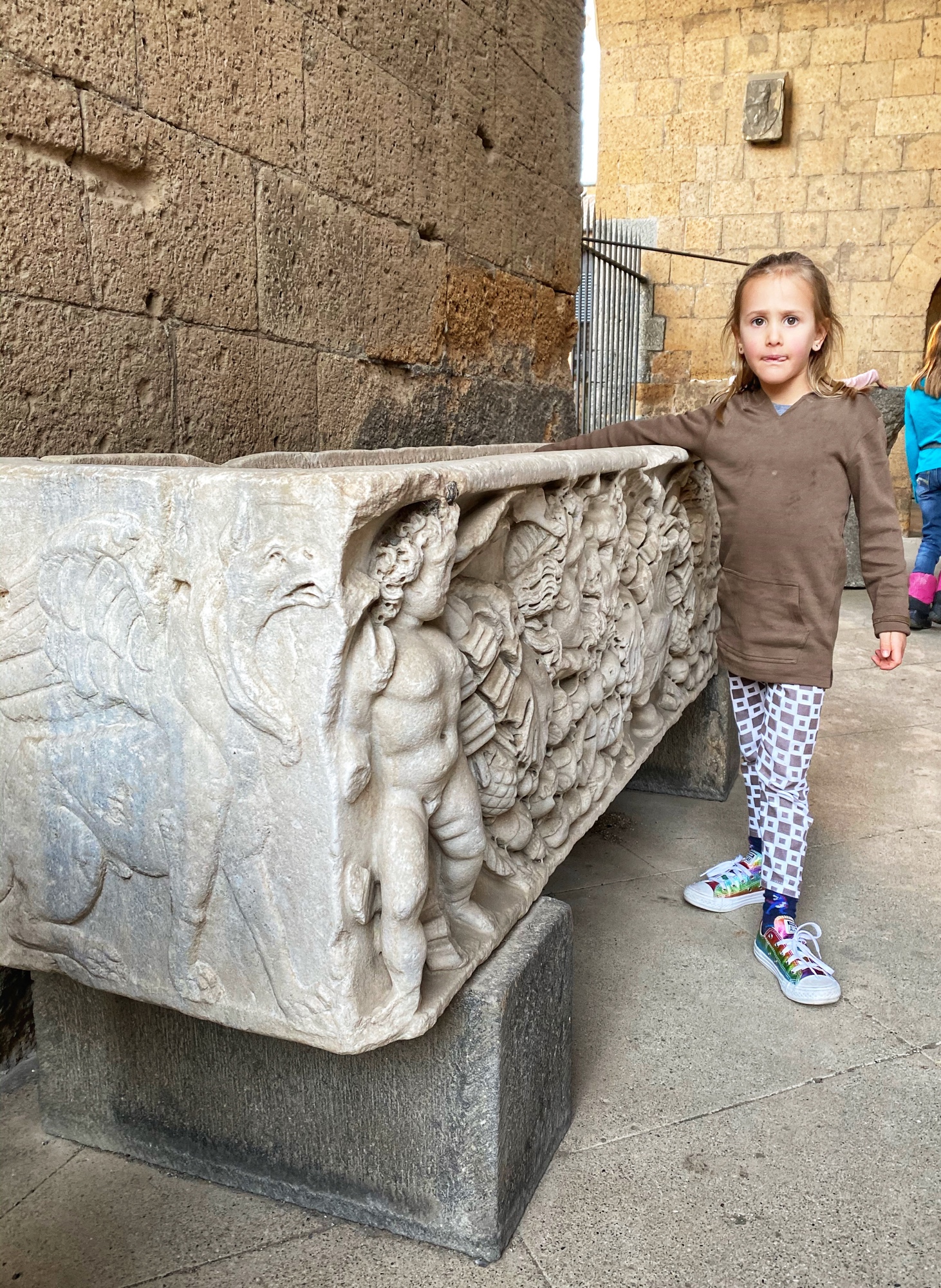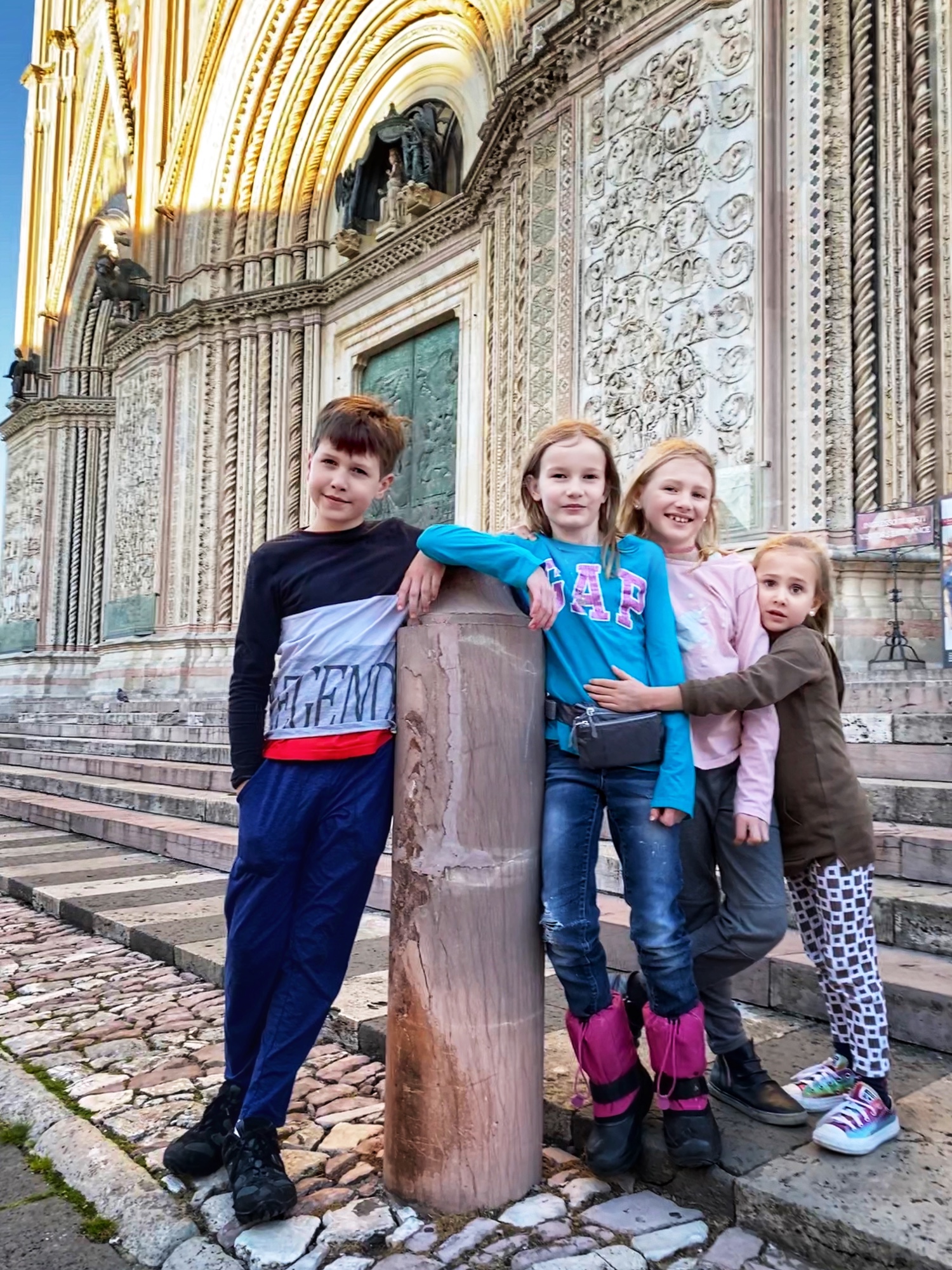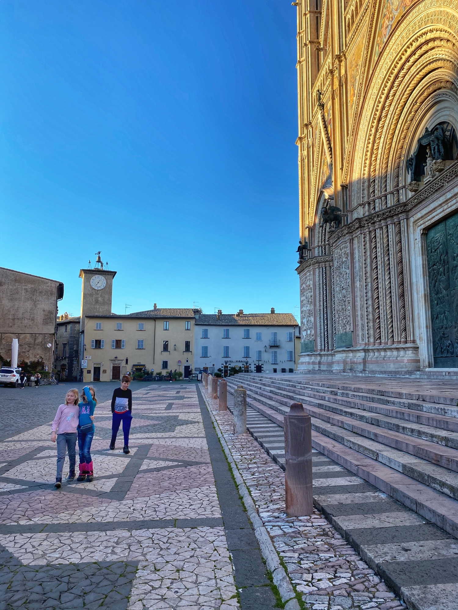 By the time we made it back down the tower and wound our way through the old town to the church, Duomo di Orvieto, it had already closed for the day. We weren’t able to see the marble Pieta statue, tour the museum or walk through any of the underground caves, but seeing the unique facade of Duomo was a sight indeed! The kids got their first taste of ancient ruins outside of the museum, and they were thrilled to be “set free” to chase pigeons and wander the beautiful mosaic stone streets.