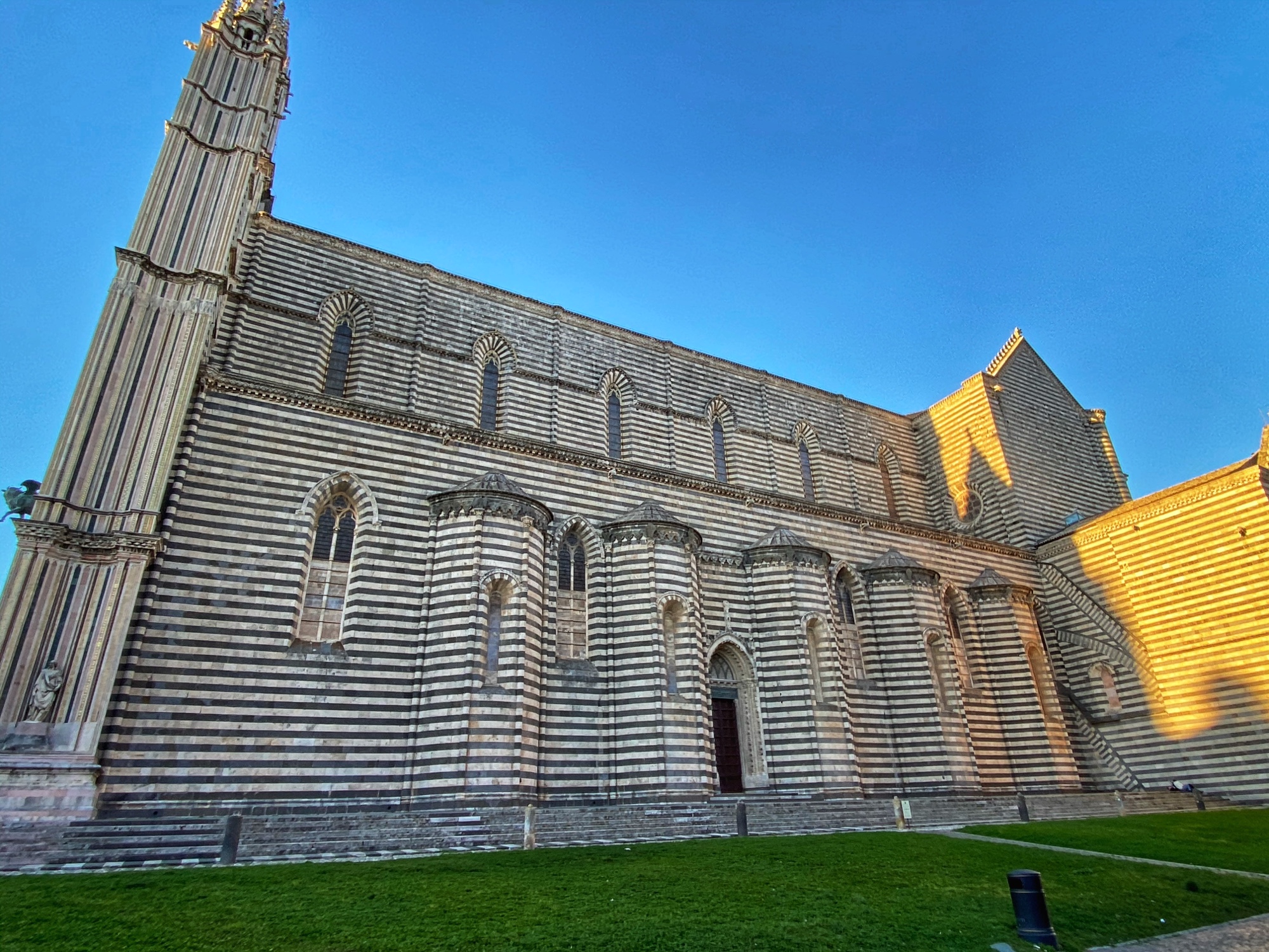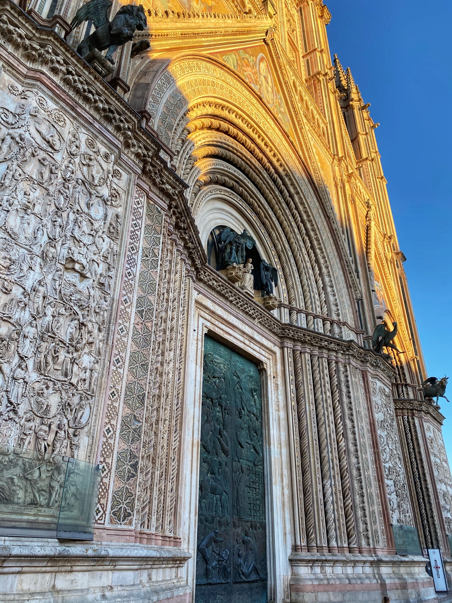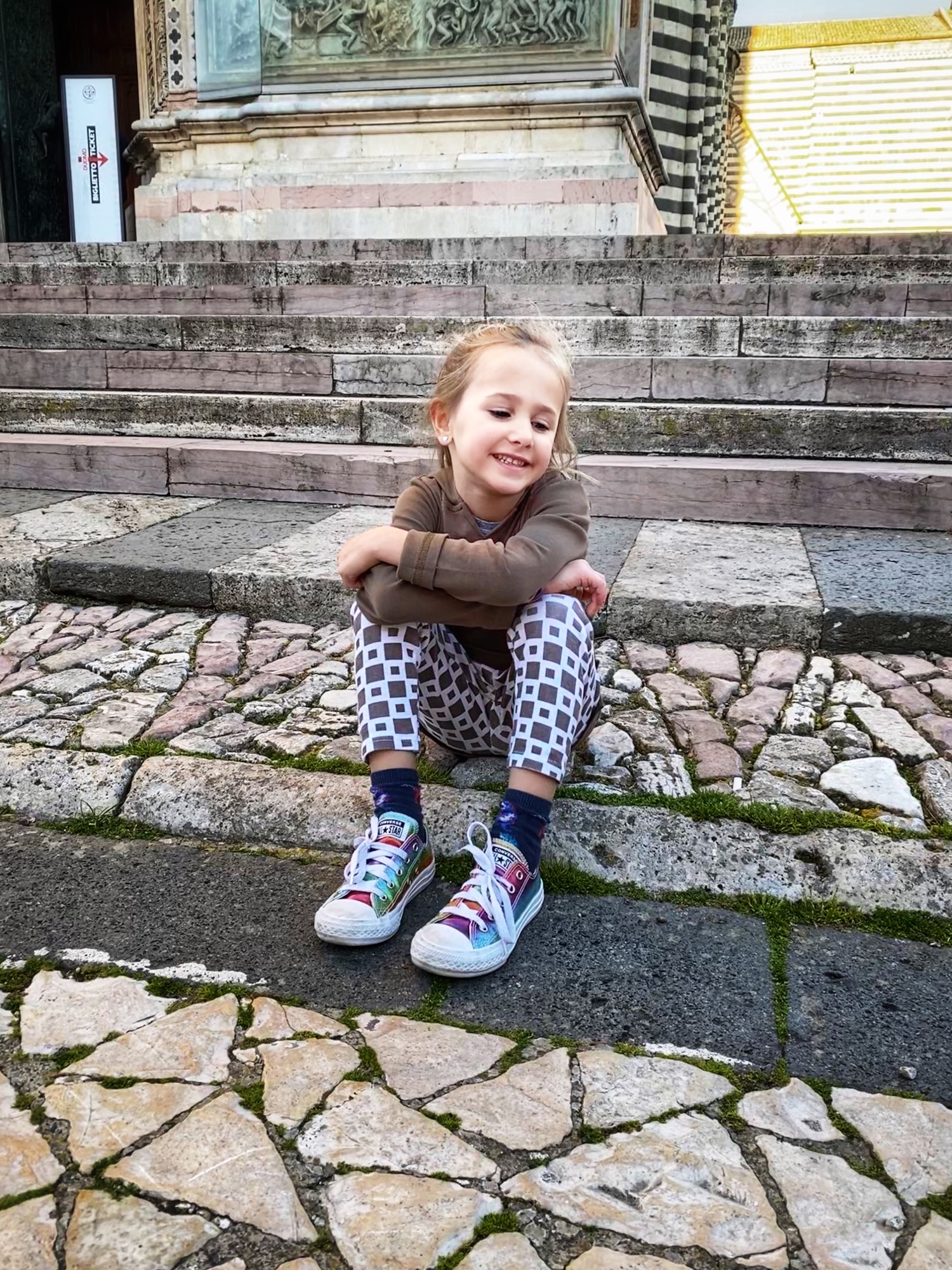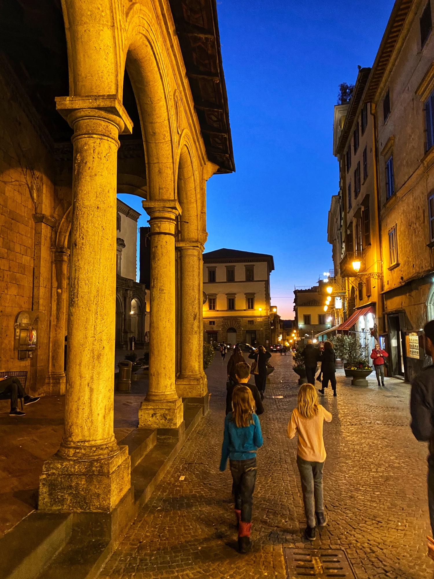 By the time we made it back down the tower and wound our way through the old town to the church, Duomo di Orvieto, it had already closed for the day. We weren’t able to see the marble Pieta statue, tour the museum or walk through any of the underground caves, but seeing the unique facade of Duomo was a sight indeed! The kids got their first taste of ancient ruins outside of the museum, and they were thrilled to be “set free” to chase pigeons and wander the beautiful mosaic stone streets.