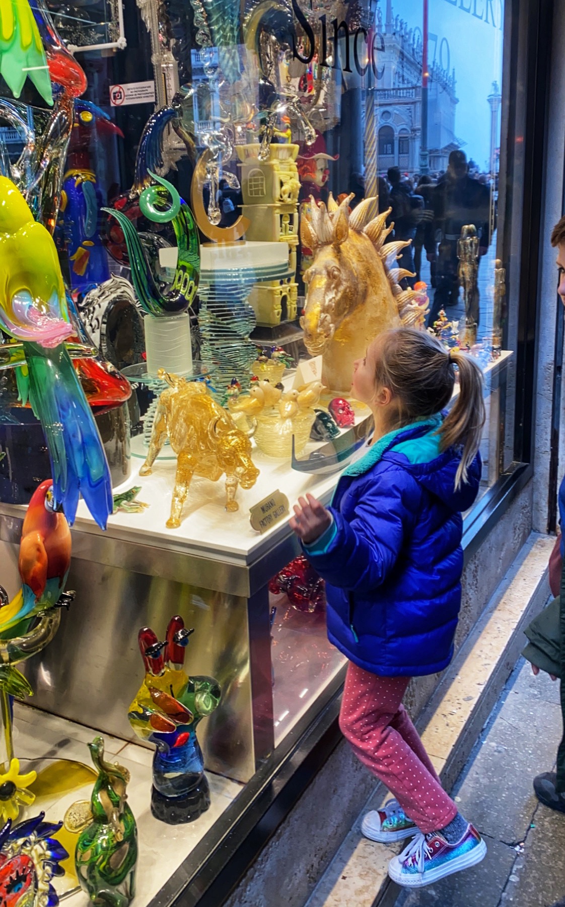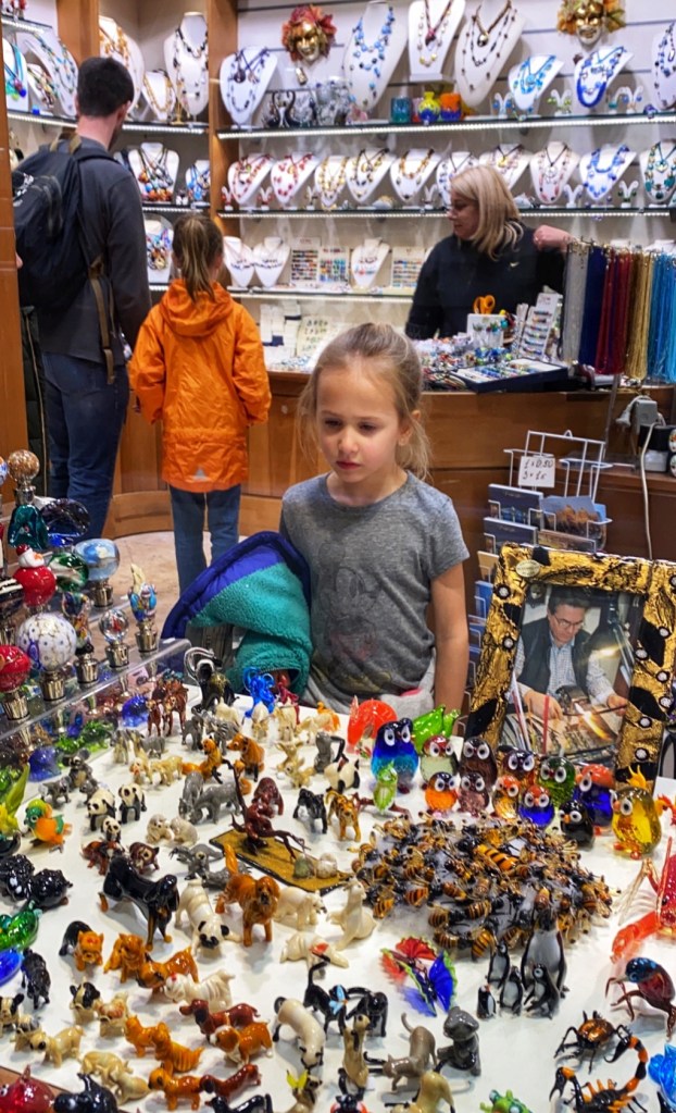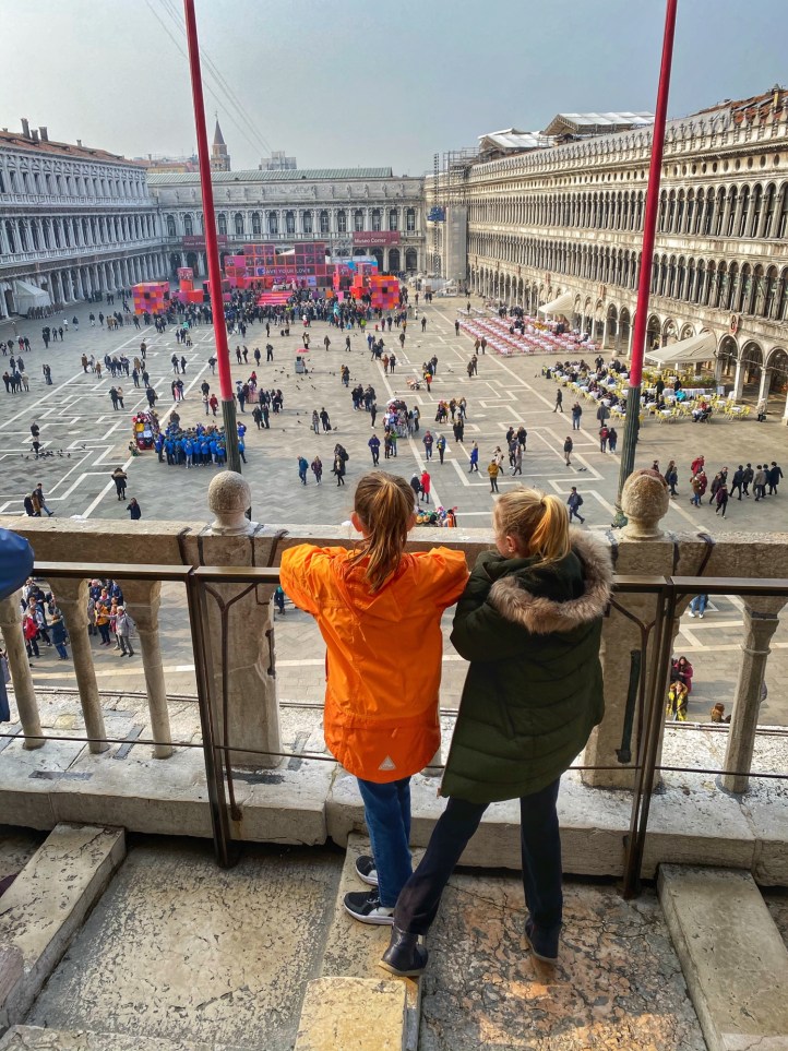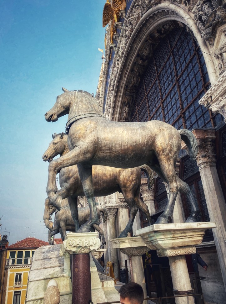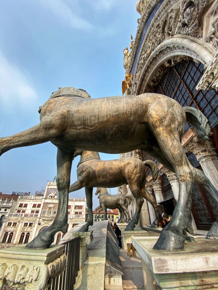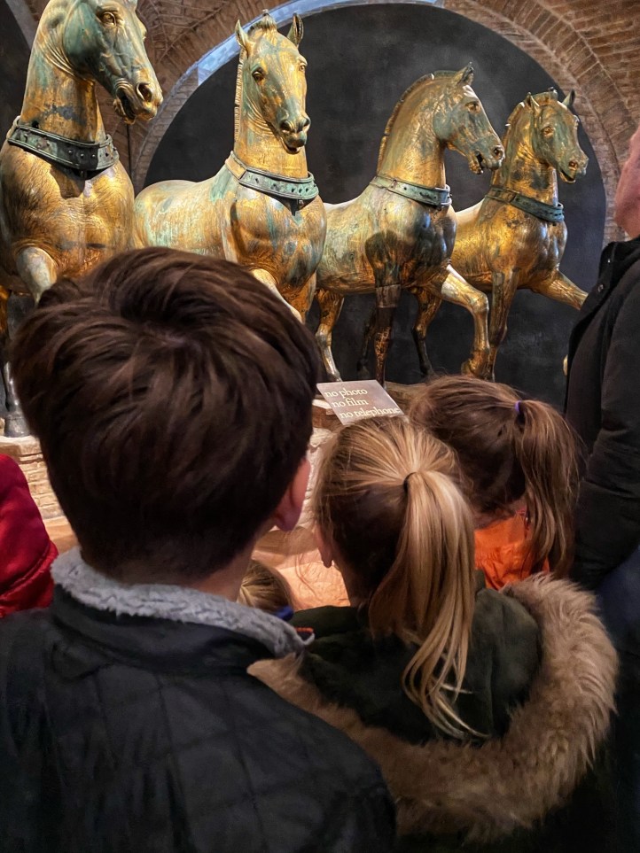 St. Mark’s Basilica in St. Mark’s Square was my niece’s top “must-see” spot on the entire trip. She couldn’t wait to see THE famous golden horses inside the church (technically no photography allowed) and I was excited to go inside the church as last time it was recovering from flooding and they weren’t allowing people inside. Entrance to the Basilica is free, and we jumped in the fairly short line to tour through the musty but grand interior. Up a steep set of stairs is the museum where the infamous four original horses are housed. To our surprise they didn’t look much different from Battaglia’s replica horses on the exterior of the church.