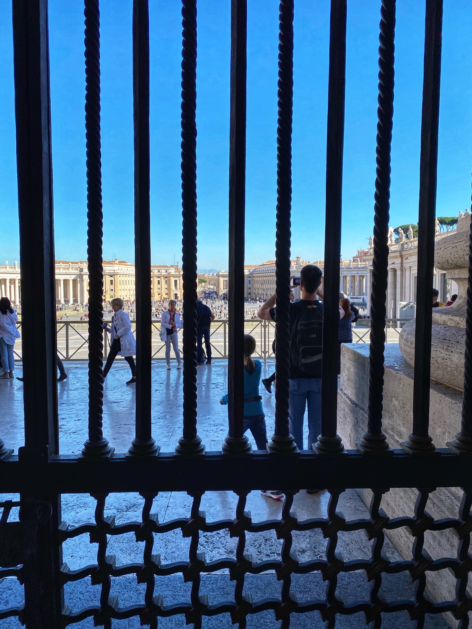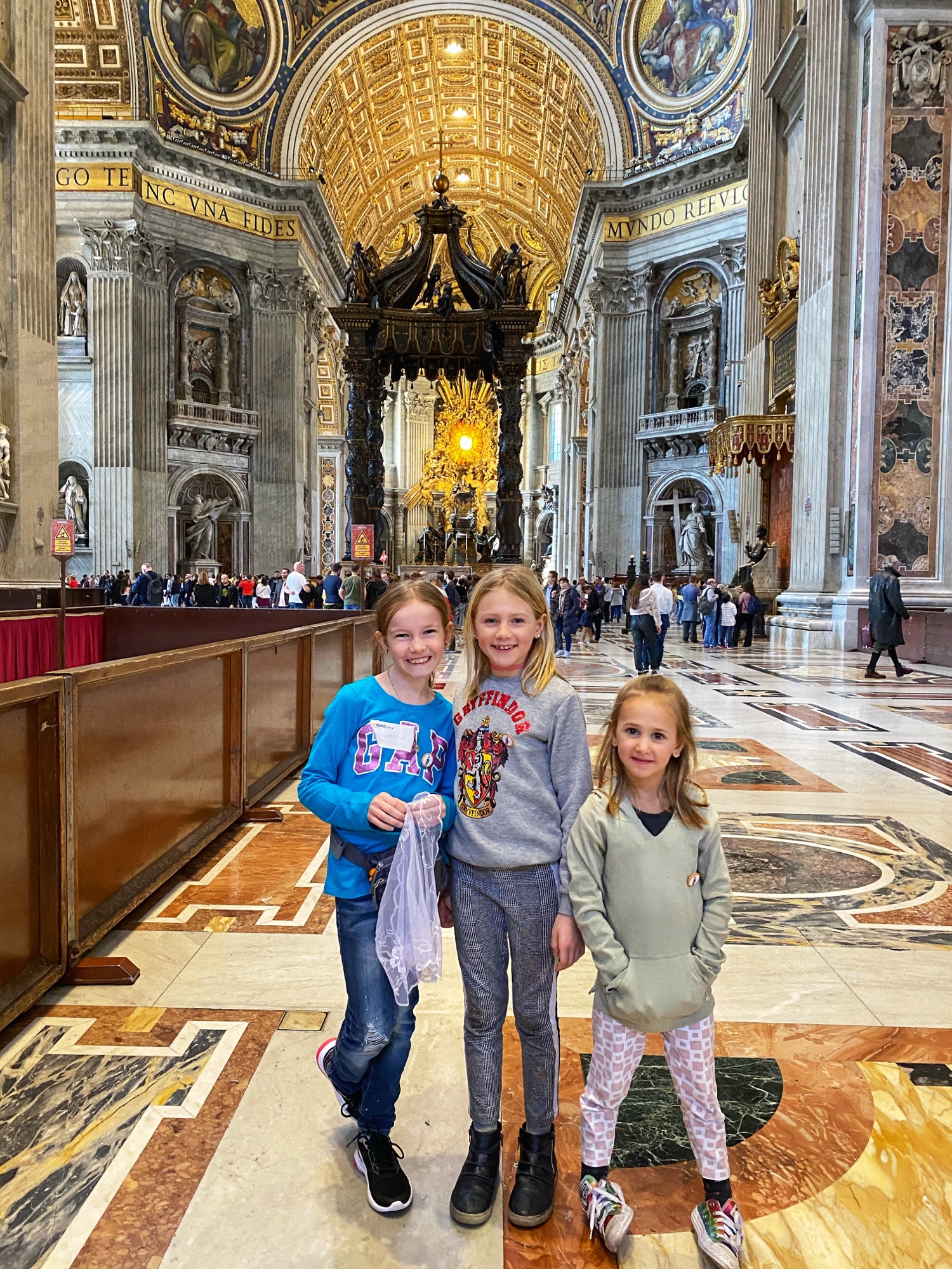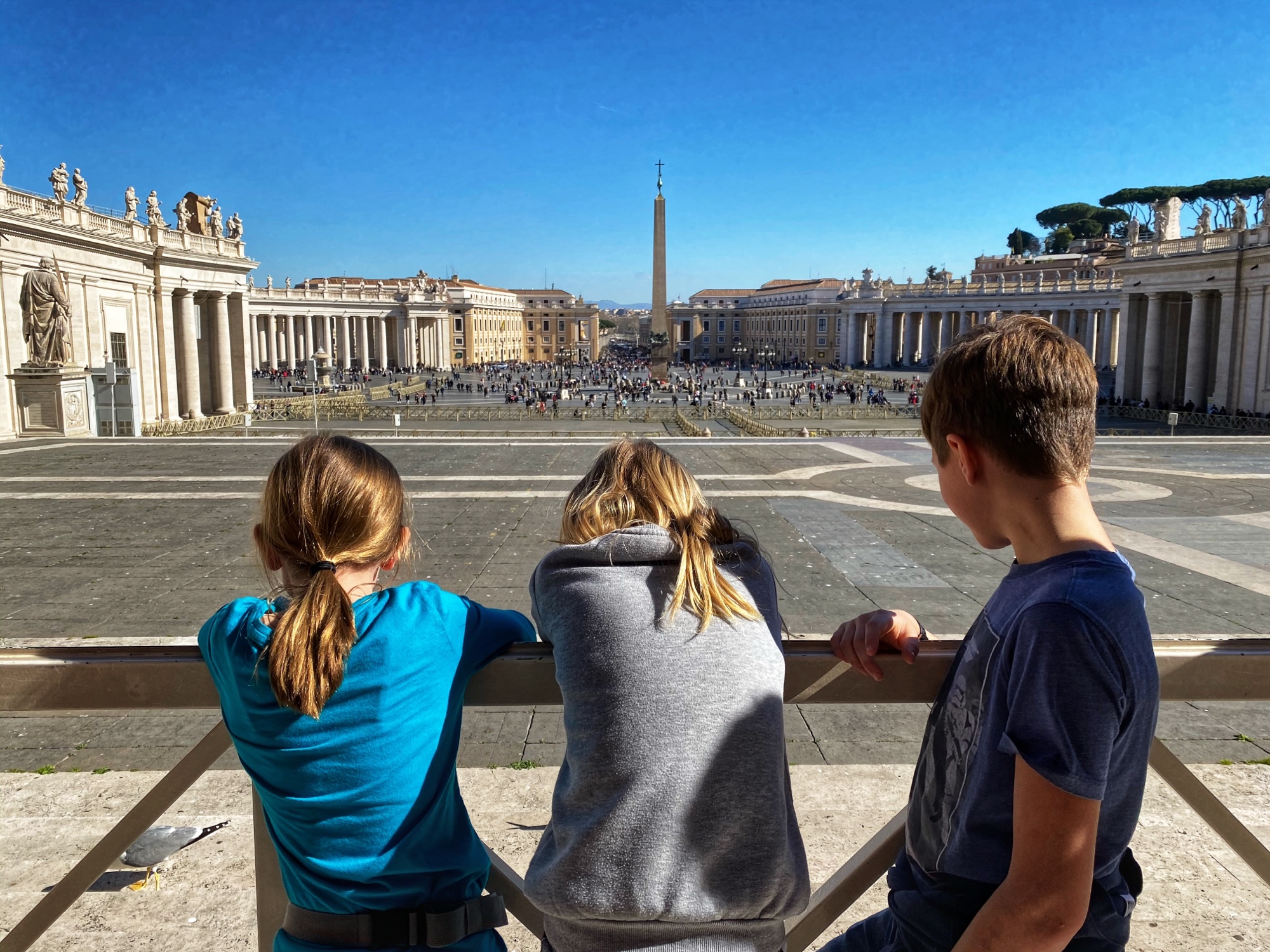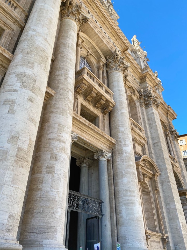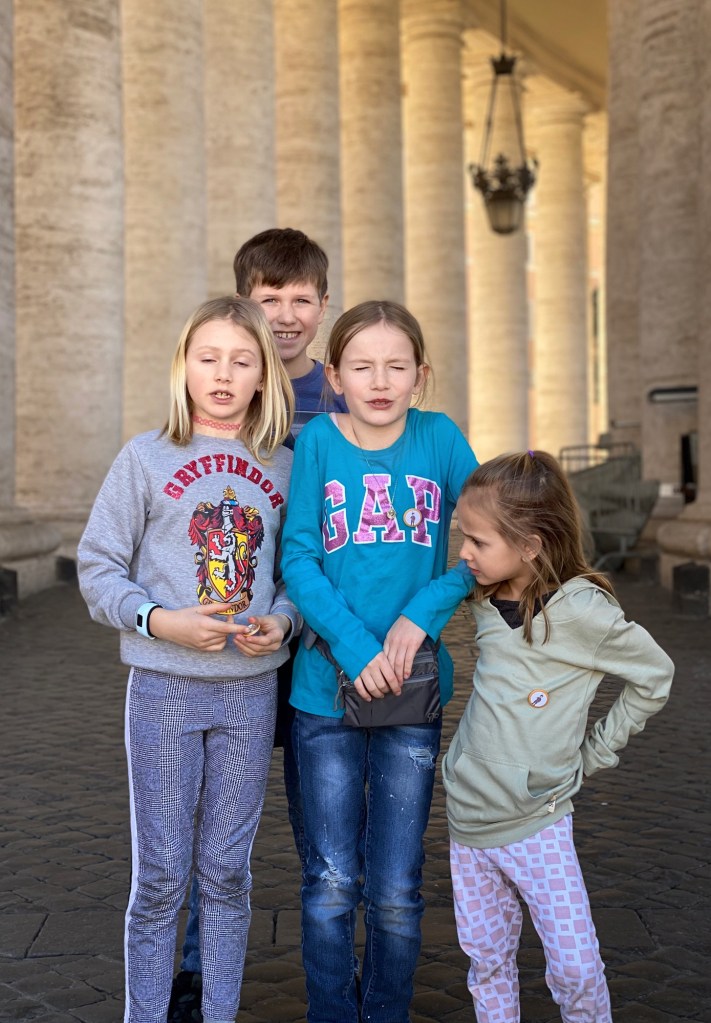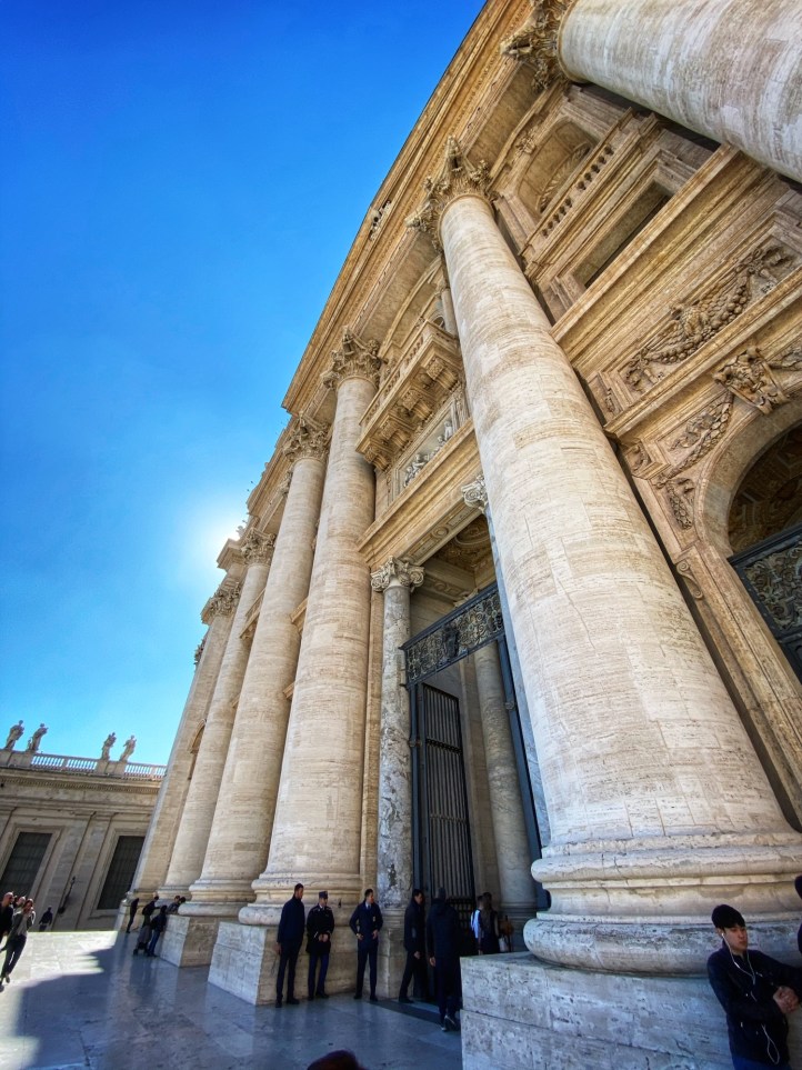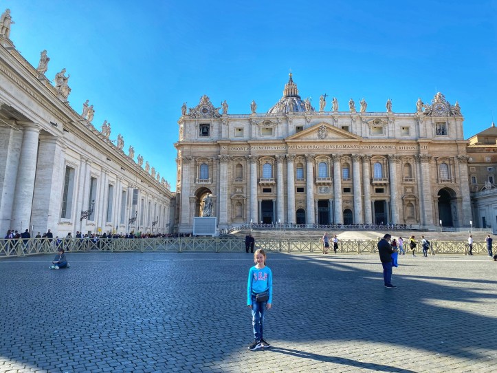 After being awed by the Sistine Chapel we were led out to a lovely view of St. Peter’s Square. From there we said goodbye to our tour guide as she let us explore St. Peter’s Basilica on our own. The square seemed smaller than what I had pictured, watching it fill with people over the years on TV, but this day was fairly quiet. We took in the expanse of it all with the sun on our faces and a little snack in our hands. In a hilarious twist of fate, middle one’s granola bar was stolen by a pesky pigeon. We learned all about minding the birds while in Italy!