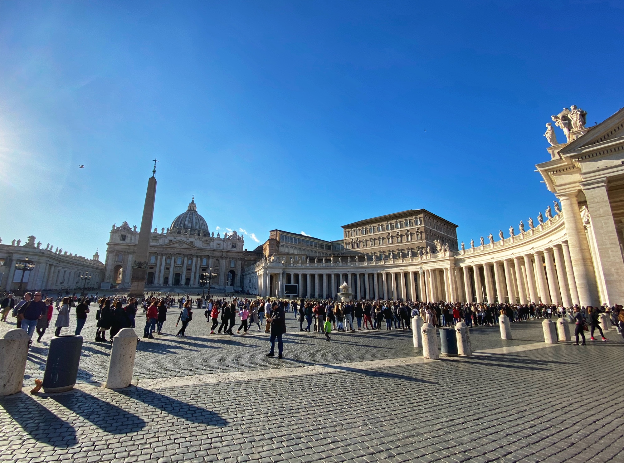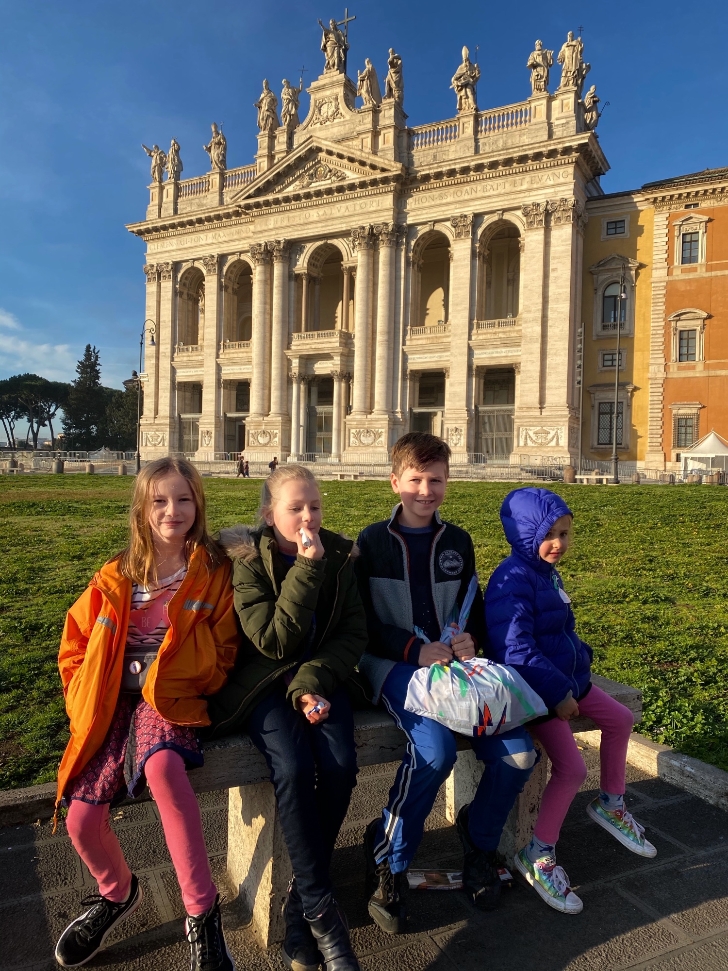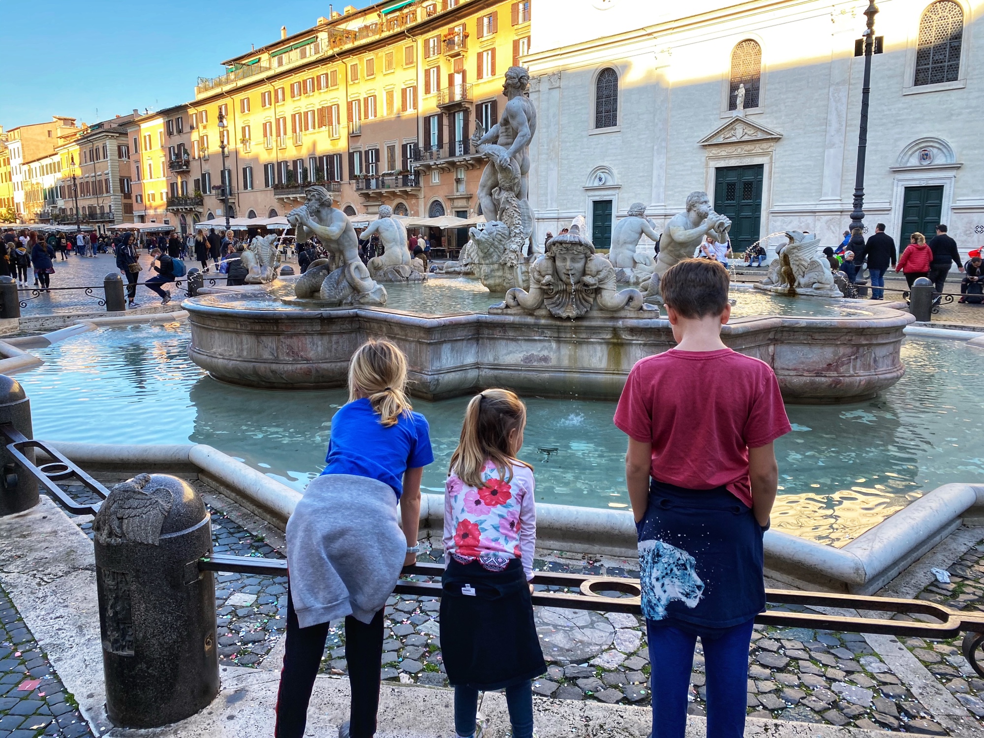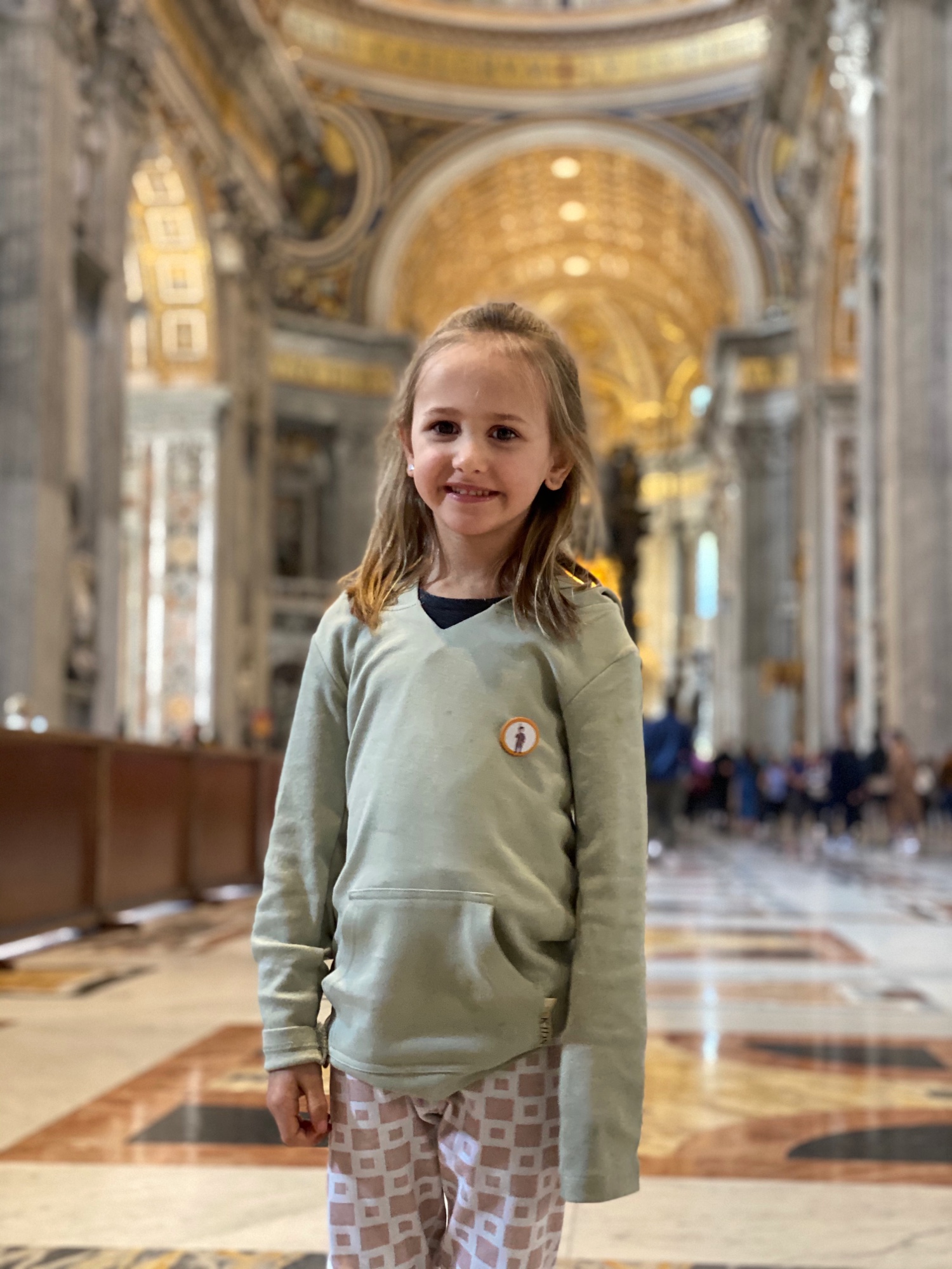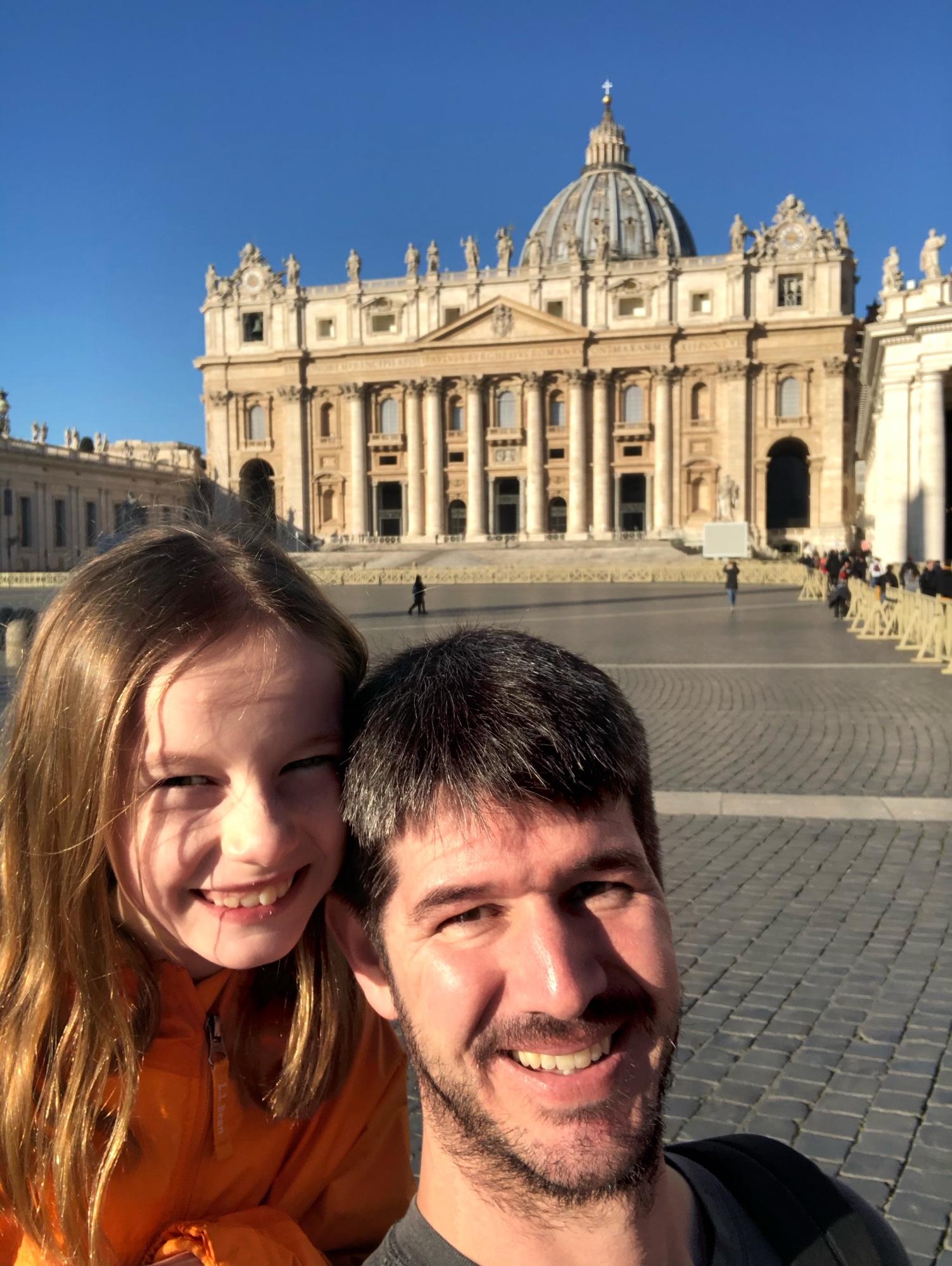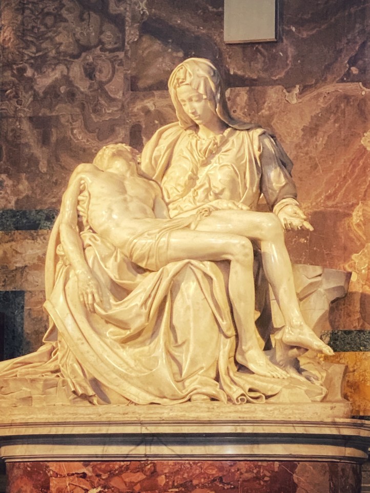 After being awed by the Sistine Chapel we were led out to a lovely view of St. Peter’s Square. From there we said goodbye to our tour guide as she let us explore St. Peter’s Basilica on our own. The square seemed smaller than what I had pictured, watching it fill with people over the years on TV, but this day was fairly quiet. We took in the expanse of it all with the sun on our faces and a little snack in our hands. In a hilarious twist of fate, middle one’s granola bar was stolen by a pesky pigeon. We learned all about minding the birds while in Italy!