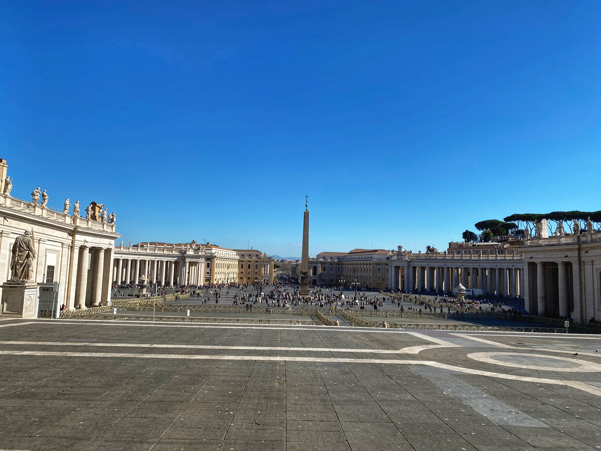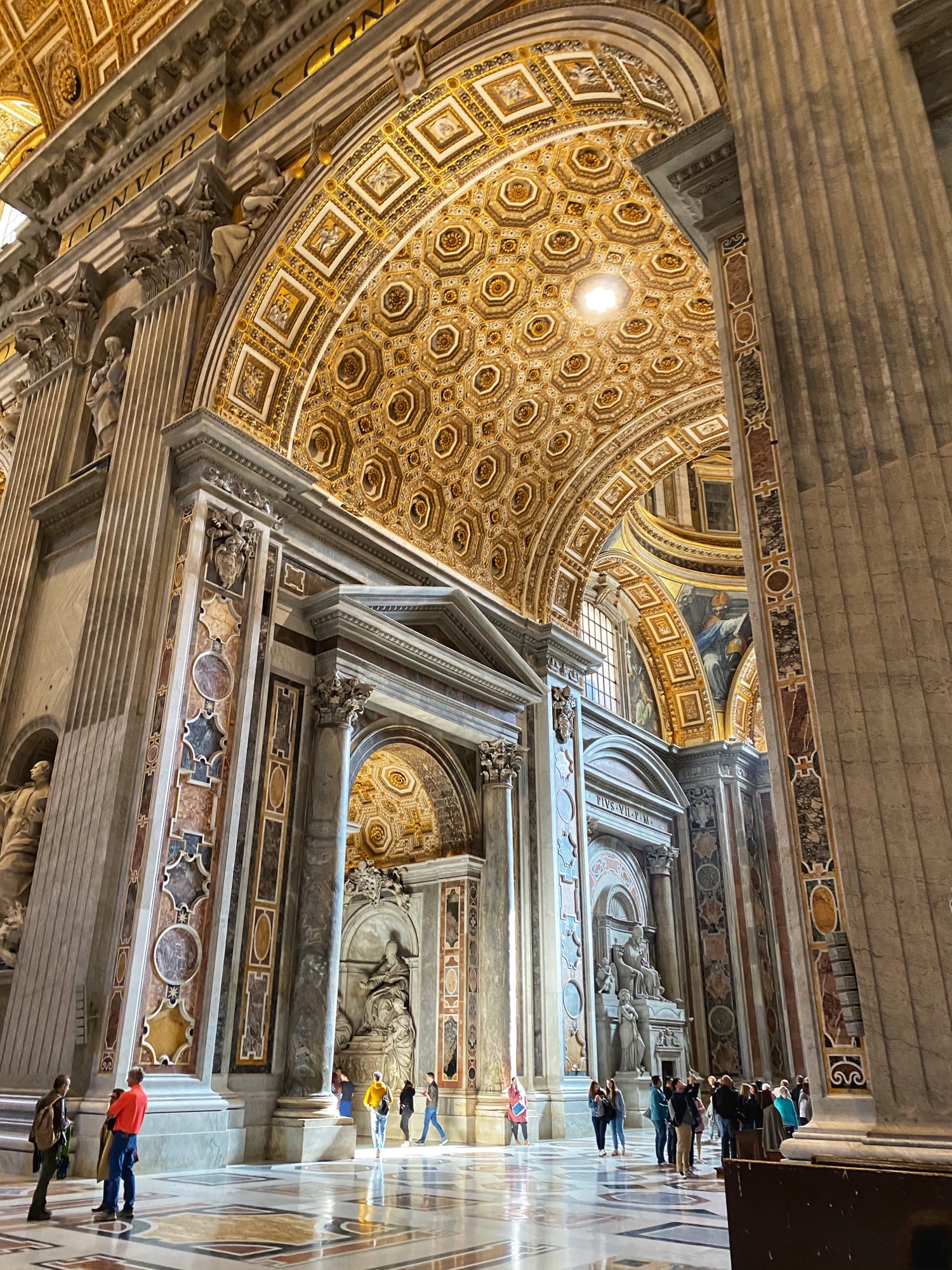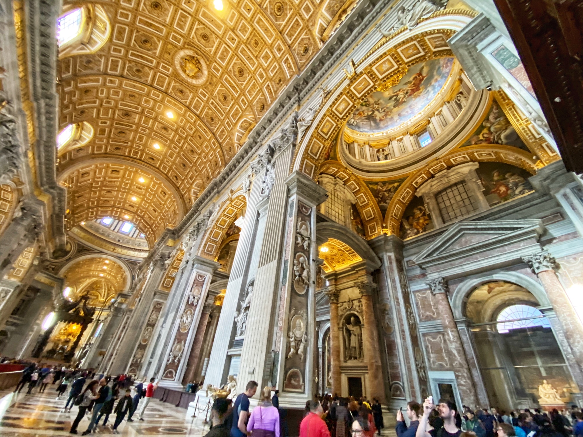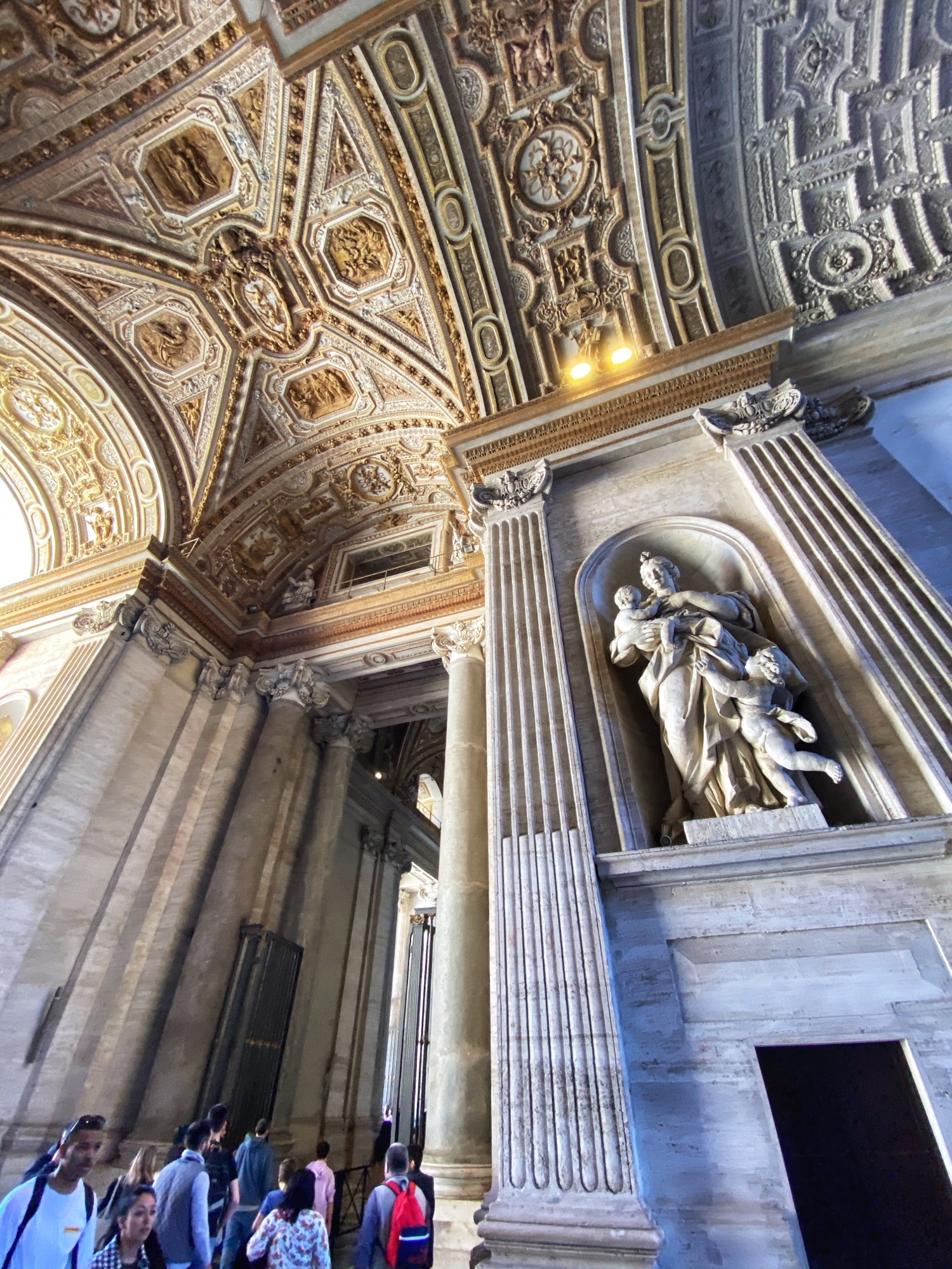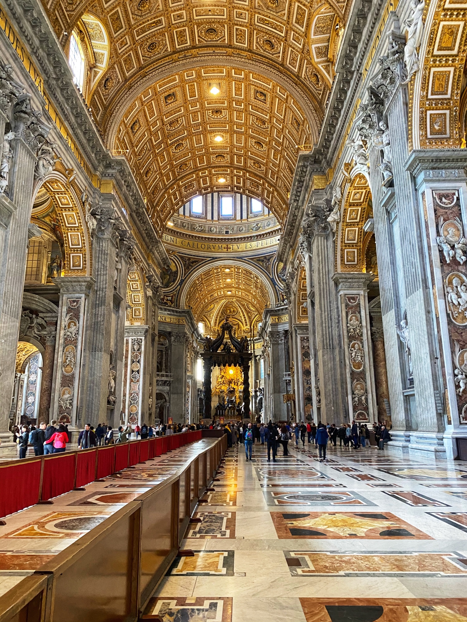 After being awed by the Sistine Chapel we were led out to a lovely view of St. Peter’s Square. From there we said goodbye to our tour guide as she let us explore St. Peter’s Basilica on our own. The square seemed smaller than what I had pictured, watching it fill with people over the years on TV, but this day was fairly quiet. We took in the expanse of it all with the sun on our faces and a little snack in our hands. In a hilarious twist of fate, middle one’s granola bar was stolen by a pesky pigeon. We learned all about minding the birds while in Italy!