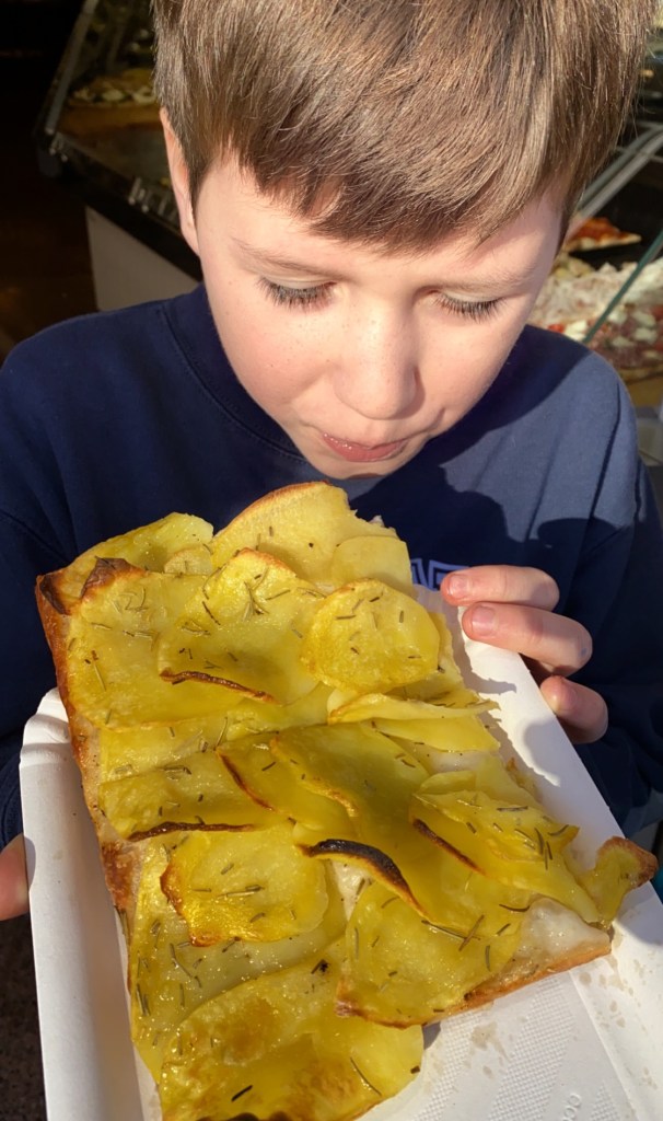 Enough time, in fact, to enjoy an espresso, hot chocolate, and some delicious focaccia before meeting up with our small group. Big bro’s favorite was the rosemary potato focaccia, and we all tried that, as well as and some yummy plain and tomato basil varieties. You just can’t get it anywhere like you can in Italy!