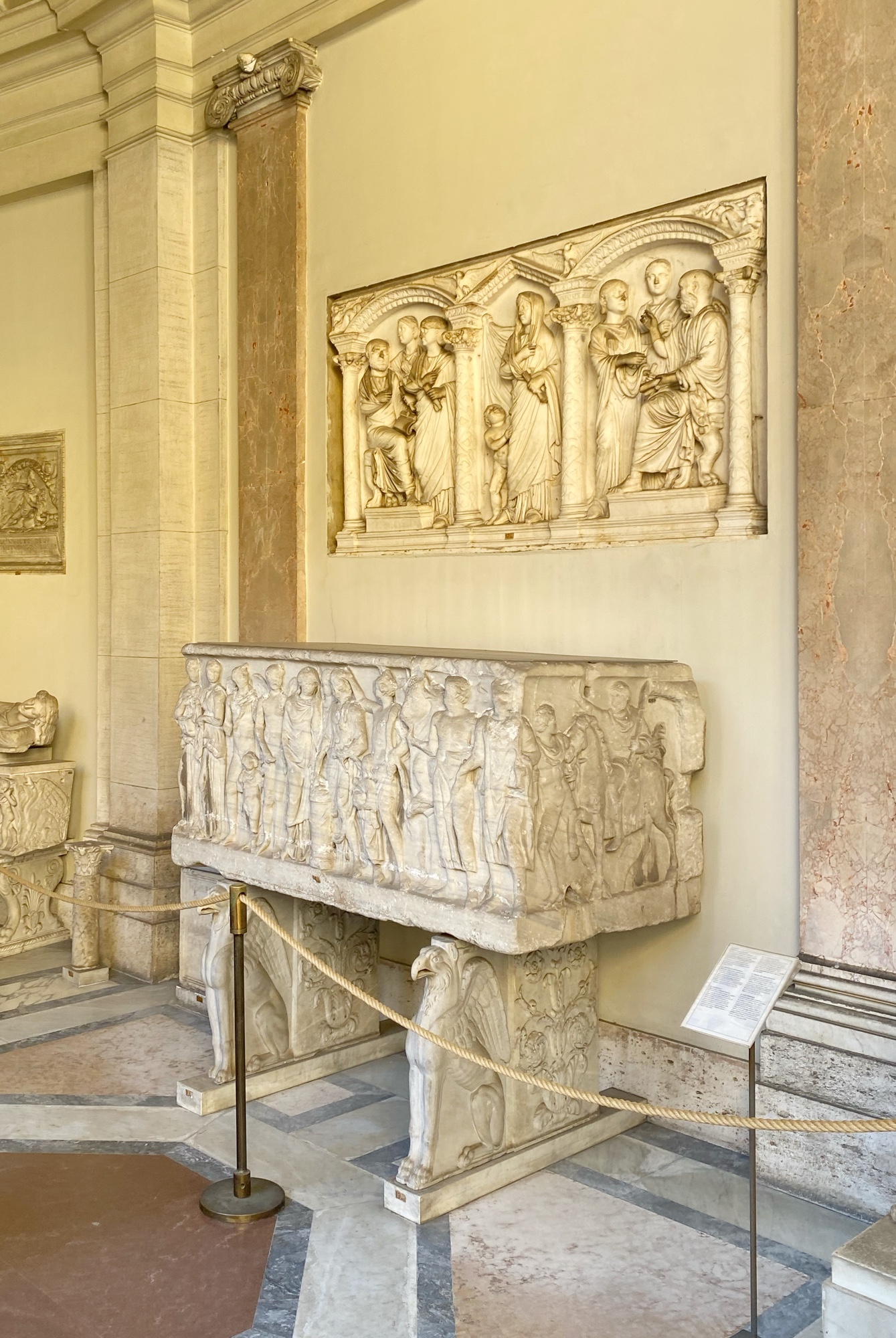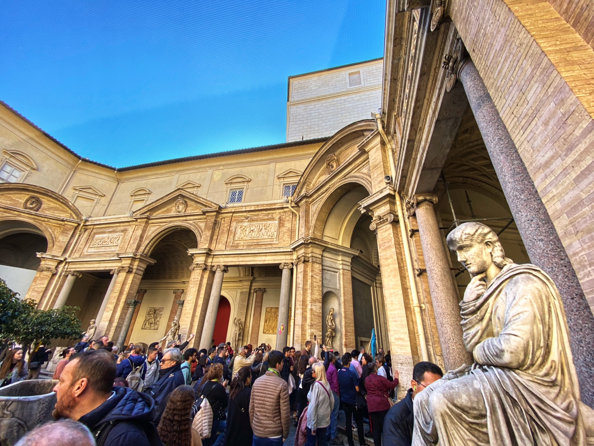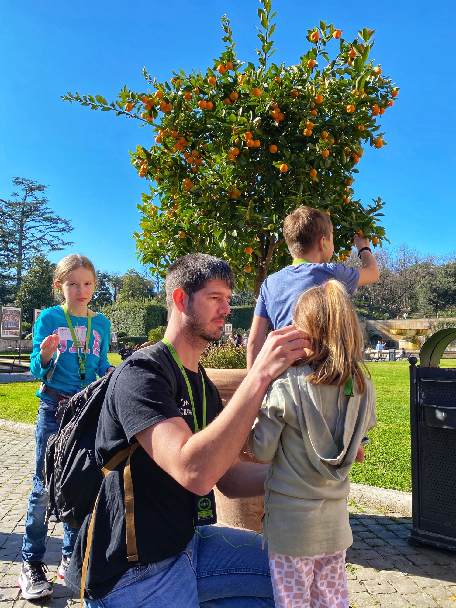 We met up with our tour guide and another little military family from Canada, and made our way into the Vatican Museum. Having seen the lines and the crowds, I can’t imagine doing this any other way. Our tour guide Francesca led us past all the long lines straight up and into the museum, paying careful attention to the kids and their questions the whole time. We spent a lot of time in the Giardino Quadrato as part of the museum was closed for renovations (the Carriage Museum) and the Sistine Chapel wasn’t opening until 11. To kill some time, the kids worked in their little workbooks provided by the tour company, and Francesca led the children in a Sistine Chapel puzzle activity as she answered questions and let them pick a little kumquat or orange from the nearby citrus trees.