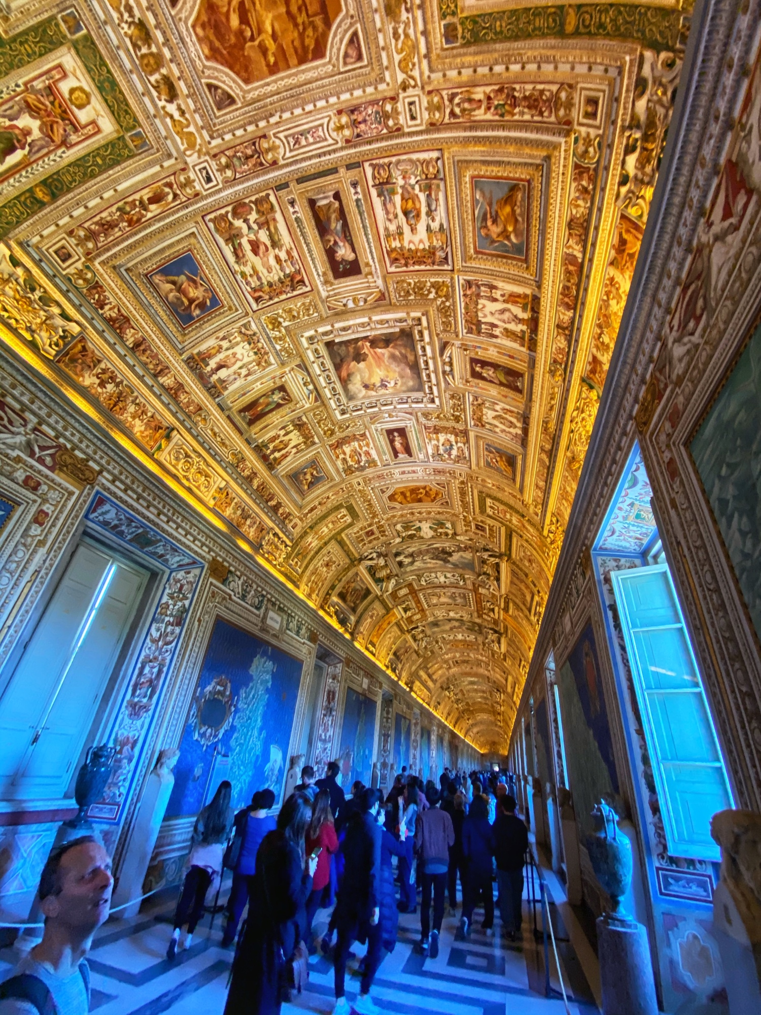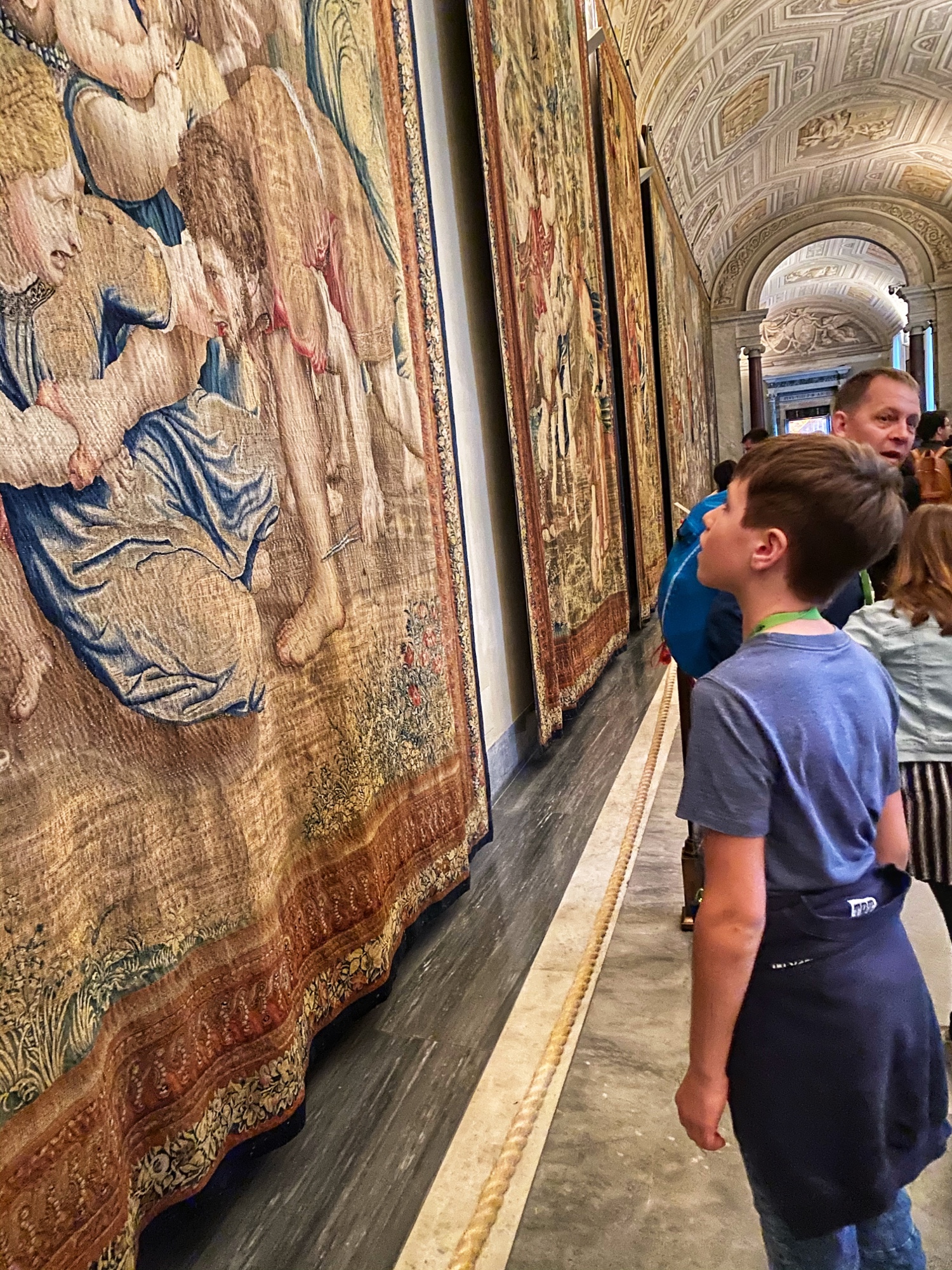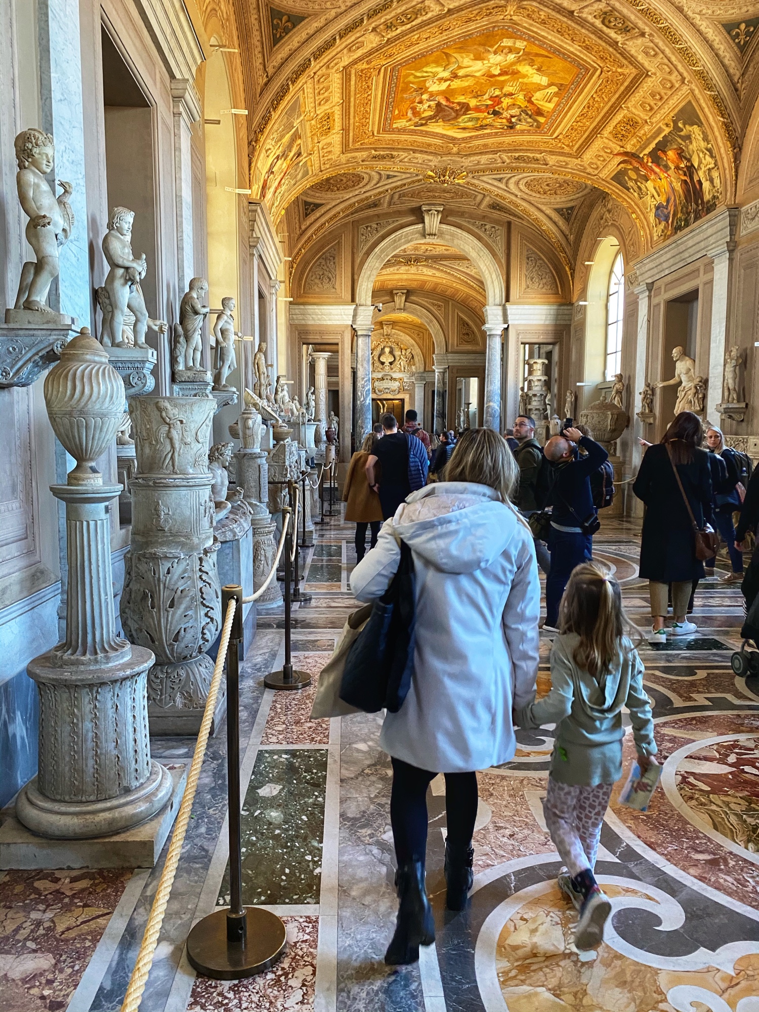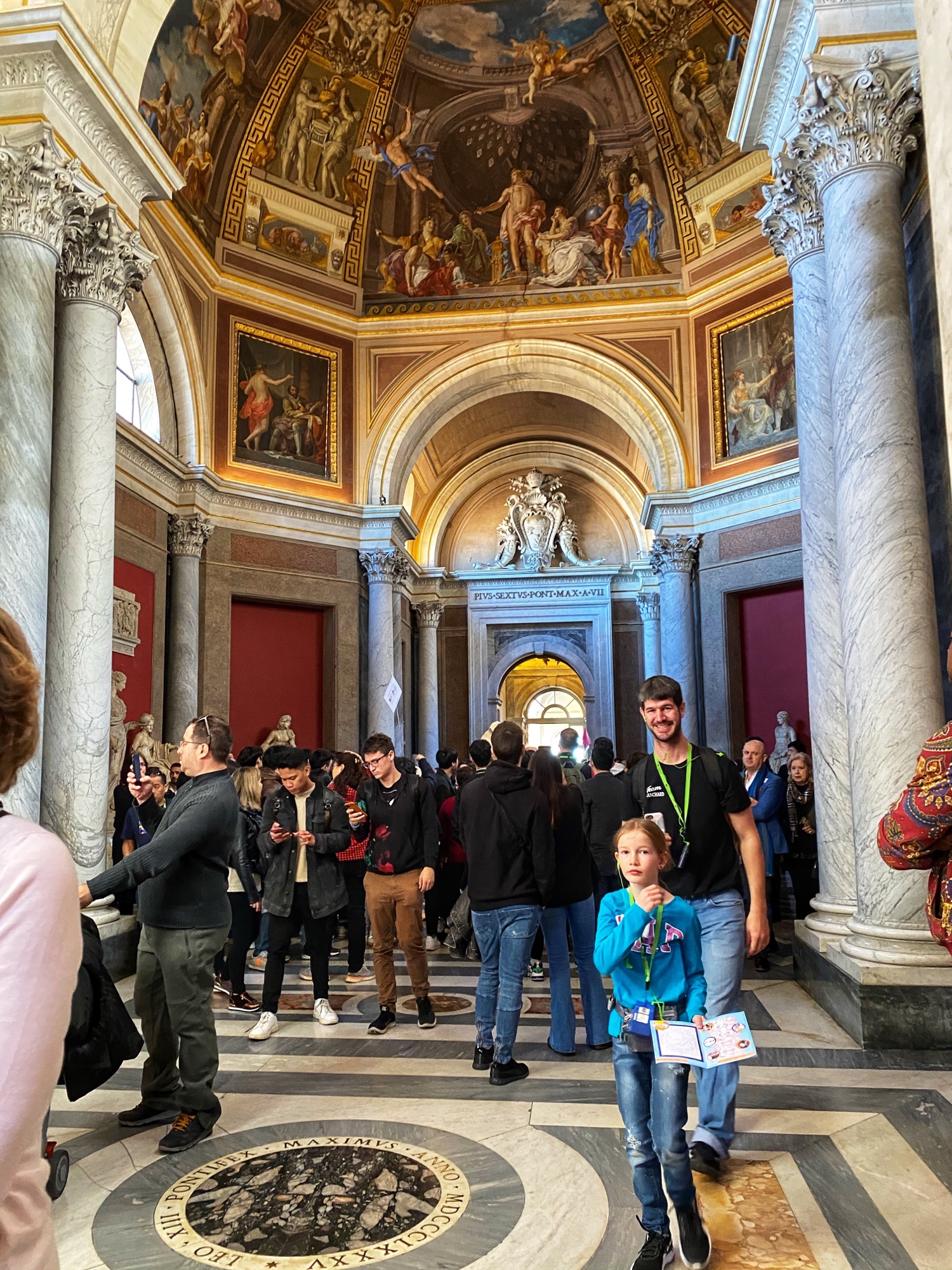 Inside the museum we saw beautiful works of art dating back from 1,000 B.C. all the way until today. Of course the most impressive of the sights was the Sistine Chapel, but before beholding that sight we enjoyed the Egyptian exhibits complete with exposed mummy, ancient Roman sculptures, and a spectacular hall filled with maps of Italy from wall to wall. Lil man and my brother loved the maps! Every single ceiling we saw was replete with impossible-to-absorb detail. Even the tiled floor was boggling. Unfortunately the amount of people pressing through the museum made it somewhat difficult to appreciate the grandeur of it entirely, but we did our best. Francesca pressed on, as we could finally enter the Sistine Chapel, so we did – and of course, no photos allowed!