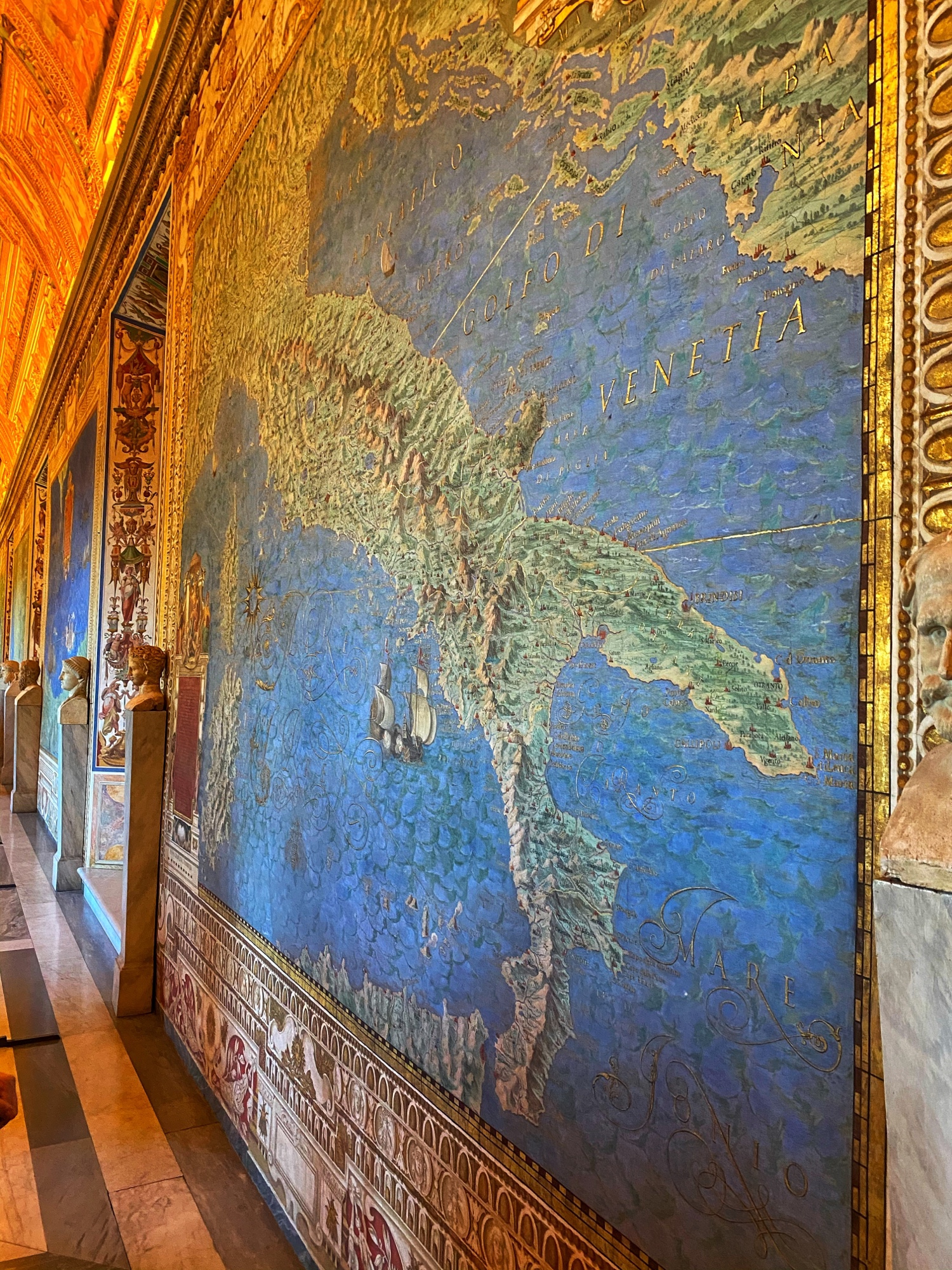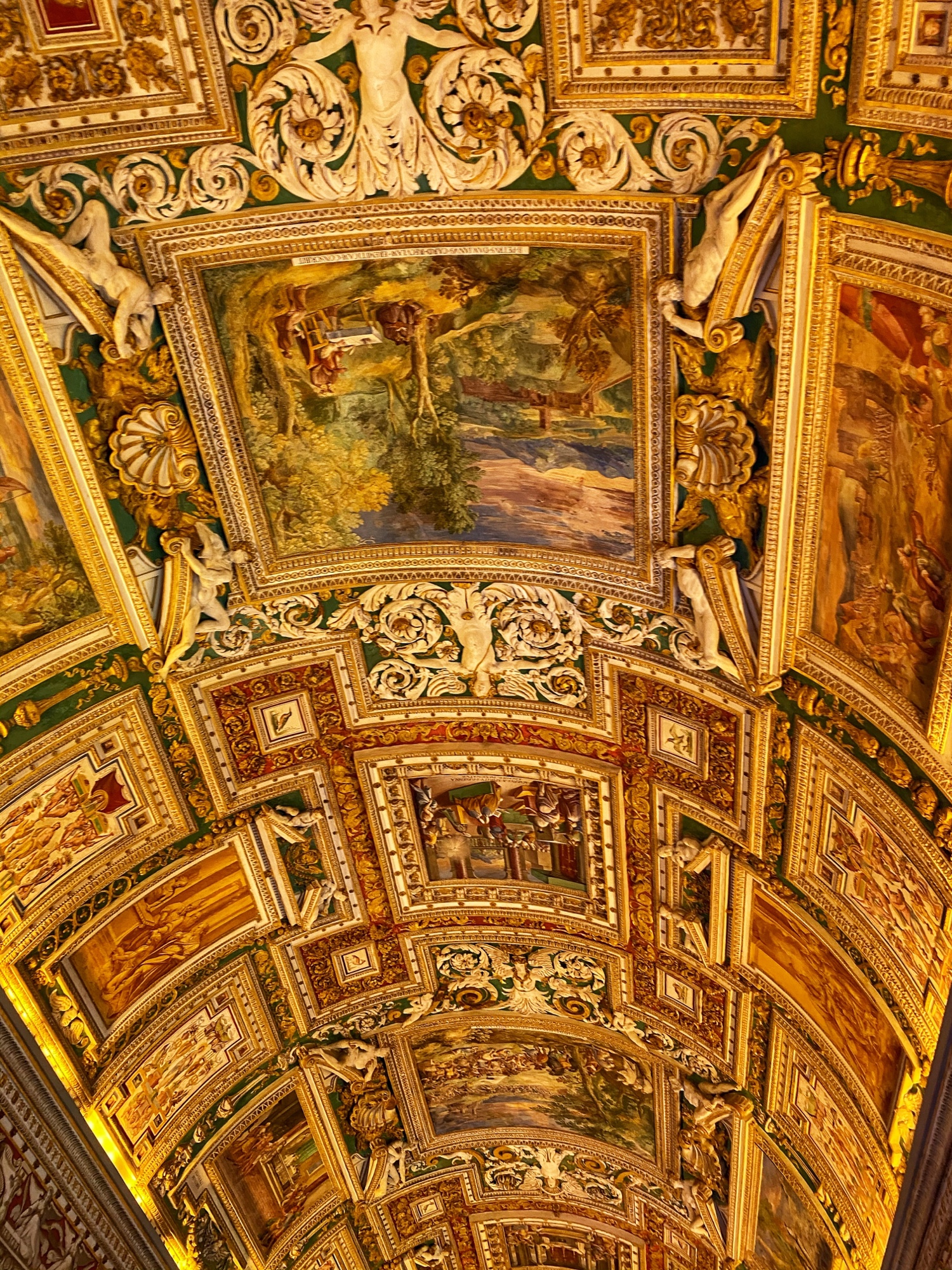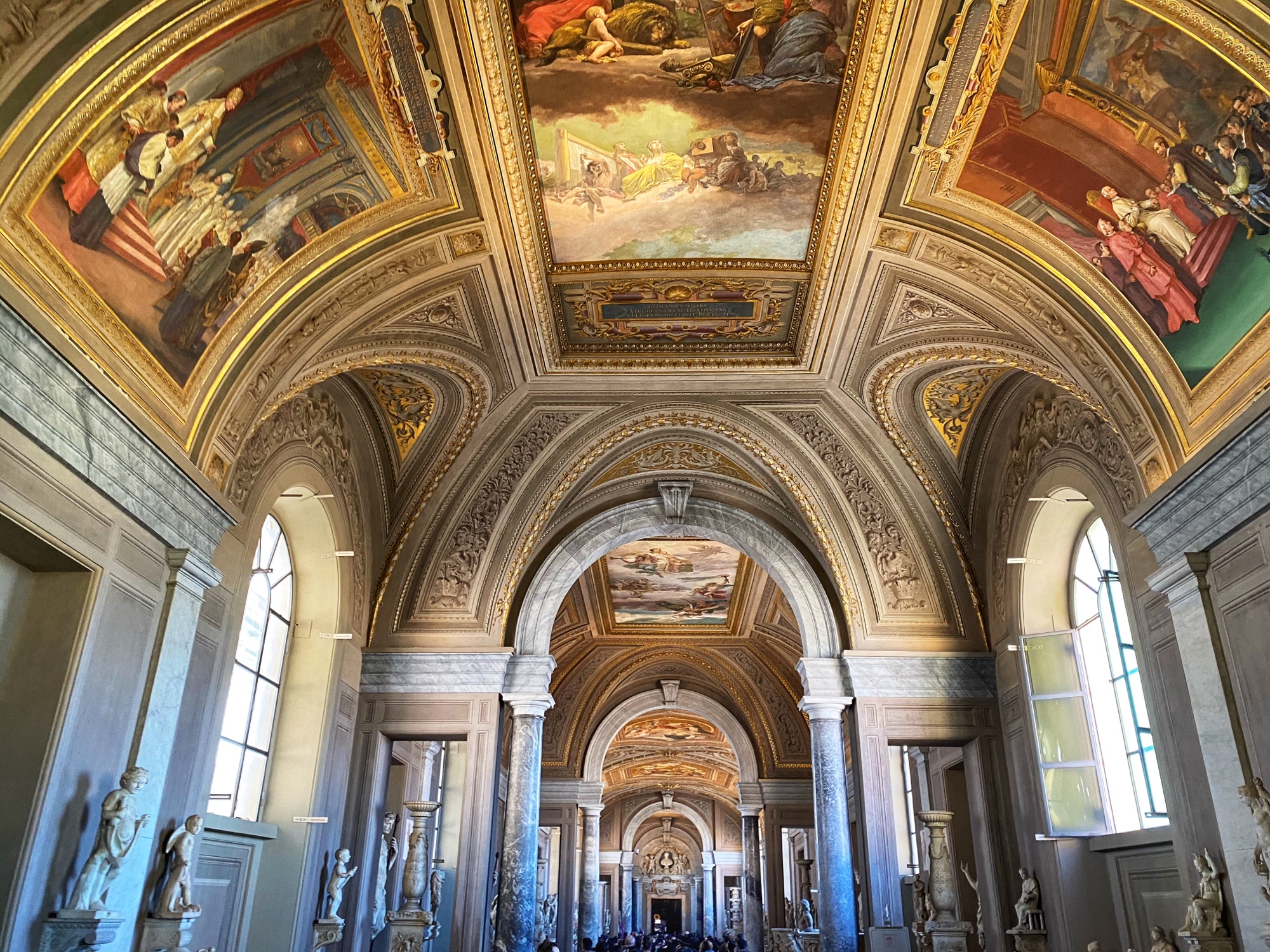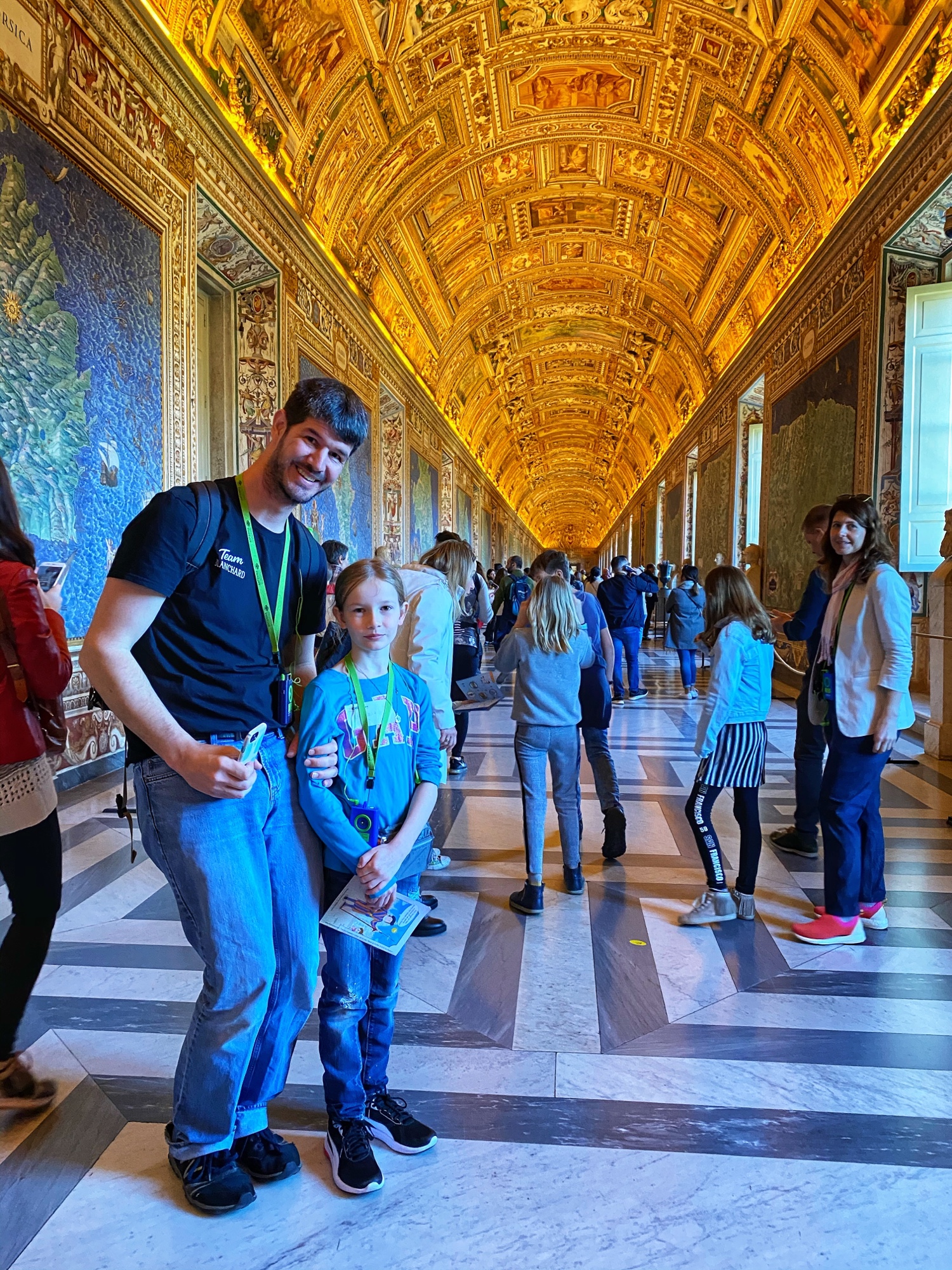 Inside the museum we saw beautiful works of art dating back from 1,000 B.C. all the way until today. Of course the most impressive of the sights was the Sistine Chapel, but before beholding that sight we enjoyed the Egyptian exhibits complete with exposed mummy, ancient Roman sculptures, and a spectacular hall filled with maps of Italy from wall to wall. Lil man and my brother loved the maps! Every single ceiling we saw was replete with impossible-to-absorb detail. Even the tiled floor was boggling. Unfortunately the amount of people pressing through the museum made it somewhat difficult to appreciate the grandeur of it entirely, but we did our best. Francesca pressed on, as we could finally enter the Sistine Chapel, so we did – and of course, no photos allowed!