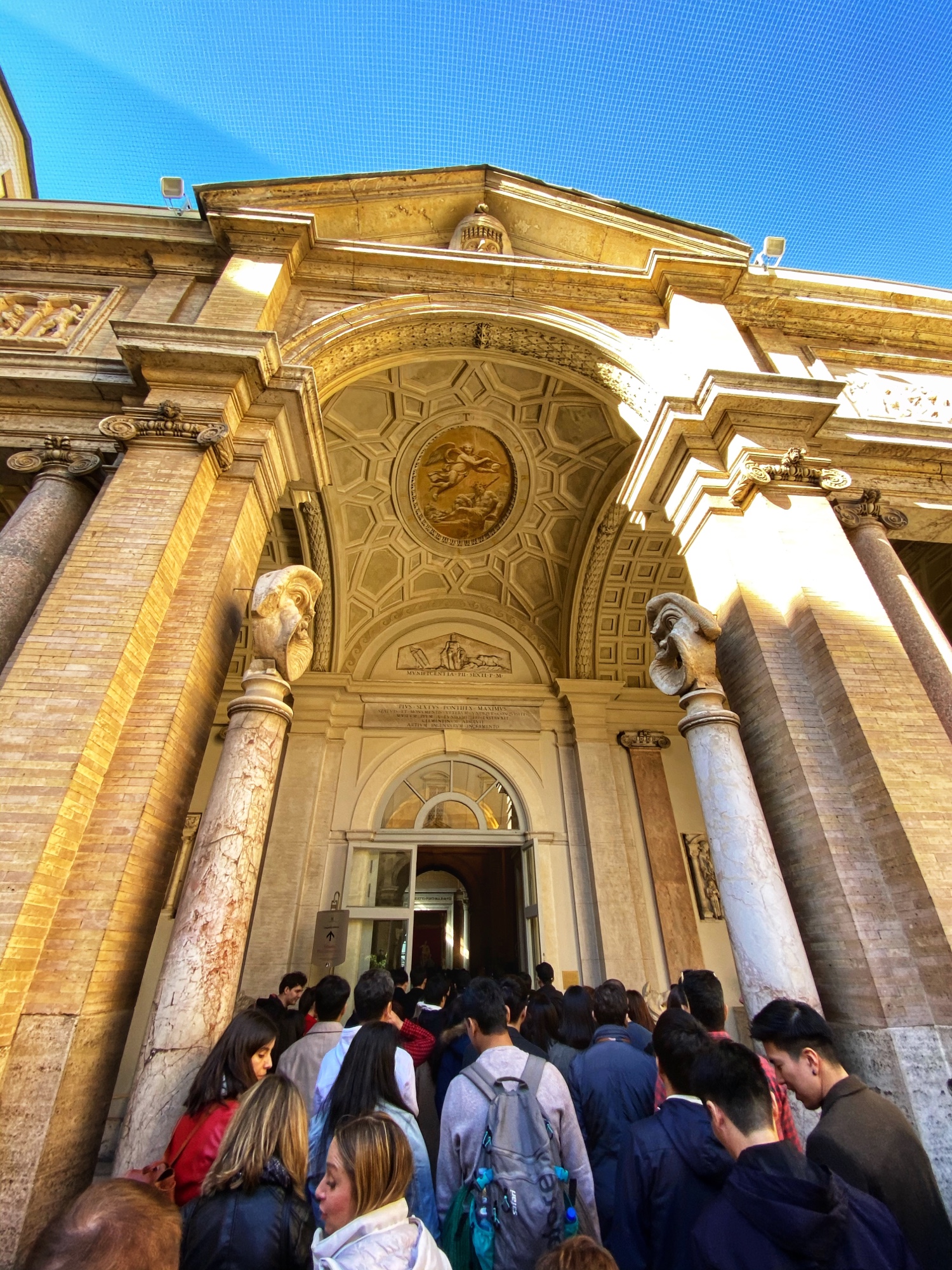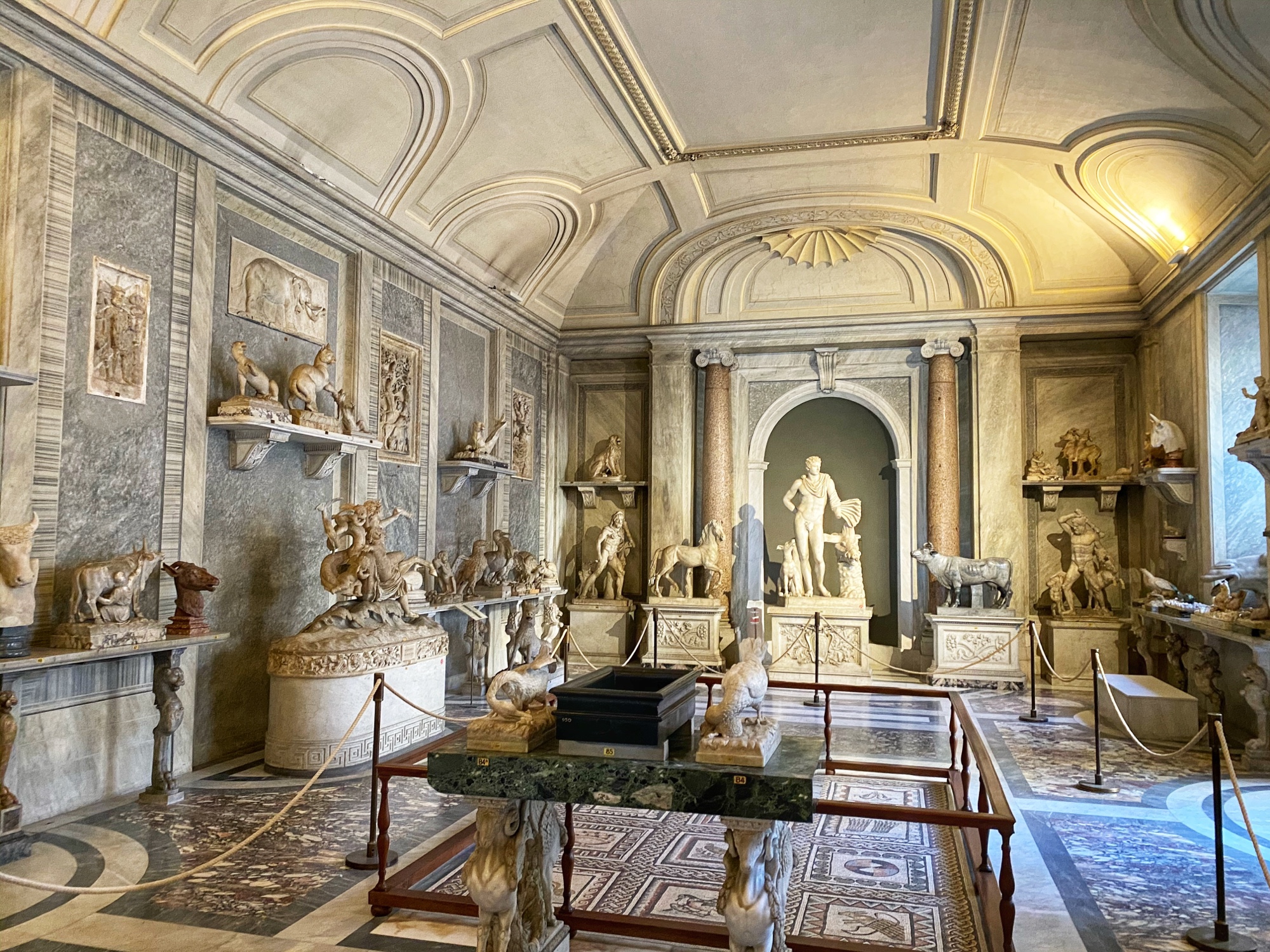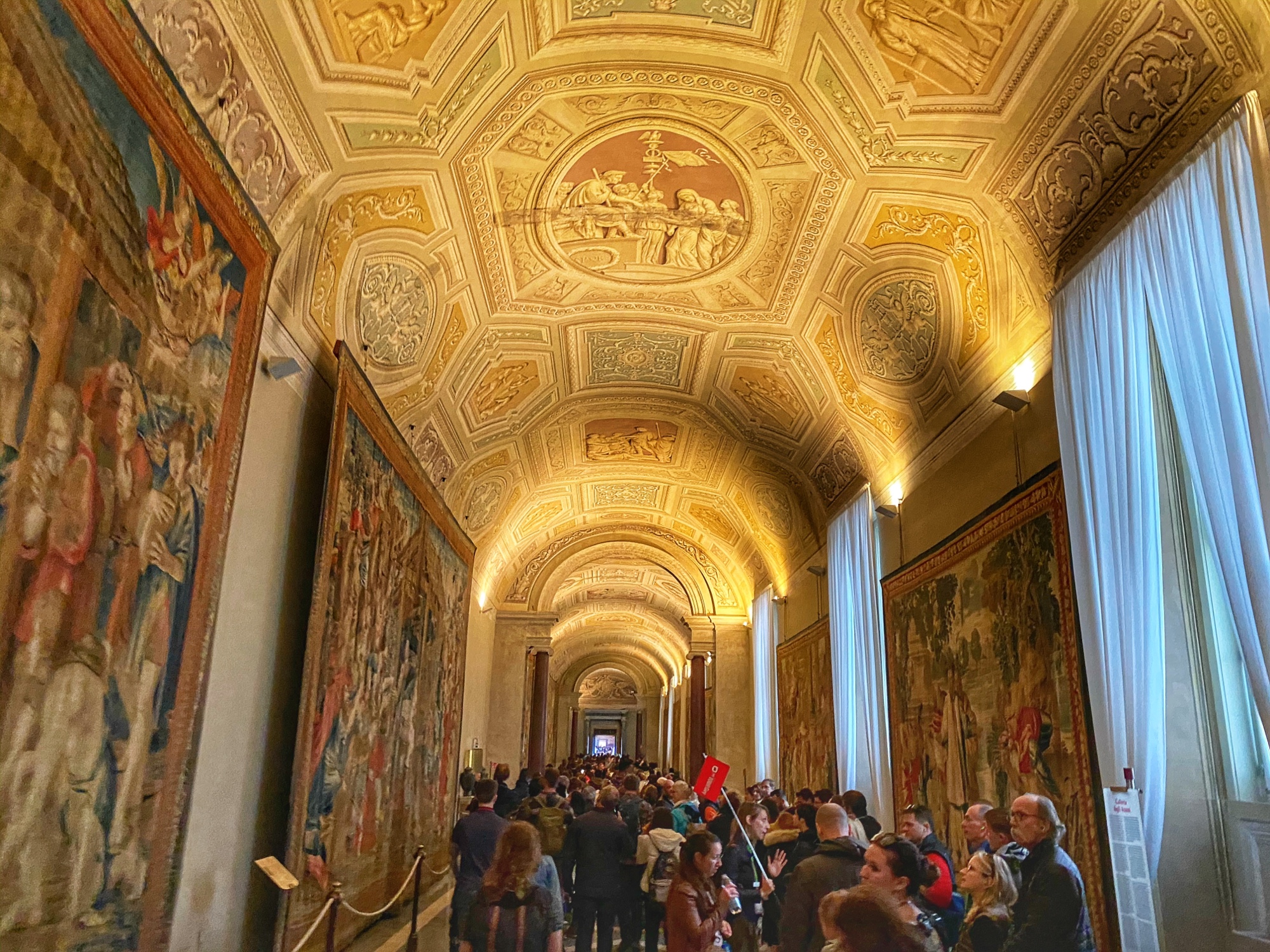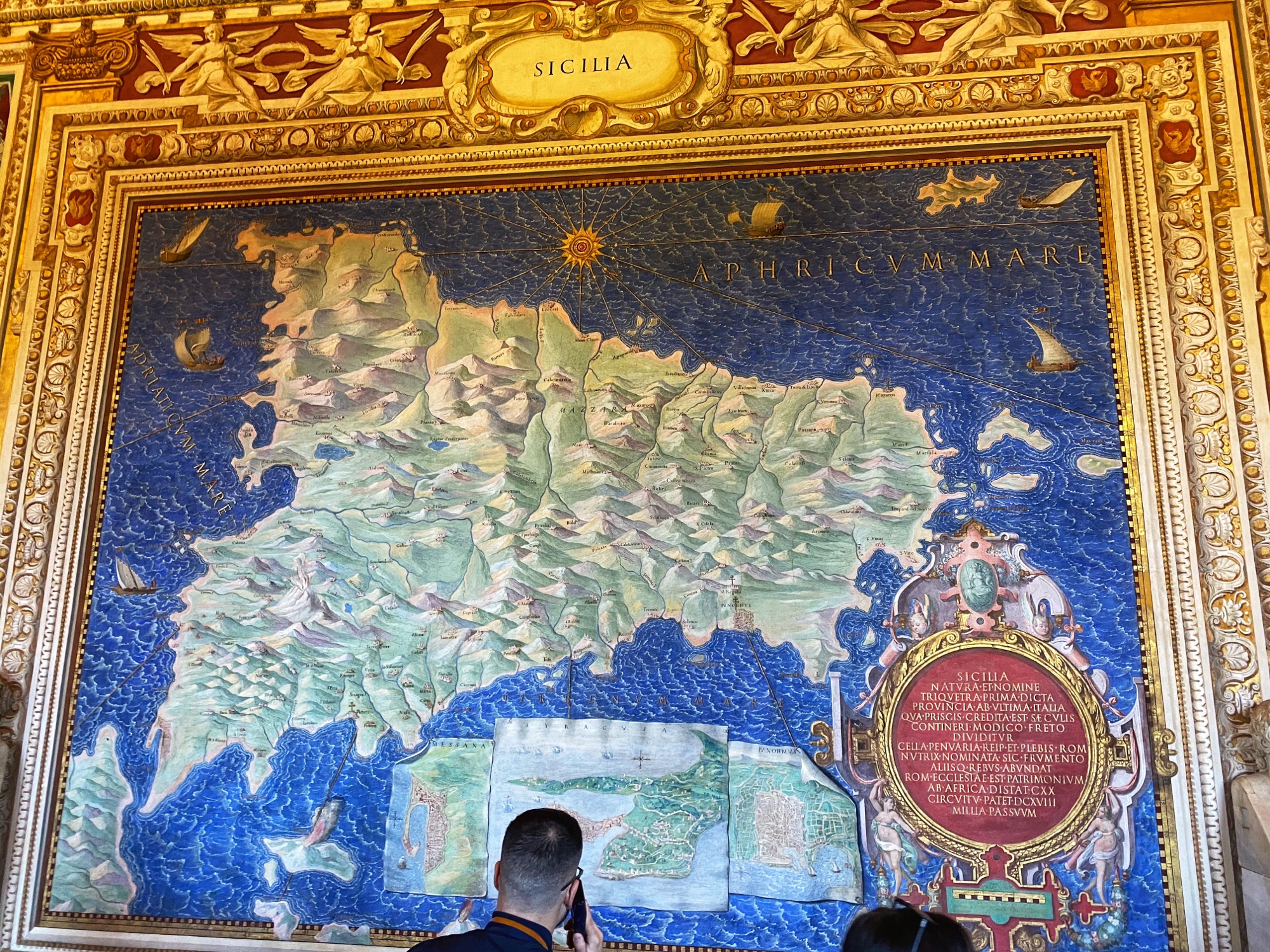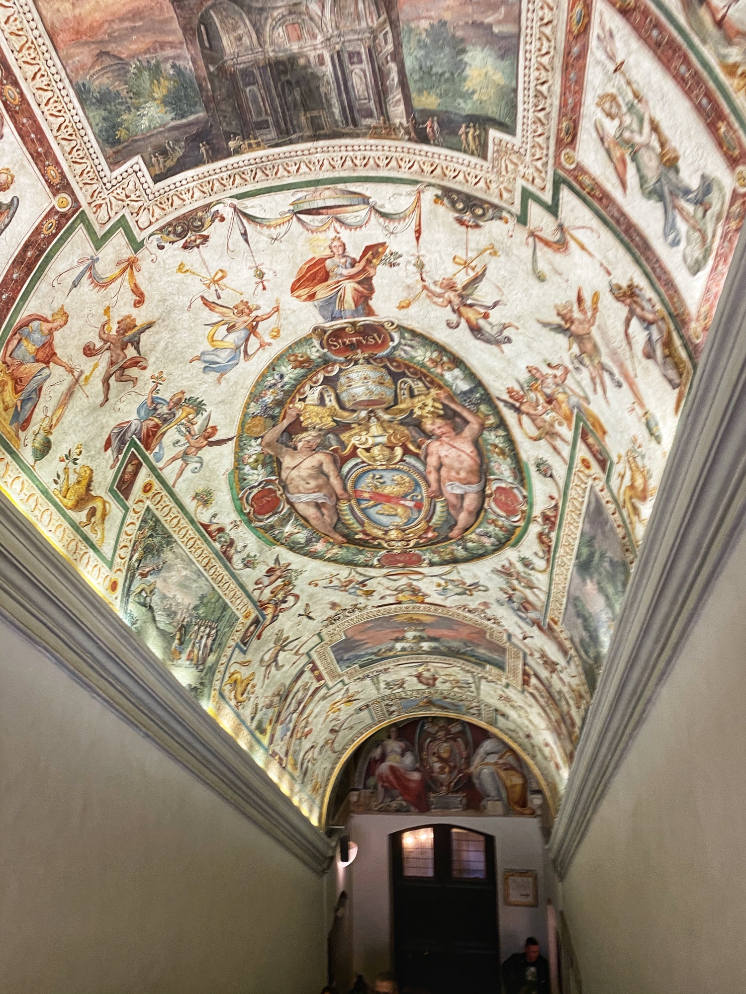 Inside the museum we saw beautiful works of art dating back from 1,000 B.C. all the way until today. Of course the most impressive of the sights was the Sistine Chapel, but before beholding that sight we enjoyed the Egyptian exhibits complete with exposed mummy, ancient Roman sculptures, and a spectacular hall filled with maps of Italy from wall to wall. Lil man and my brother loved the maps! Every single ceiling we saw was replete with impossible-to-absorb detail. Even the tiled floor was boggling. Unfortunately the amount of people pressing through the museum made it somewhat difficult to appreciate the grandeur of it entirely, but we did our best. Francesca pressed on, as we could finally enter the Sistine Chapel, so we did – and of course, no photos allowed!