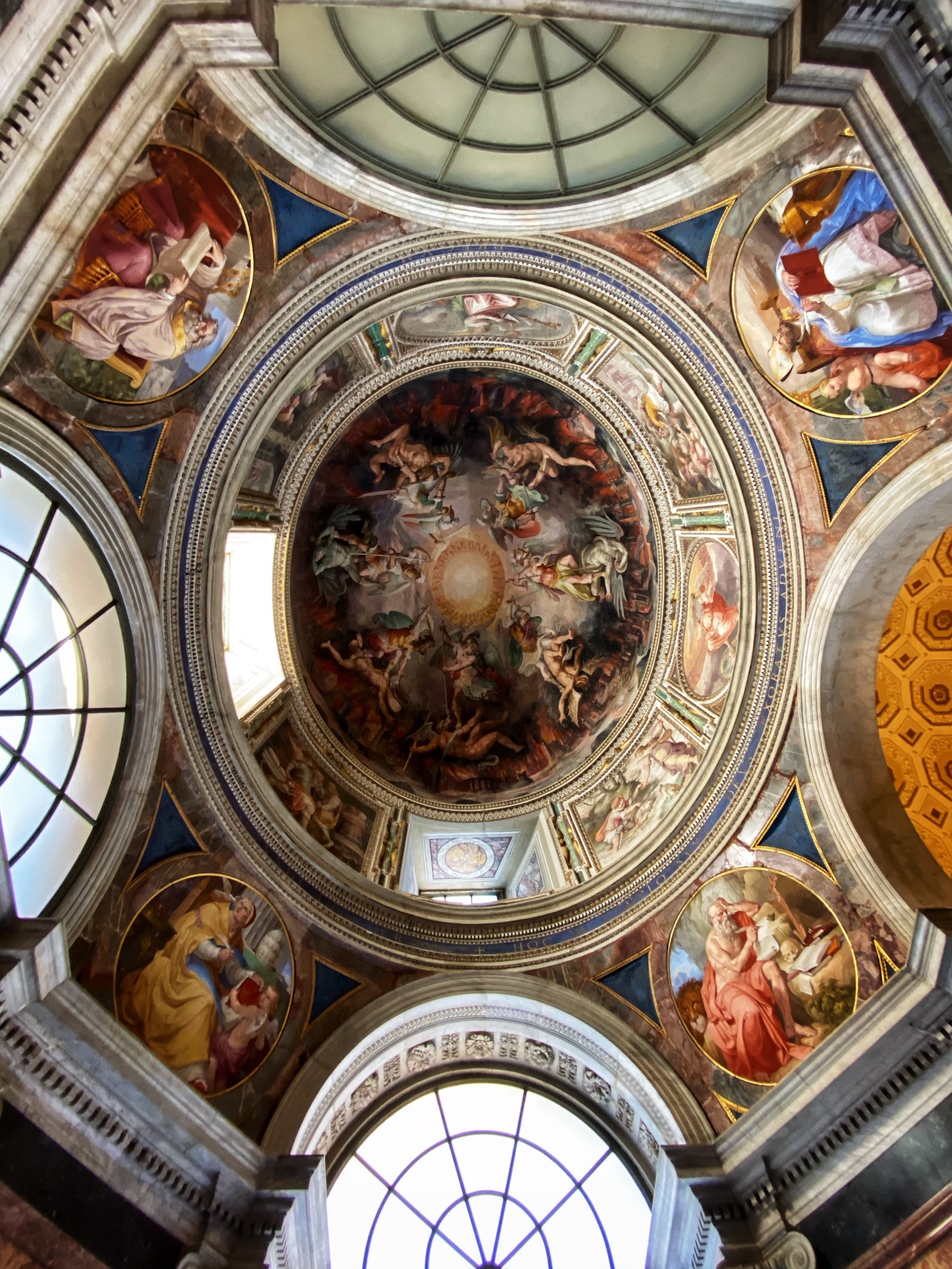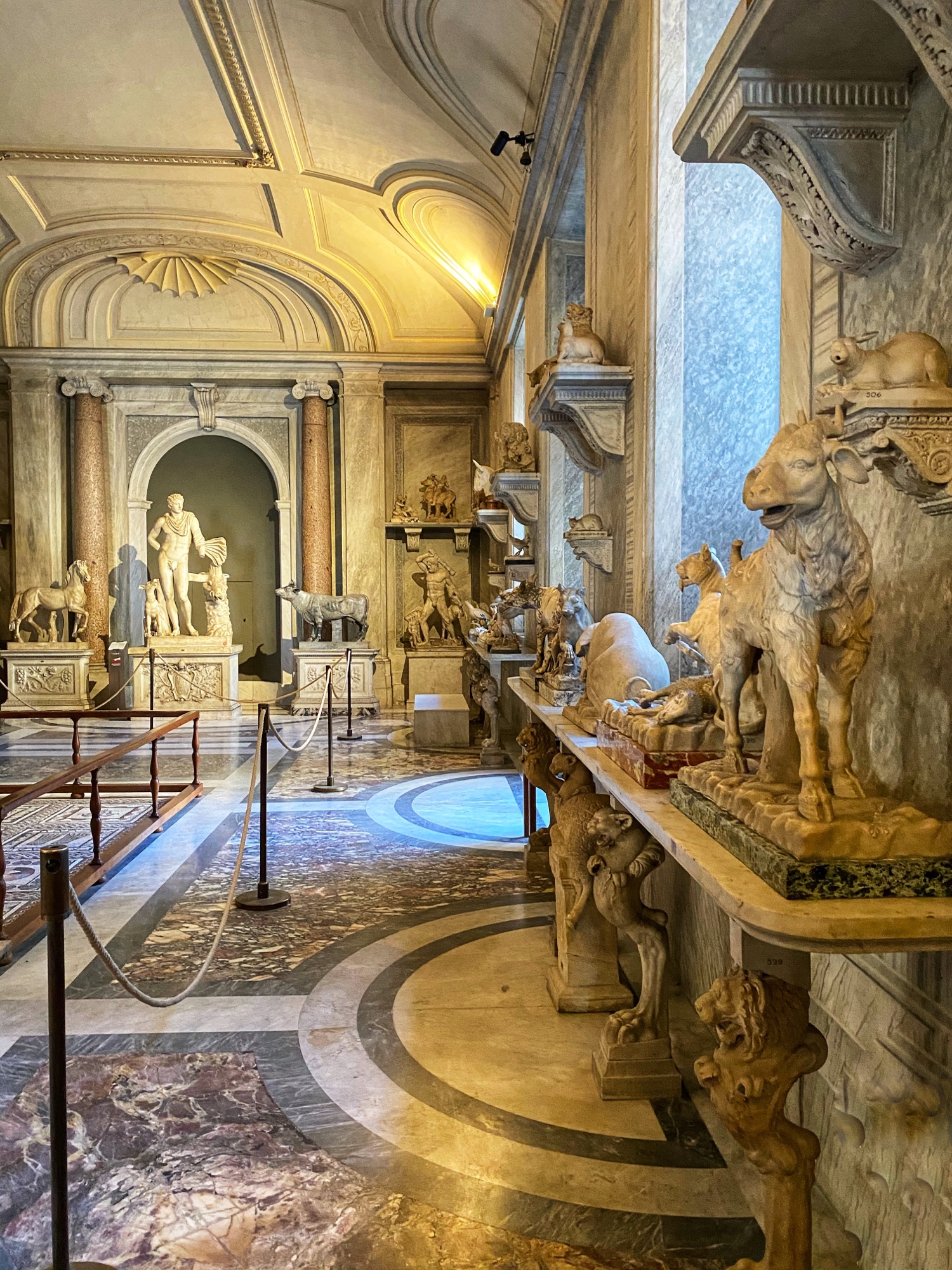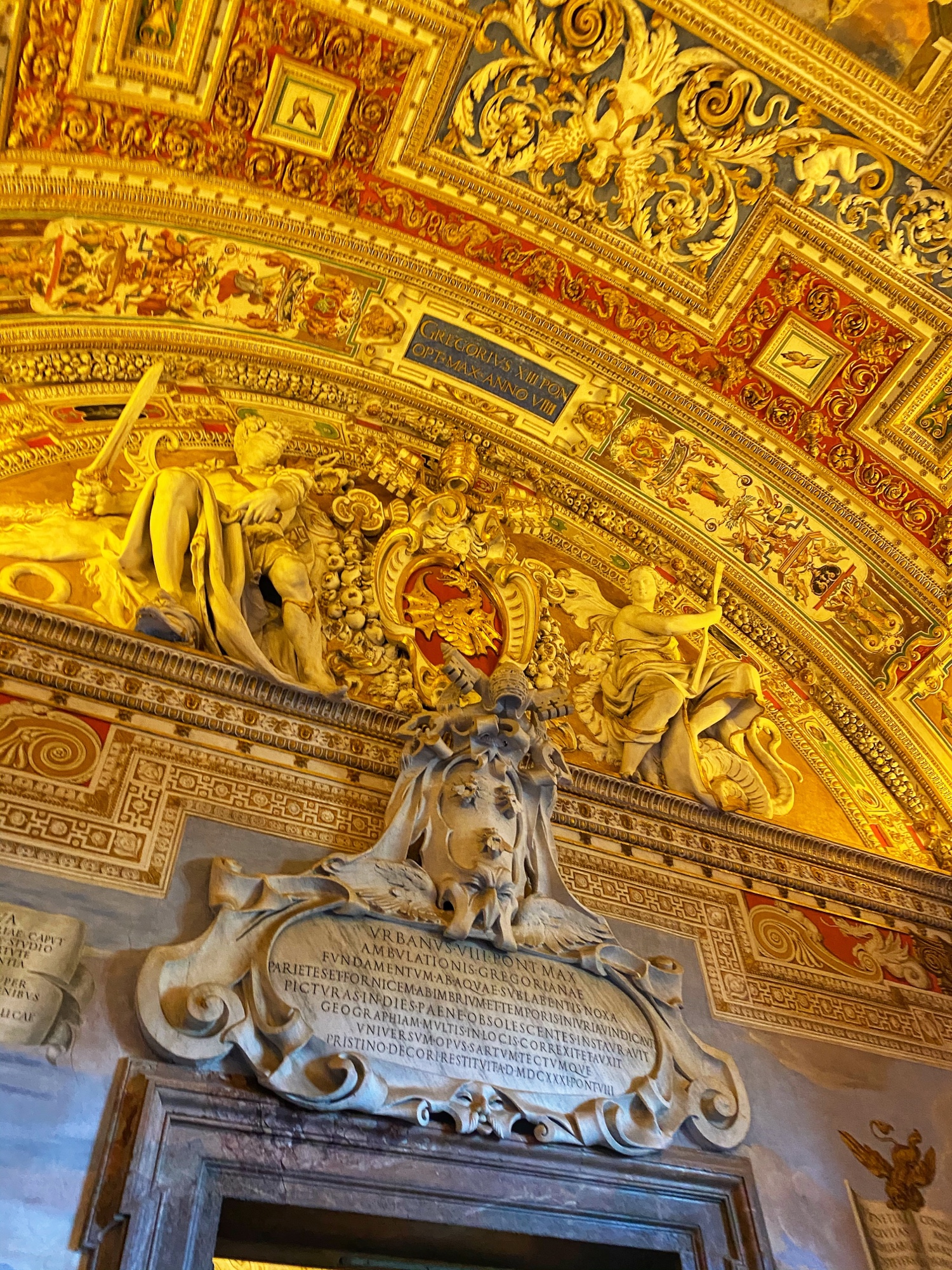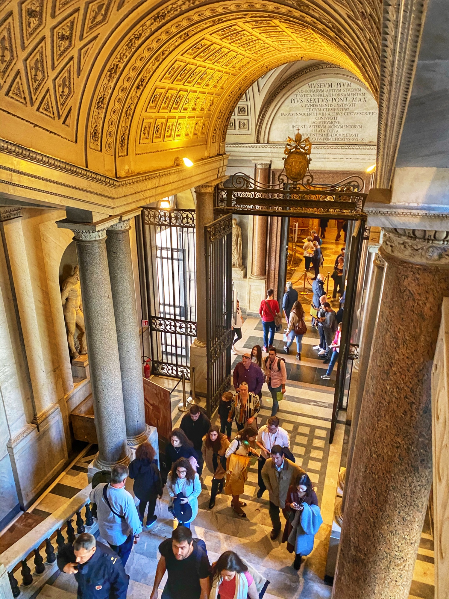 Inside the museum we saw beautiful works of art dating back from 1,000 B.C. all the way until today. Of course the most impressive of the sights was the Sistine Chapel, but before beholding that sight we enjoyed the Egyptian exhibits complete with exposed mummy, ancient Roman sculptures, and a spectacular hall filled with maps of Italy from wall to wall. Lil man and my brother loved the maps! Every single ceiling we saw was replete with impossible-to-absorb detail. Even the tiled floor was boggling. Unfortunately the amount of people pressing through the museum made it somewhat difficult to appreciate the grandeur of it entirely, but we did our best. Francesca pressed on, as we could finally enter the Sistine Chapel, so we did – and of course, no photos allowed!