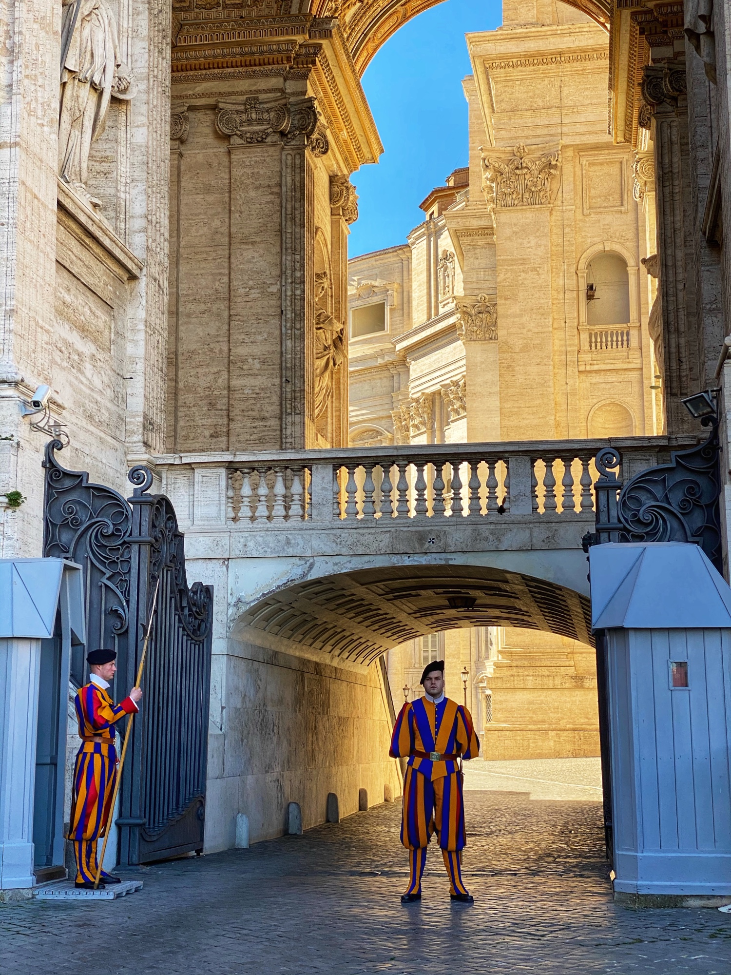 Inside the Basilica was fairly quiet. We were able to wander around and see Michelangelo’s Pieta, the great Alter of St. Peter, and my niece finally had a chance to say a veiled prayer in the holiest of cities. A truly special moment! We made our way to the lower level – the necropolis, or crypts – where we saw the tombs of pontiffs past. We had intended to go up into St. Peter’s dome as this was recommended by our tour guide, but our tummies were really rumbling and the kids were getting restless. Bro and cuz had plans to return to the Vatican the next day for the Pope’s public address, so they decided to climb the dome the next day. Our last stop was seeing the Swiss Guards outside the Vatican and a couple of them were friendly enough to let us snap a photo.
