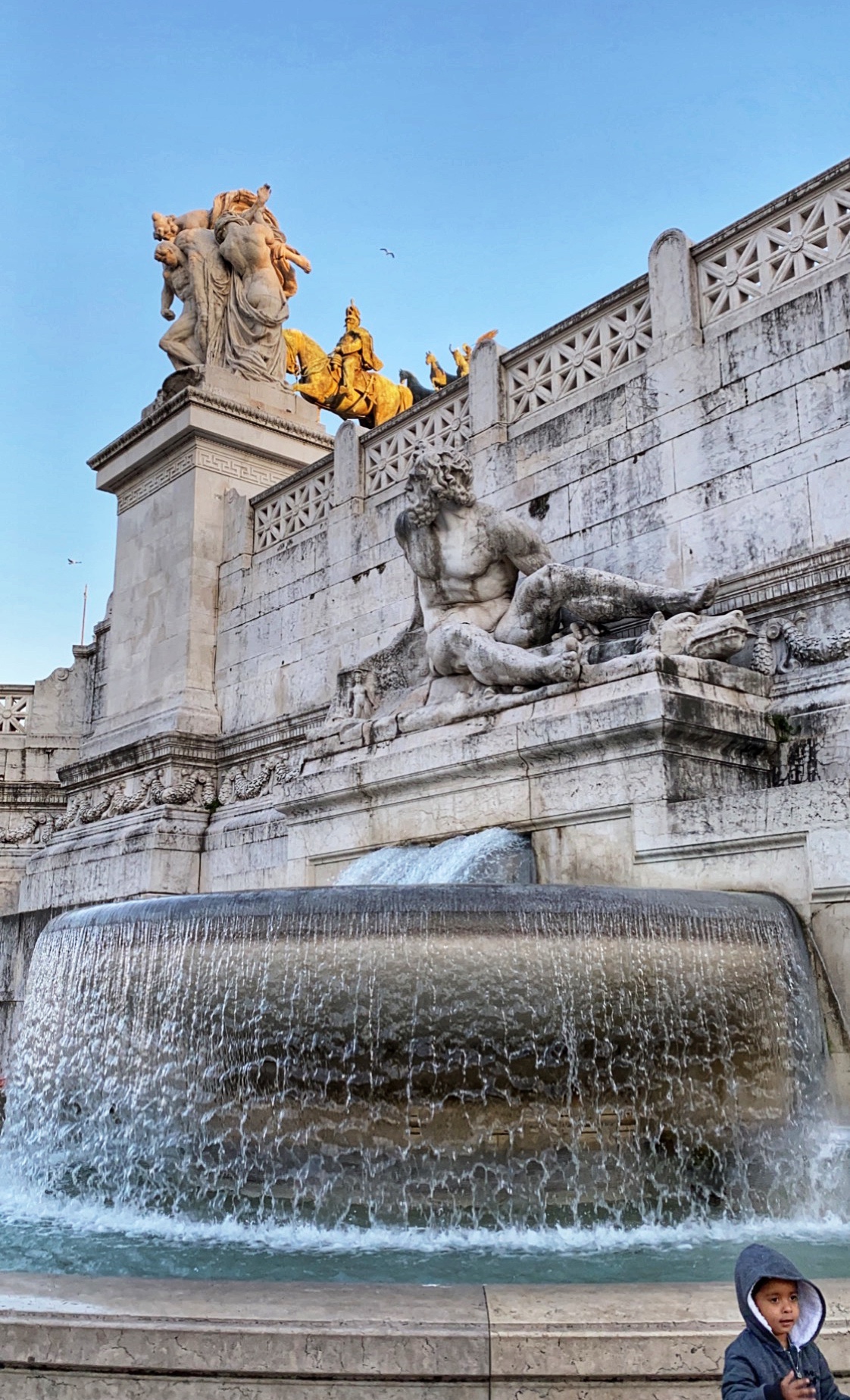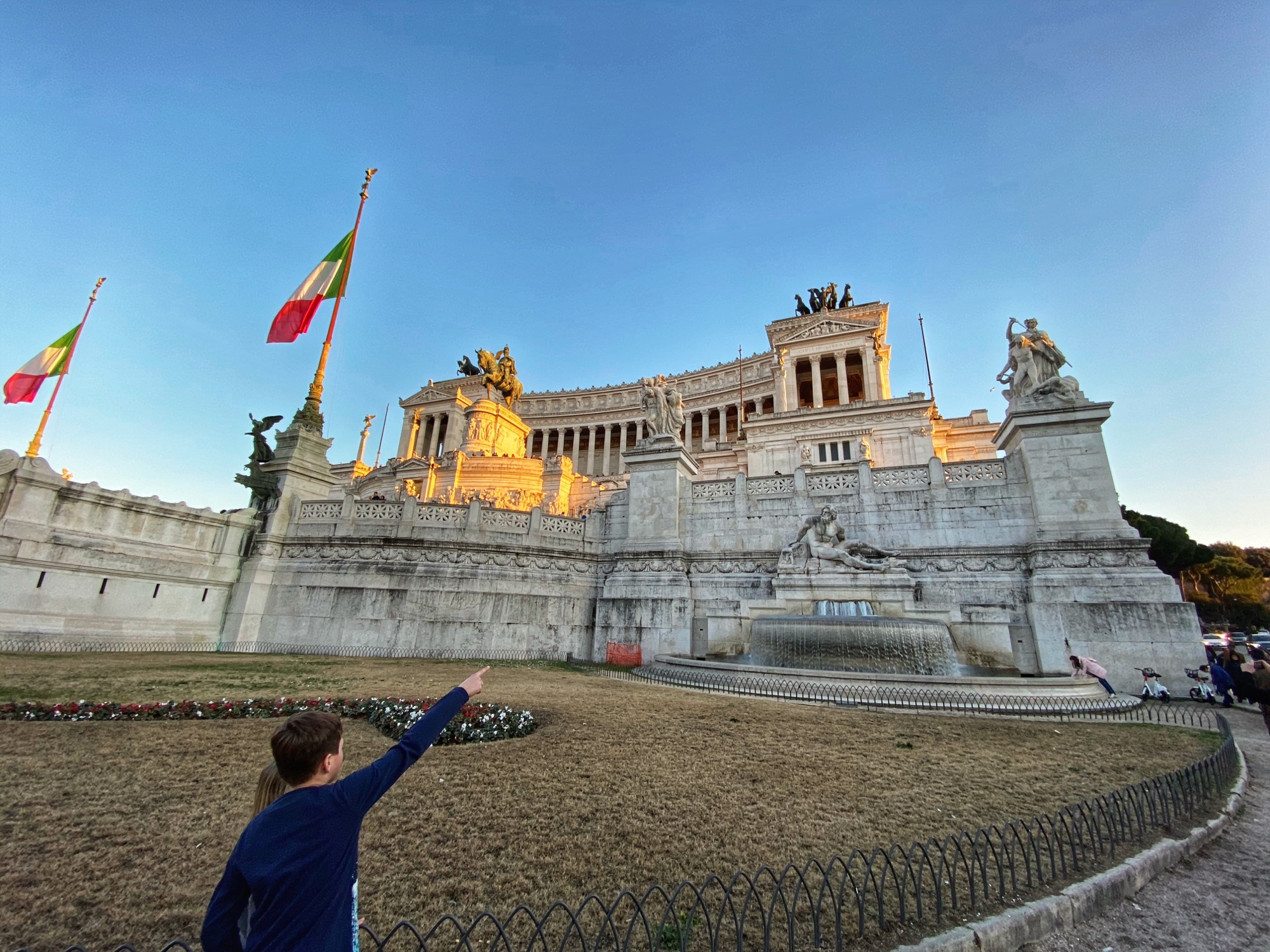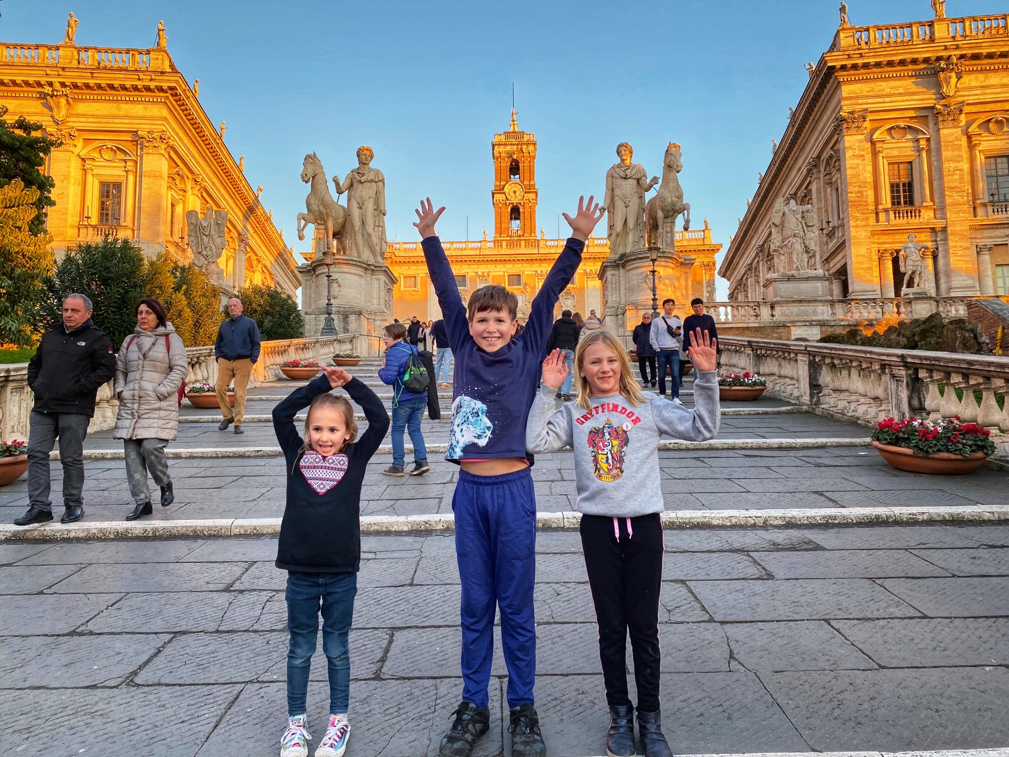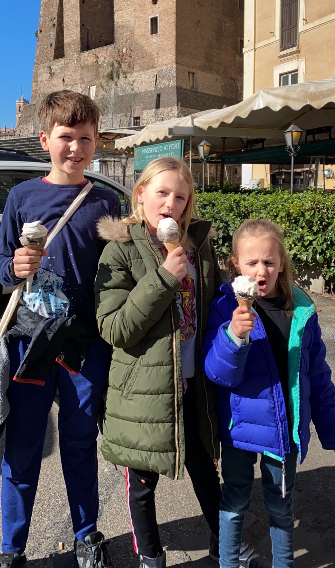 We walked from the Pantheon to a yummy quick-pasta eatery “Pasta-Eat Roma,” where we downed four types of pasta cooked in front of us (alfredo gnocchi, cheese ravioli, spaghetti Bolognese and pesto Fettuccini) before walking back to our apartment via the Imperial Road to the Colosseum and the glorious Piazza Venezia. Pictured below is the Alter of the Fatherland, as well as the Michelangelo-designed Campidoglio hilltop square. The kids were spent, but they rallied when I said we could have one more serving of Flor Gelato on our way back to the apartment. HA! It was so worth it! I recommend this place so highly – amazing quality gelato at a terrific price!