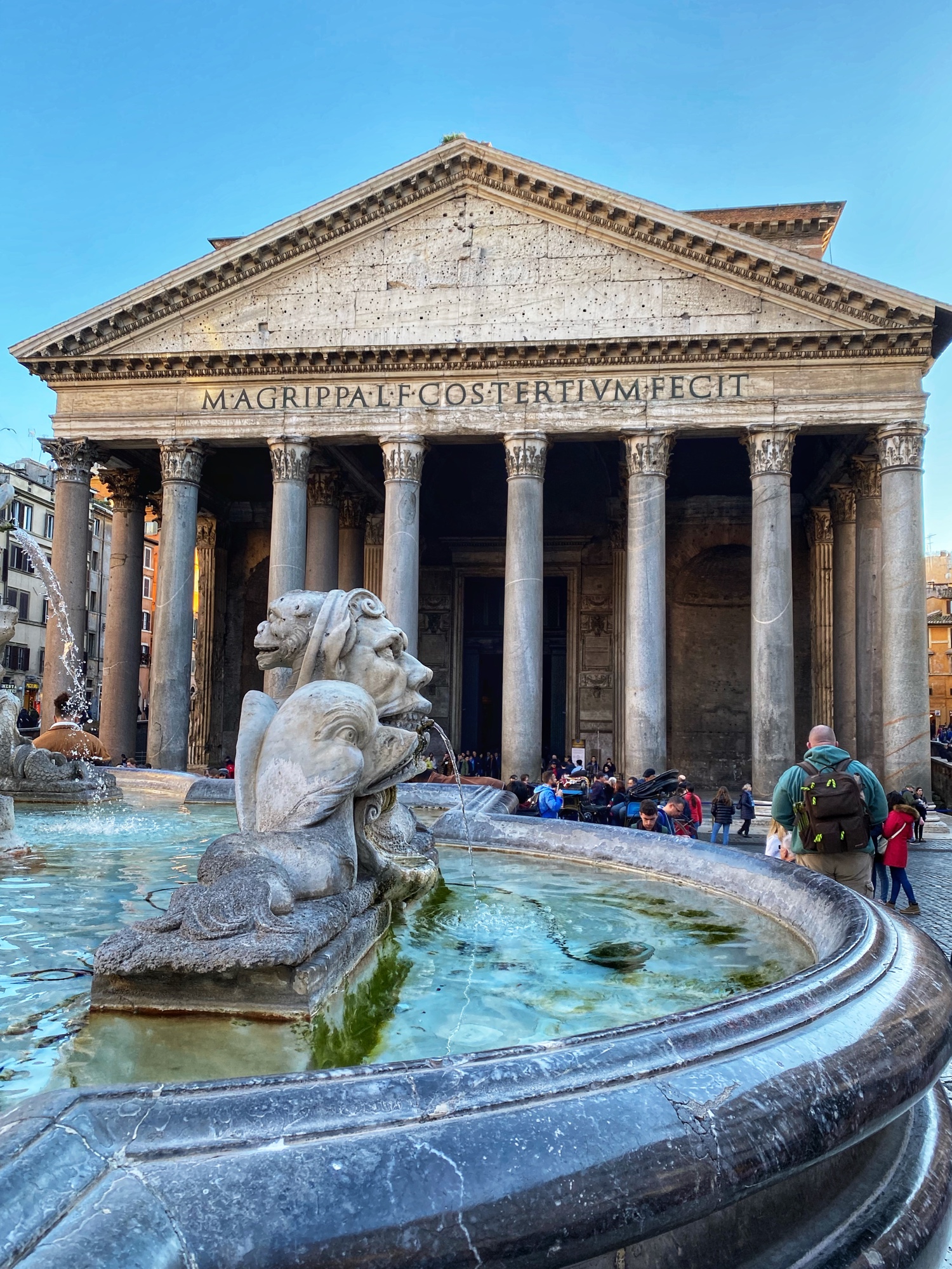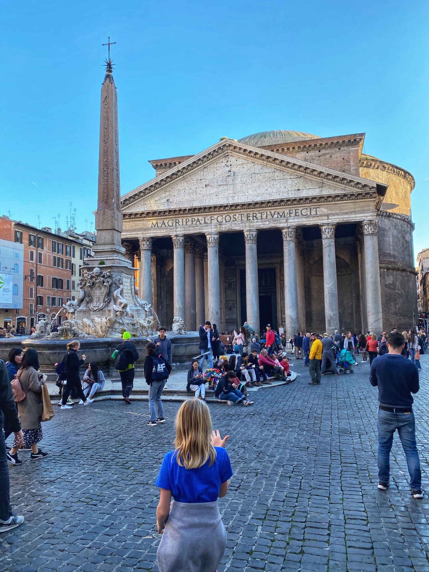 We walked a block or two over to the Pantheon and as we turned the corner into Piazza della Rotonda, I had to pick my jaw up off the ground. There is no question I wasn’t prepared for the Pantheon. I knew it was the worlds largest concrete dome, but the plaza with yet another beautiful fountain ornamenting an overwhelming entrance of columns blew me away. We learned that each column – quarried in Egypt – was 40 feet tall and weighed over 60 tonnes. It is impossible to get a feel for the magnitude of this place. Walking into the Pantheon (free of charge) felt like something out of a movie set. We were like ants, with the columns shooting into the sky in the “portico,” easing the gaze upwards in preparation for the final “wow” – the dome itself. It is impossible to take it all in with just normal human peripheral vision, and instead we found ourselves slowly gazing back and forth in wonder. The center of the dome is marked by a 30 diameter hole or “oculus” which is hard to comprehend given the relative height of the columns outside. This place is gargantuan on any scale, and it is certainly an inspiring sight. Inside we were able to see the tomb of the artist Raphael, who the kids remembered from good old Teenage Mutant Ninja Turtles. It was special, too, to see in person the work of architectural genius that inspired Thomas Jefferson to build his beautiful rotundas in America.