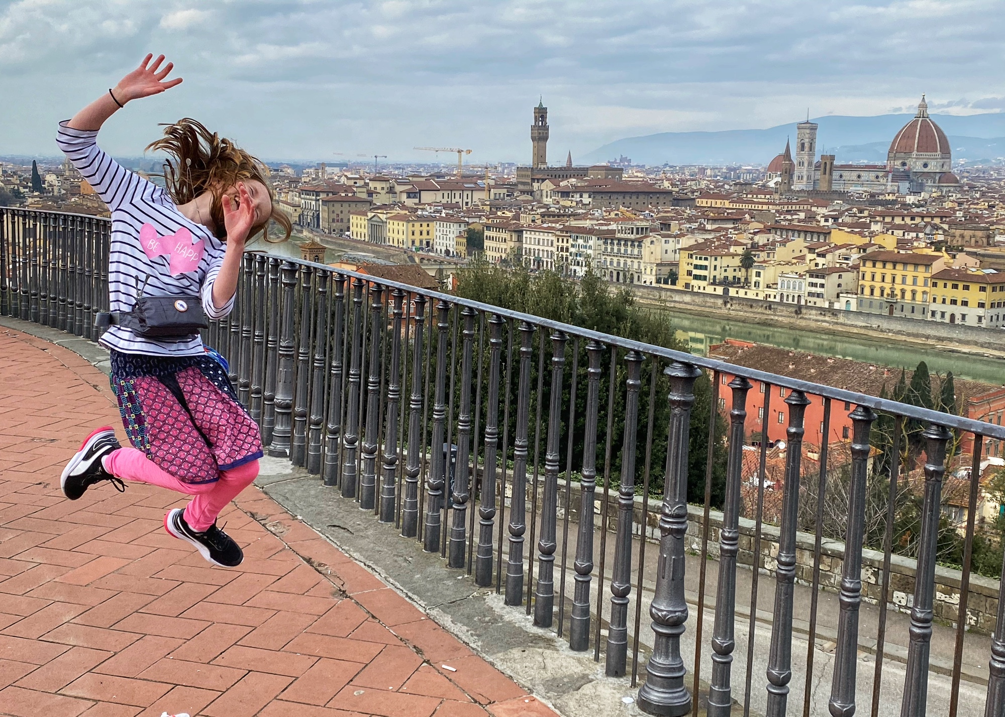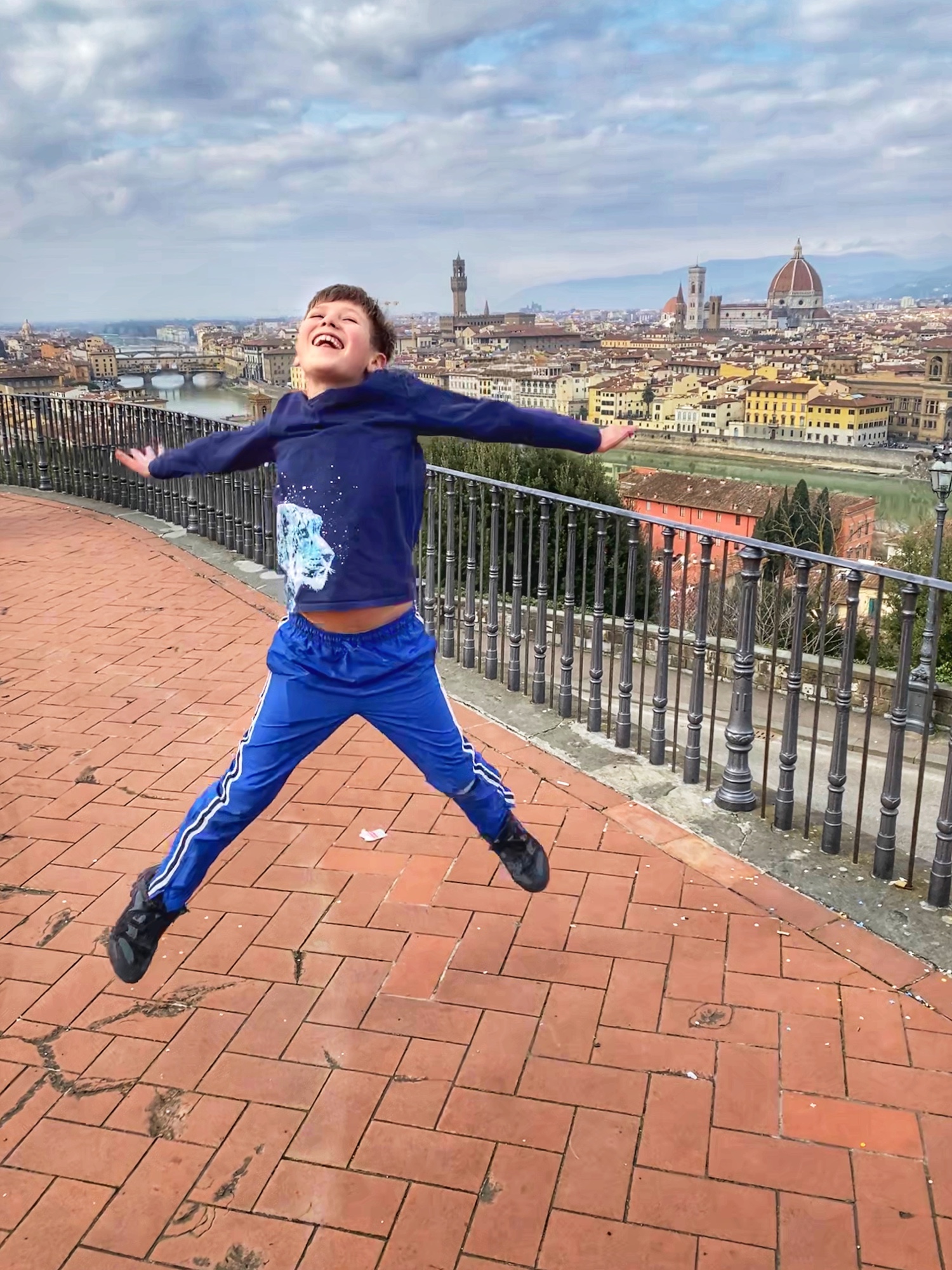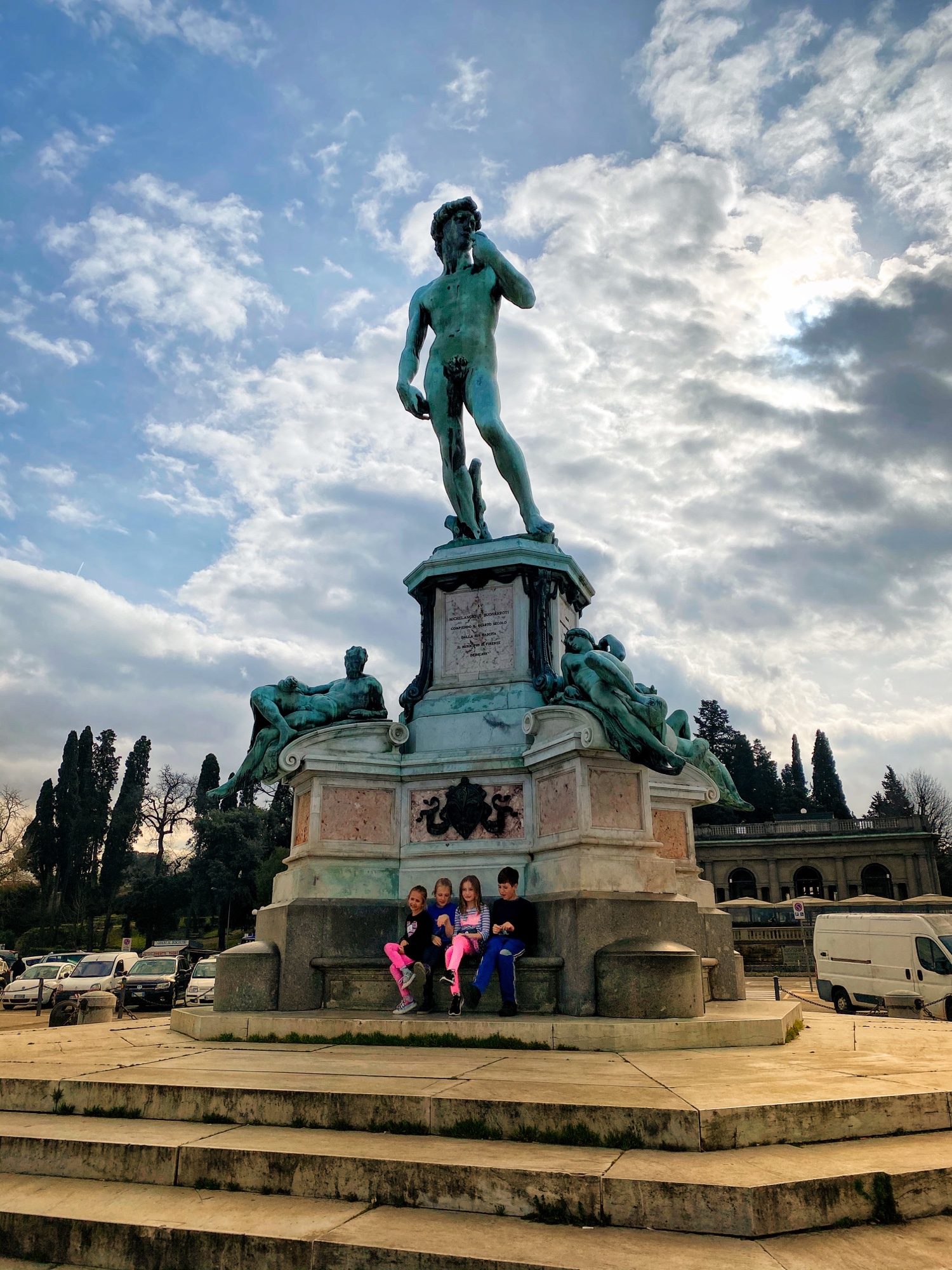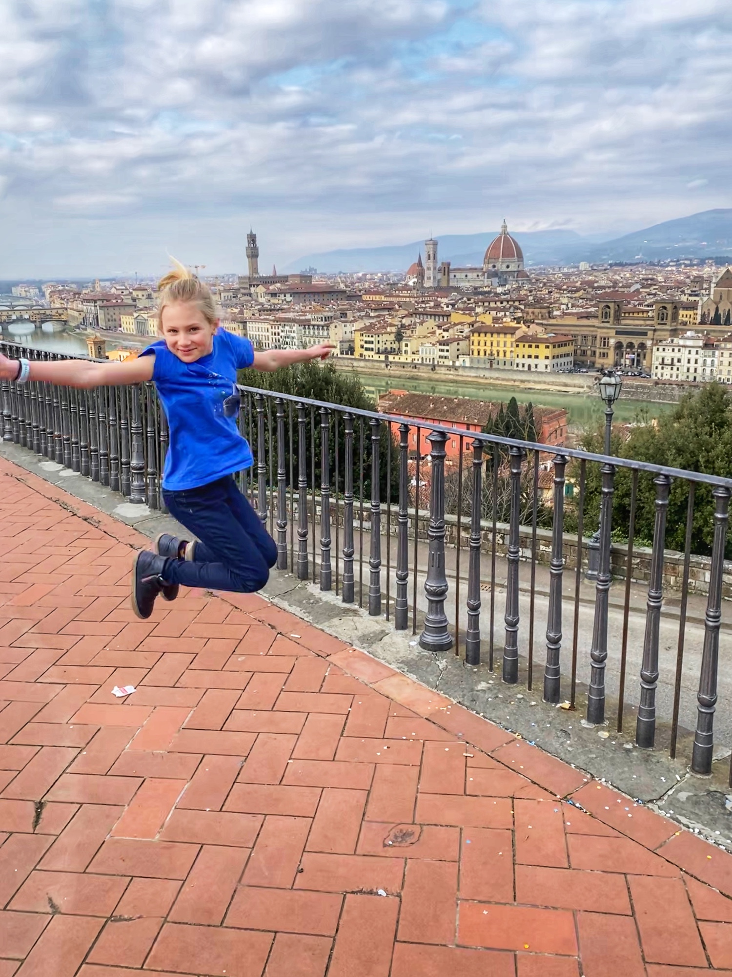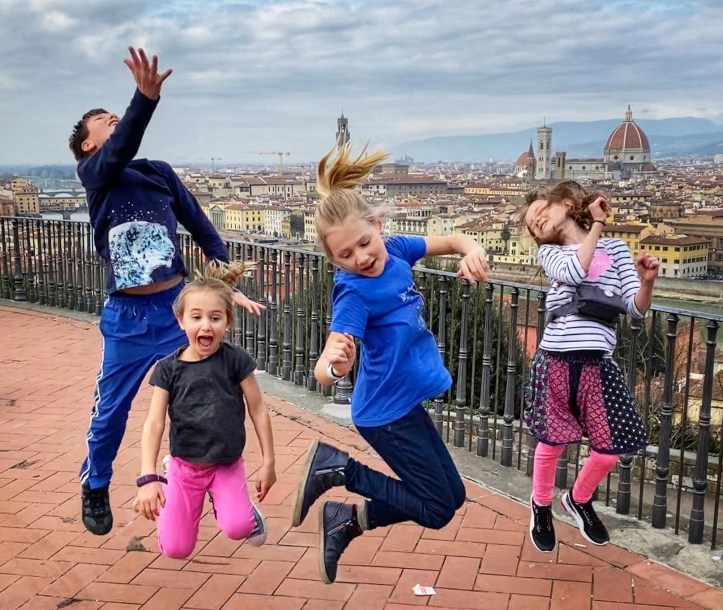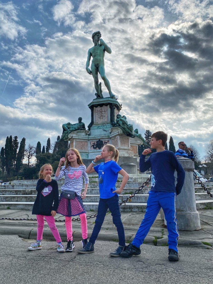 What would a seven hour road trip be without a few key stops? Another bucketlist item for Bro was seeing Michelangelo’s David, but the Galleria dell’Accademia was closed the day we passed through, so we had to settle for the outside bronze version of the David in the Piazzale Michelangelo. It turned out to be a perfect pitstop, where the kids could run around and giggle at the David, cuz could dance to a fiddler, big bro could pick up a marionette souvenir, and we got a perfect view overlooking Florence. Middle one made a friend with a mini poodle and little one showed us how to nail the perfect “jump photo” on the terrace overlooking the split city of Florence and the Arno River. What a gorgeous day!