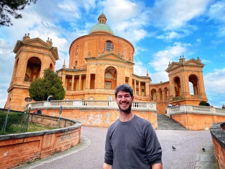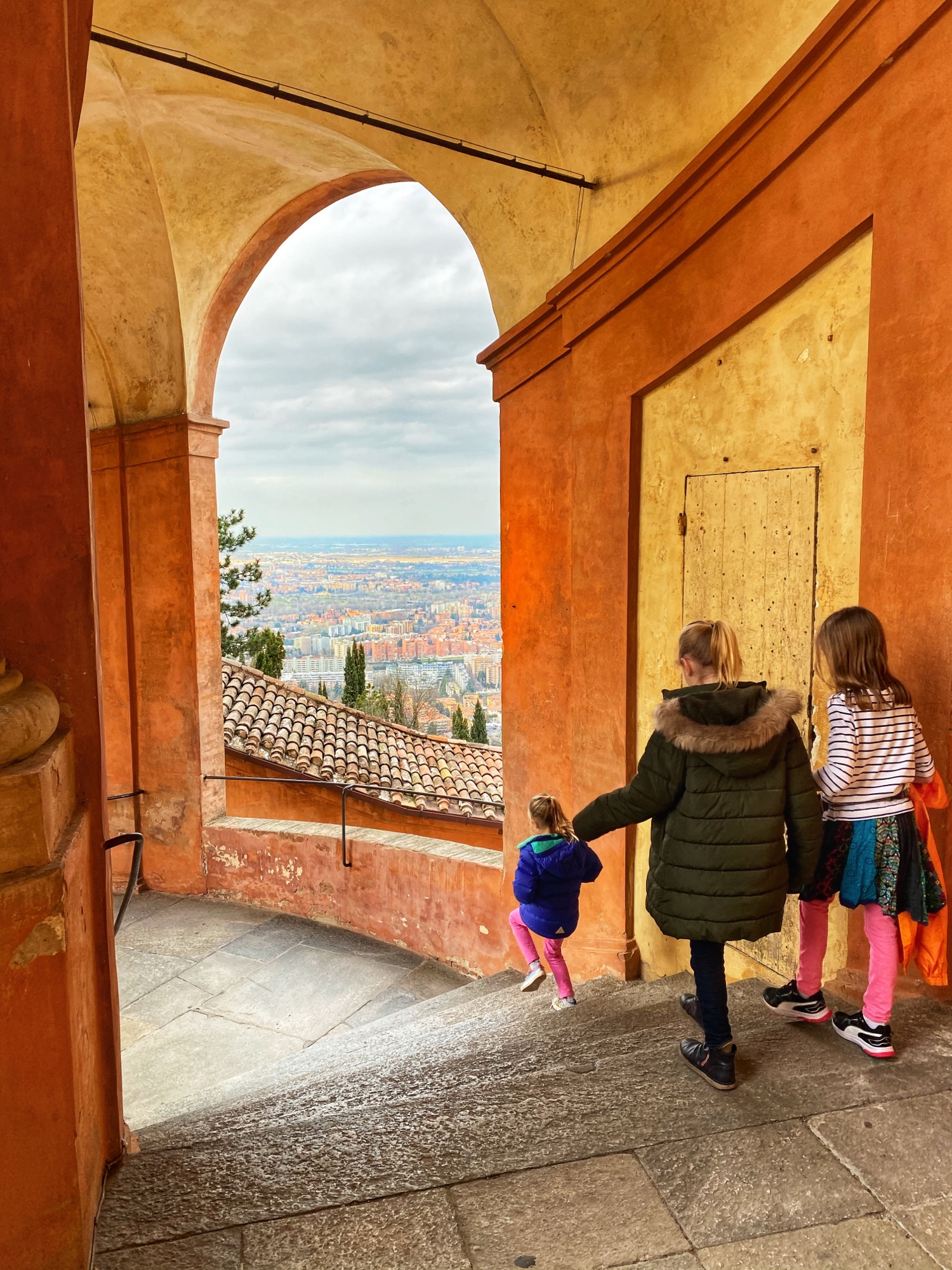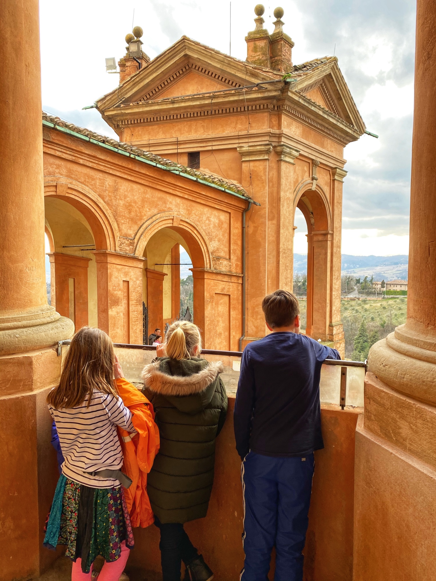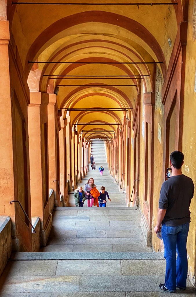 Bologna was an unplanned stop as we realized it was directly on our route. I knew of a worthwhile hilltop pitstop called Sanctuary of the Madonna di San Luca, and since visibility was good that day, we went for it. The city of Bologna boasts the world’s longest network of porticos, so it was especially fun to bring the kids here and show them the start of the portico system at the Sanctuary on top of the hill. I visited here last year on a tour through northern Italy with my friend (see blog here) but we weren’t able to climb to the top of the dome – only the Sanctuary. This time we enjoyed the views from the large dome, looking out over the Italian countryside in one direction and over the foodie city of Bologna in the other direction.